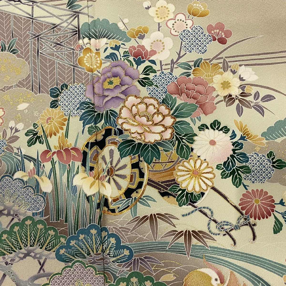30%OFF 色留袖 身丈159.5cm 裄丈65cm M 袷 松竹梅 菊 金糸 金銀彩 灰緑 正絹 秀品 一つ紋 K30