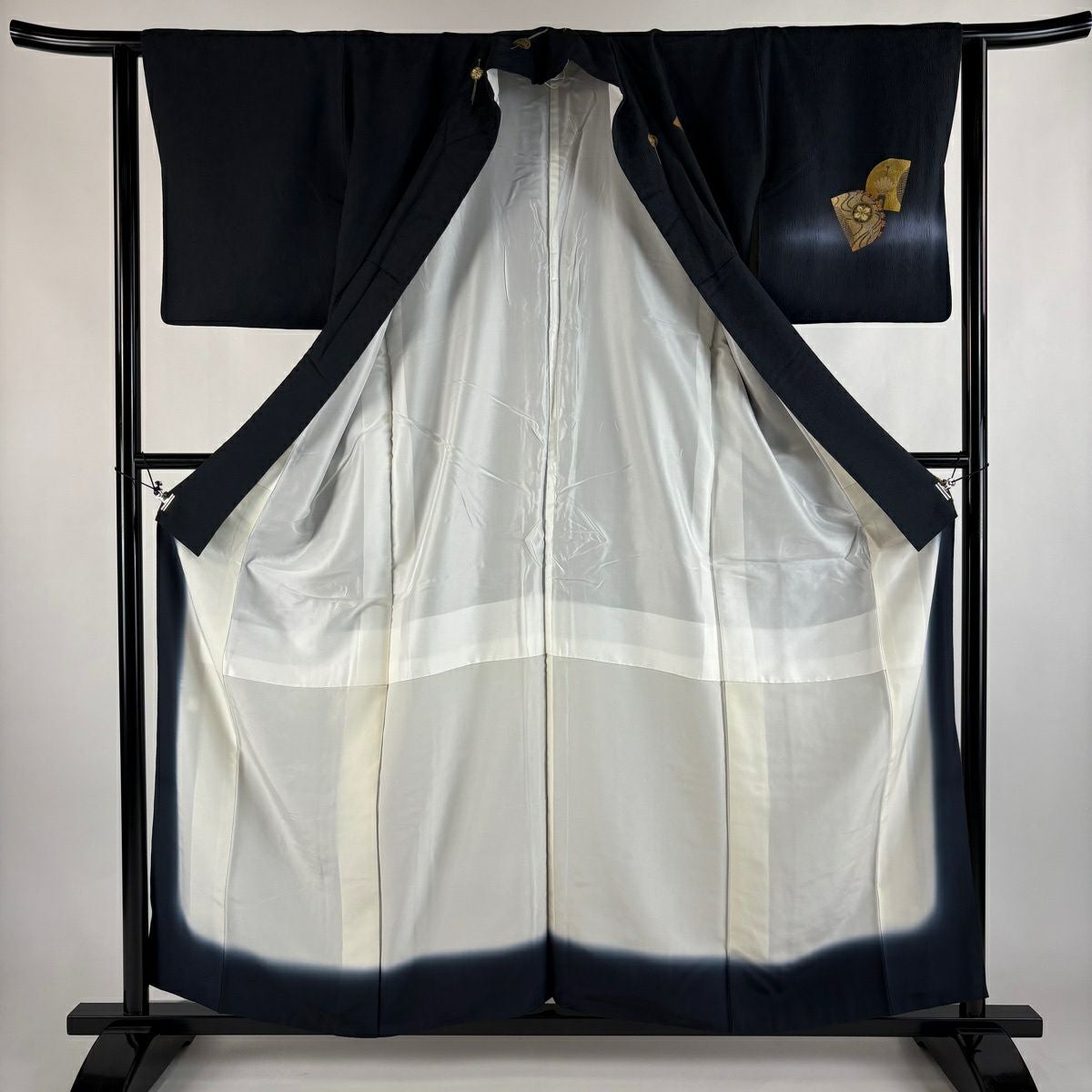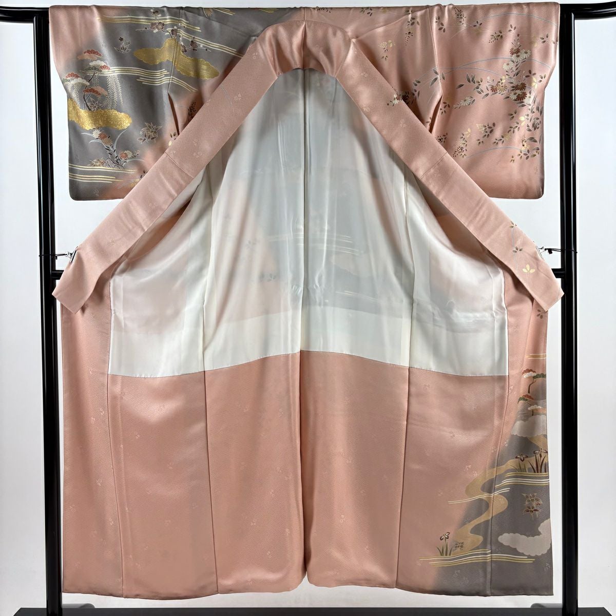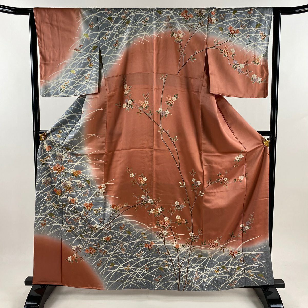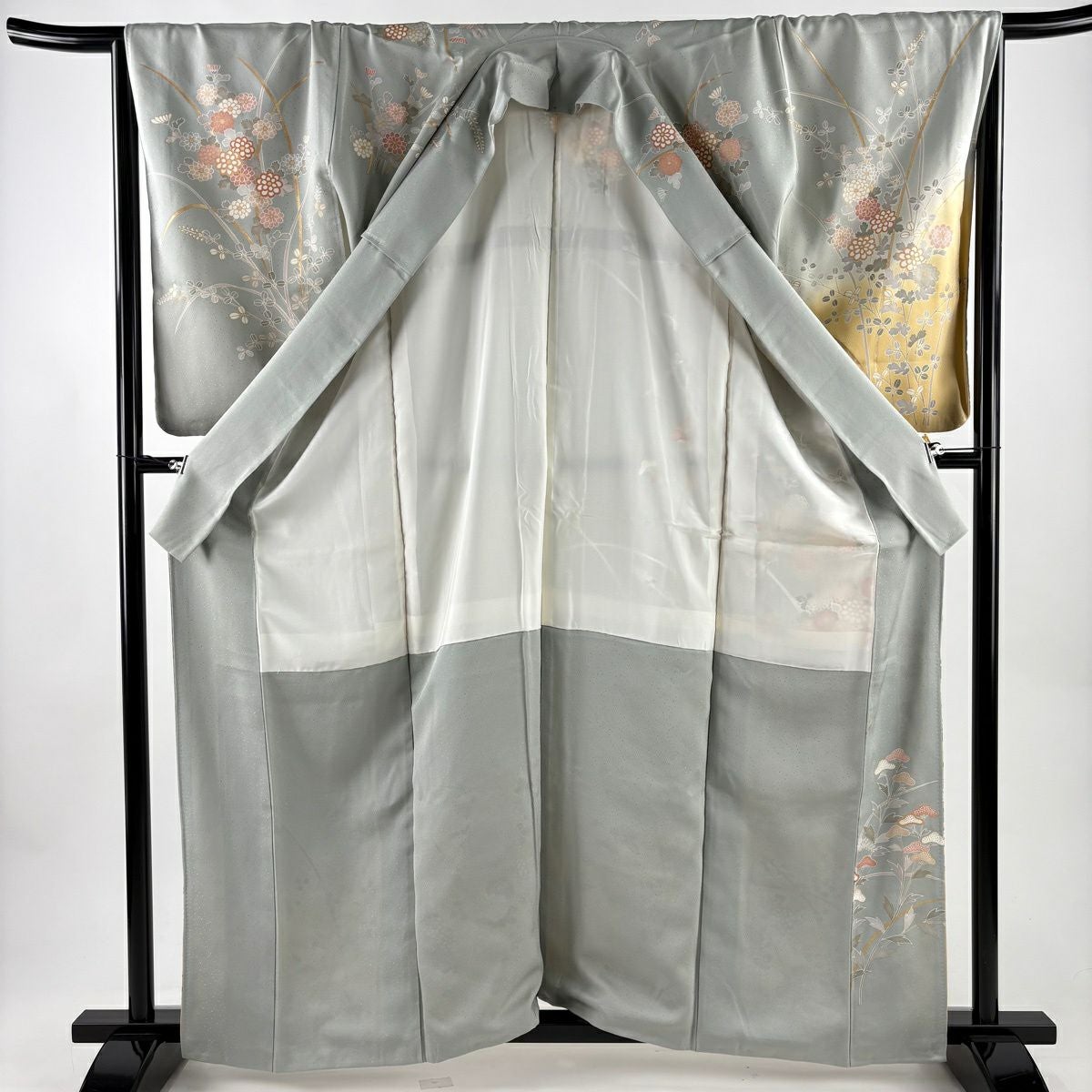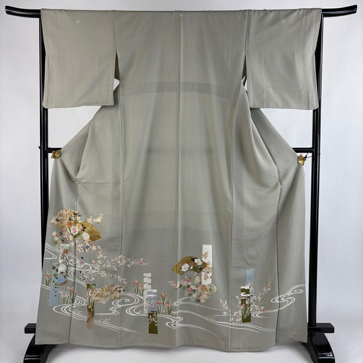 30%OFF 色留袖 身丈167.5cm 裄丈66cm M 袷 扇面 草花 金糸 金彩 灰色 正絹 秀品 三つ紋 K30