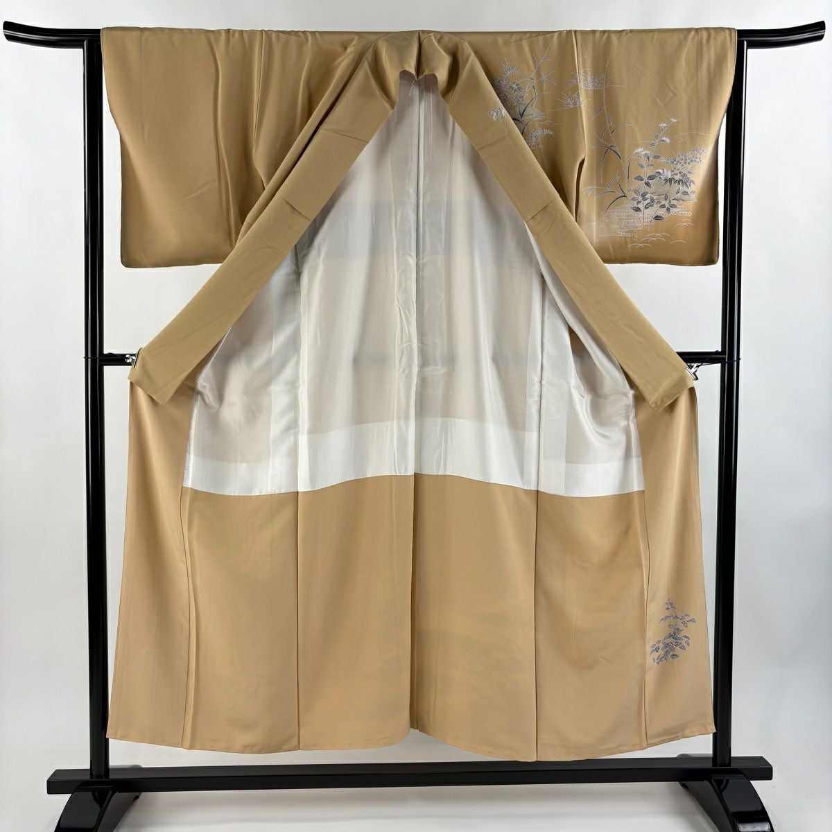 30%OFF 【美品】 訪問着 身丈150.5cm 裄丈62.5cm S 袷 草花 流水 刺繍 薄茶色 正絹 秀品 K30