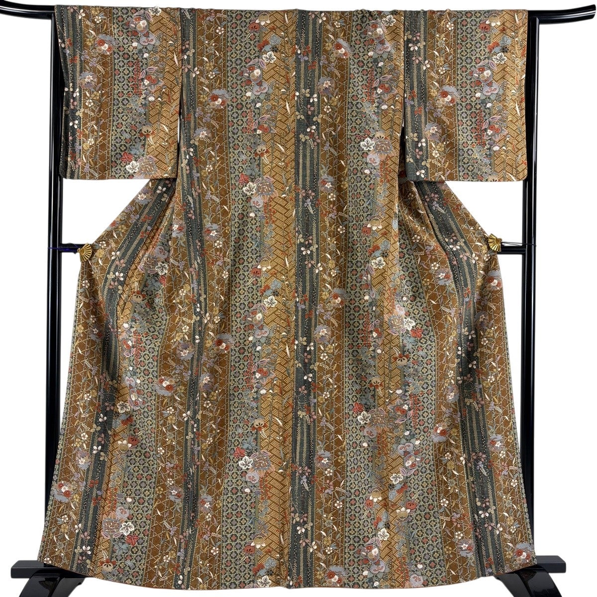 付下げ 身丈158.5cm 裄丈64cm M 袷 縦縞 桜 金銀彩 刺繍 茶色 正絹 秀品