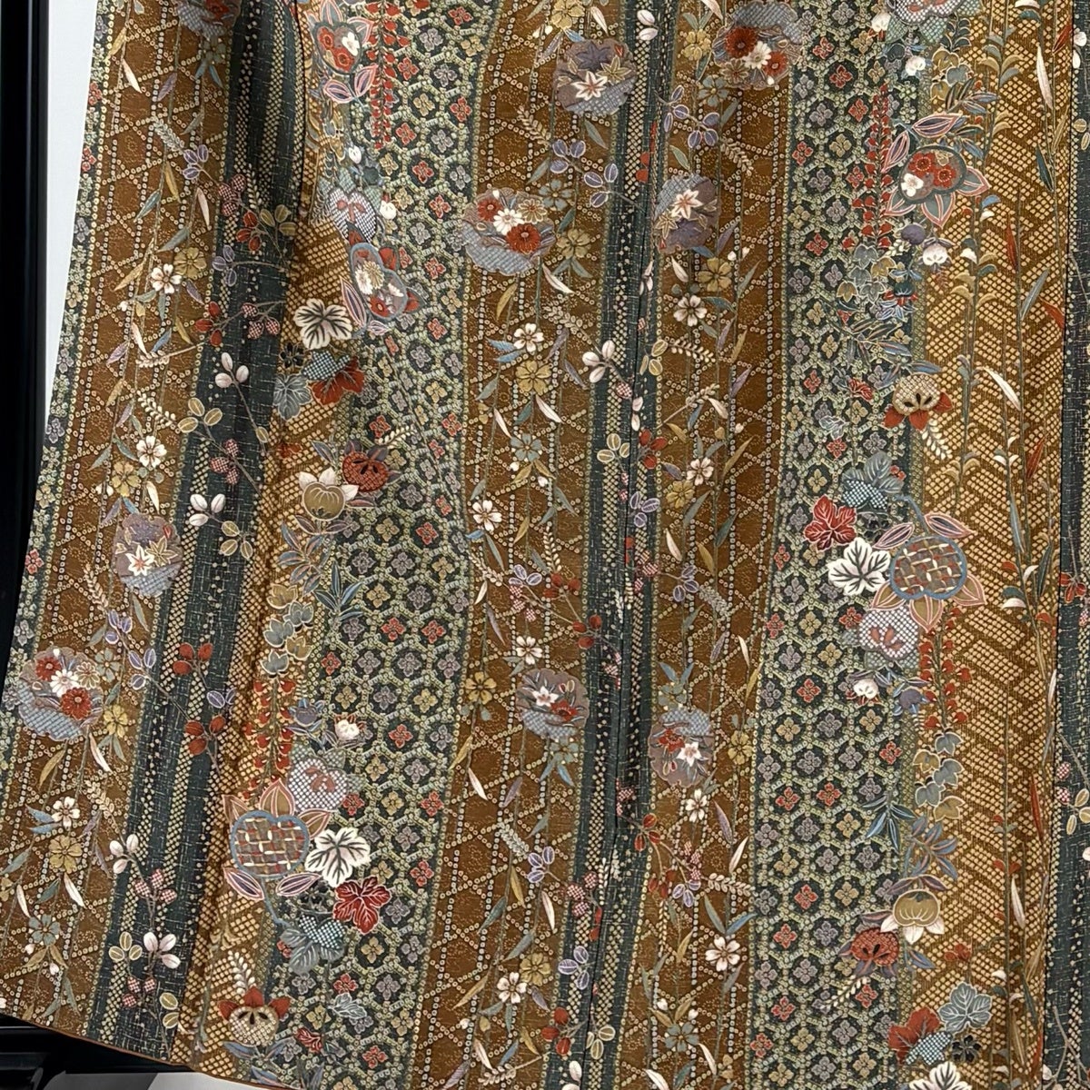 訪問着 身丈161.5cm 裄丈65cm M 袷 蝶 牡丹 金彩 ぼかし 茶緑色 正絹 秀品
