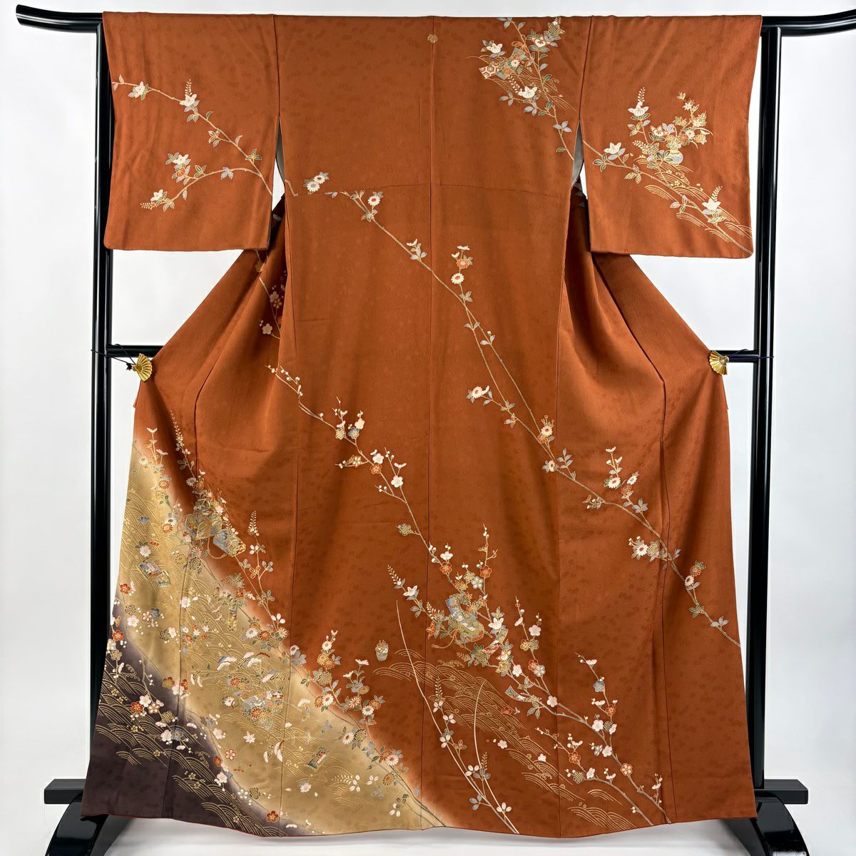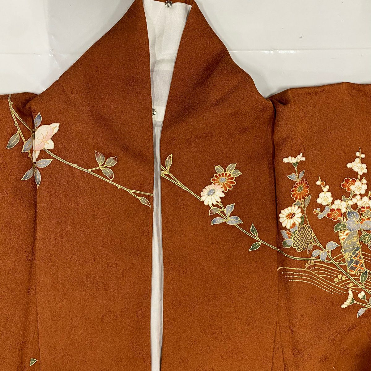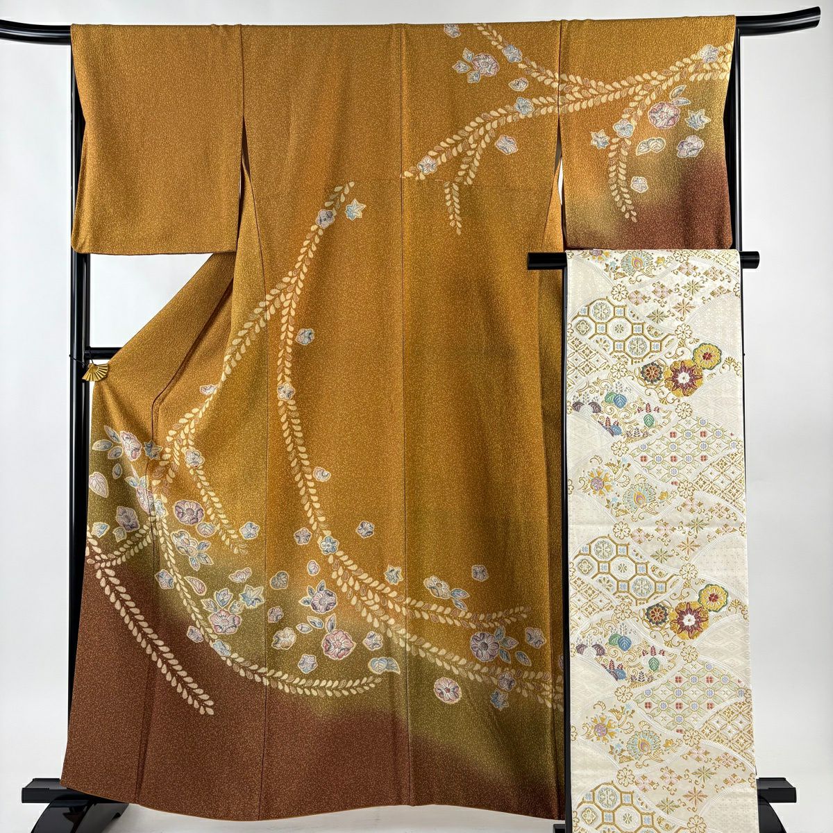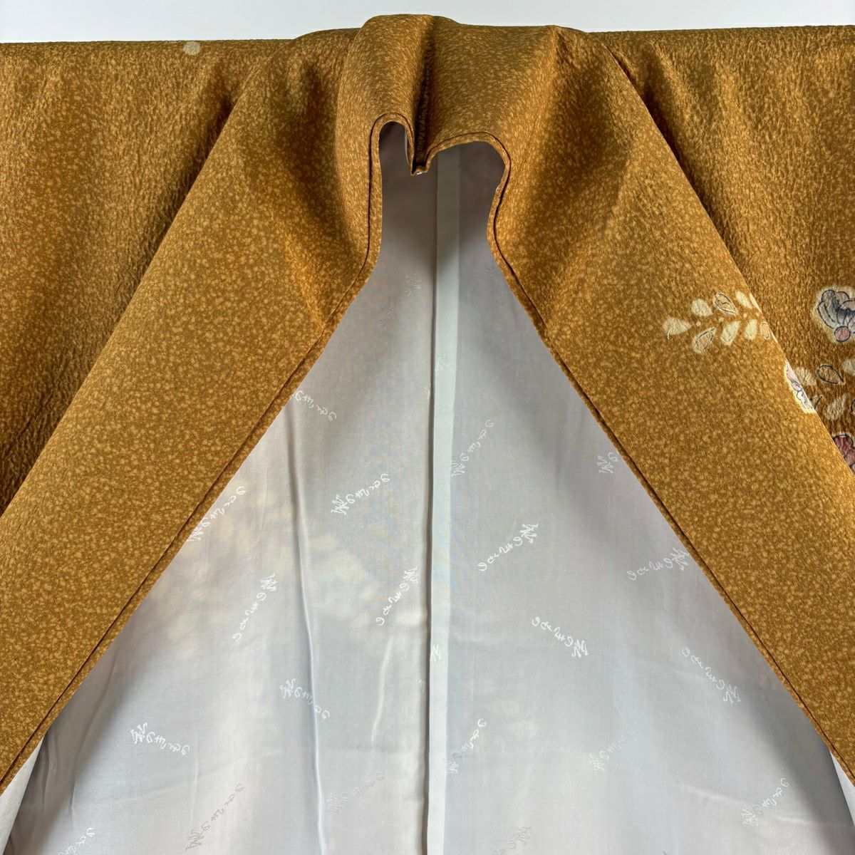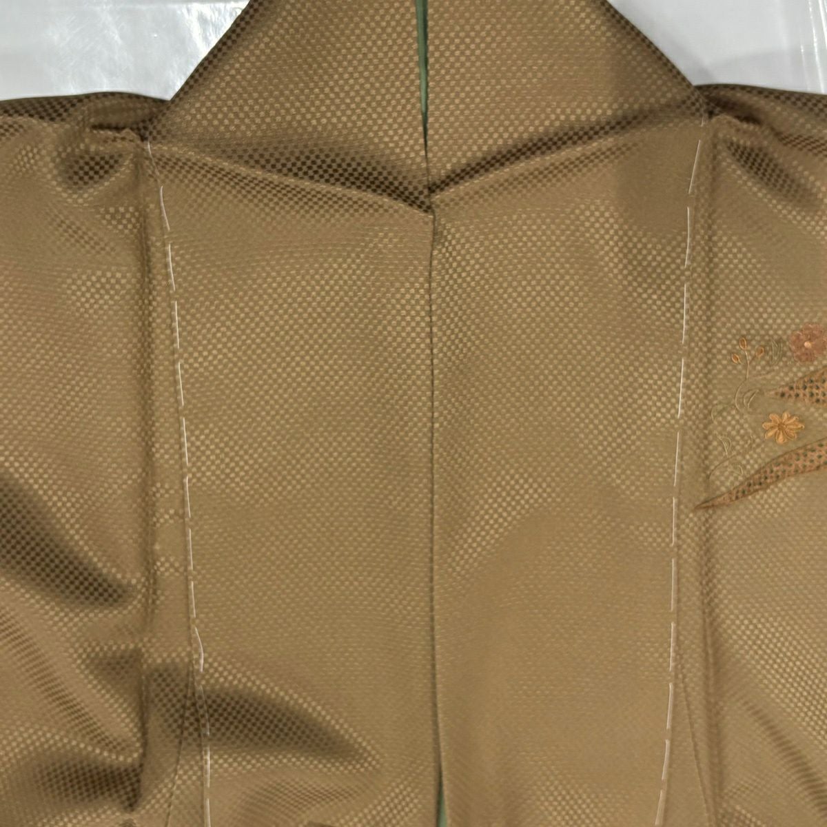 30%OFF 付下げ 身丈159cm 裄丈65cm M 袷 組紐 琴 刺繍 ぼかし 黄土色 正絹 秀品 一つ紋 K30