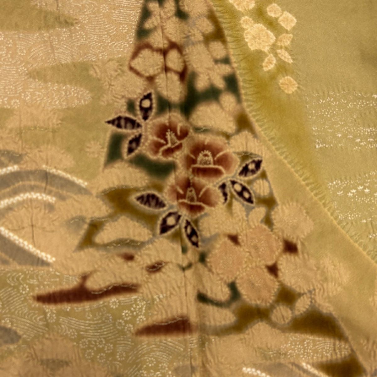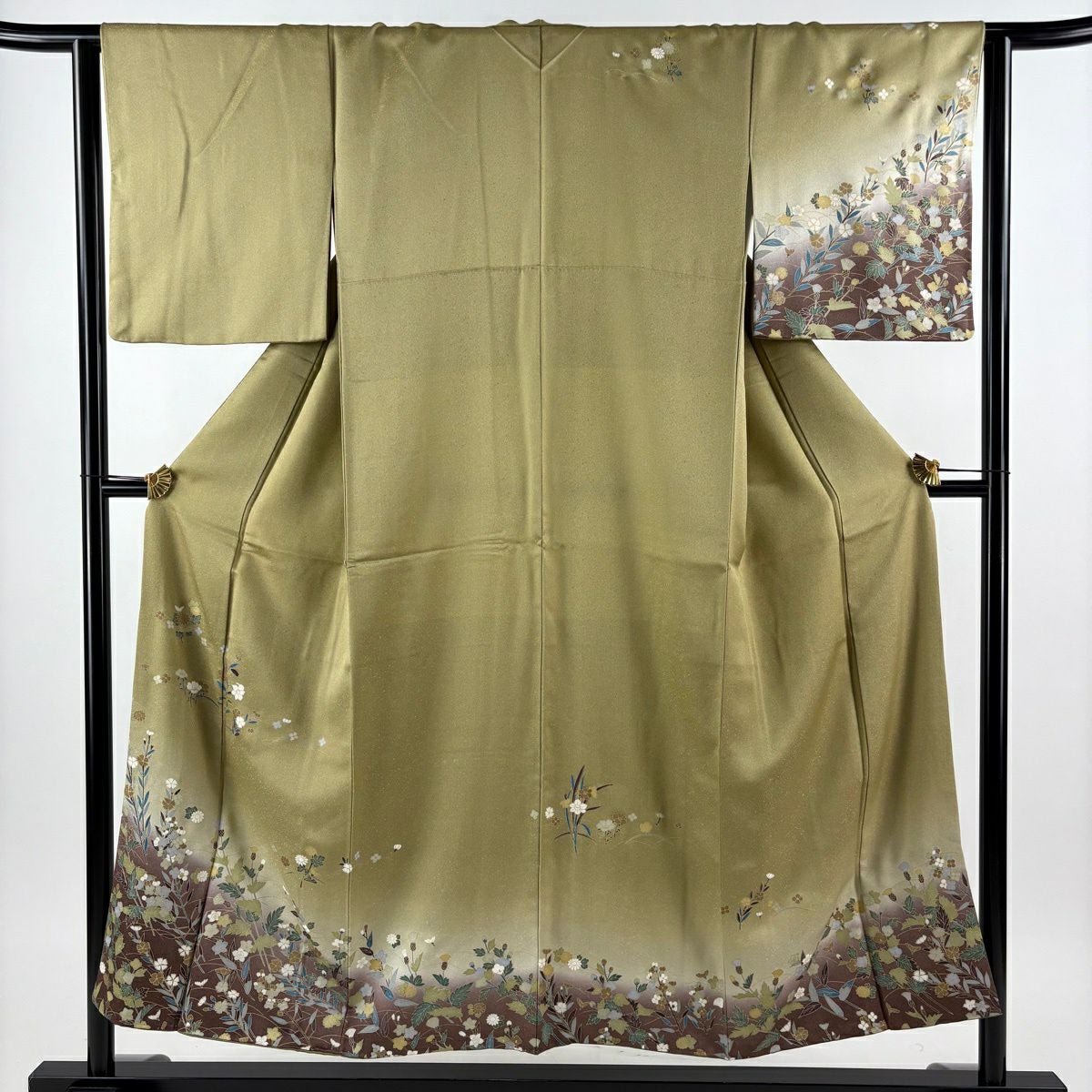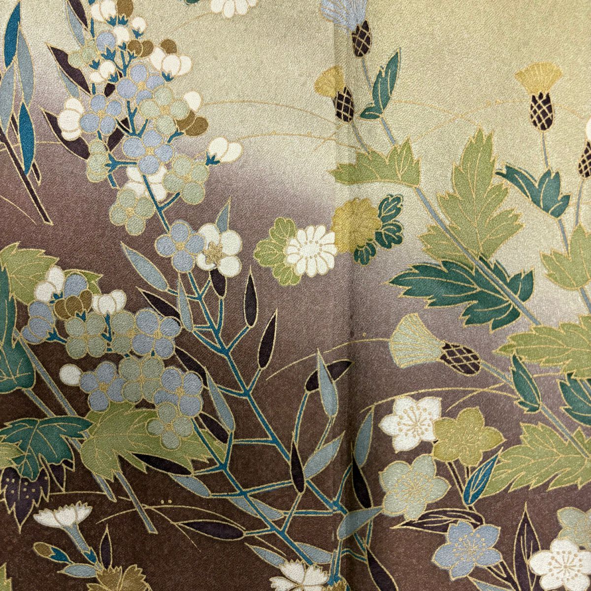 30%OFF 訪問着 身丈161.5cm 裄丈64.5cm M 袷 草花 流水 絞り 染め分け 茶緑色 正絹 秀品 K30