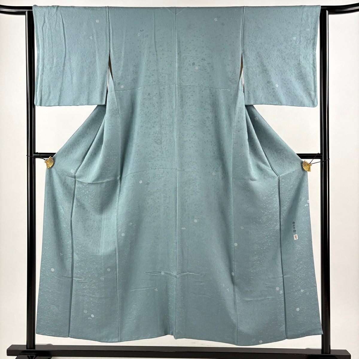 30%OFF 小紋 身丈152cm 裄丈62.5cm S 袷 柿本市郎 落款あり 花 地紋 青灰色 正絹 秀品 K30