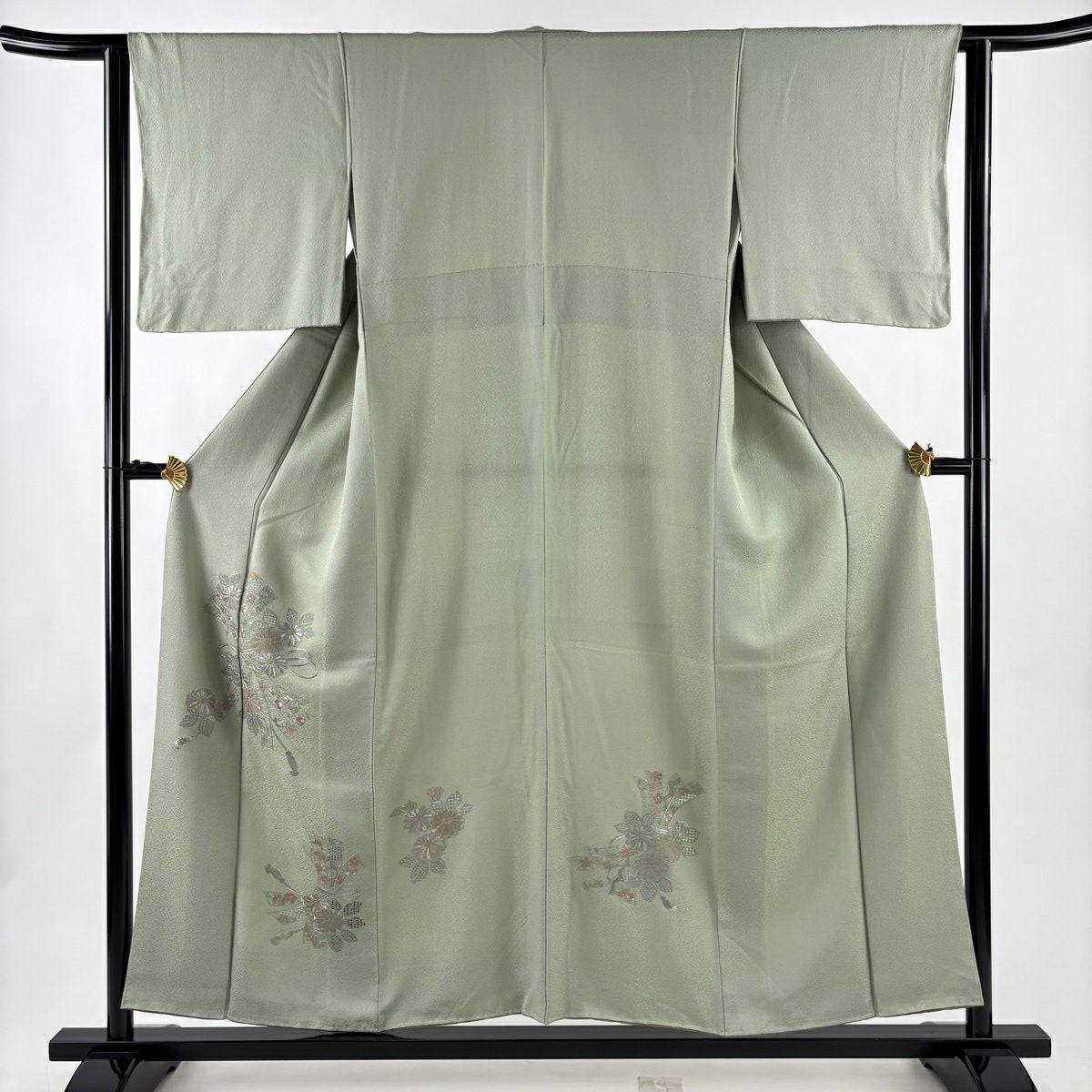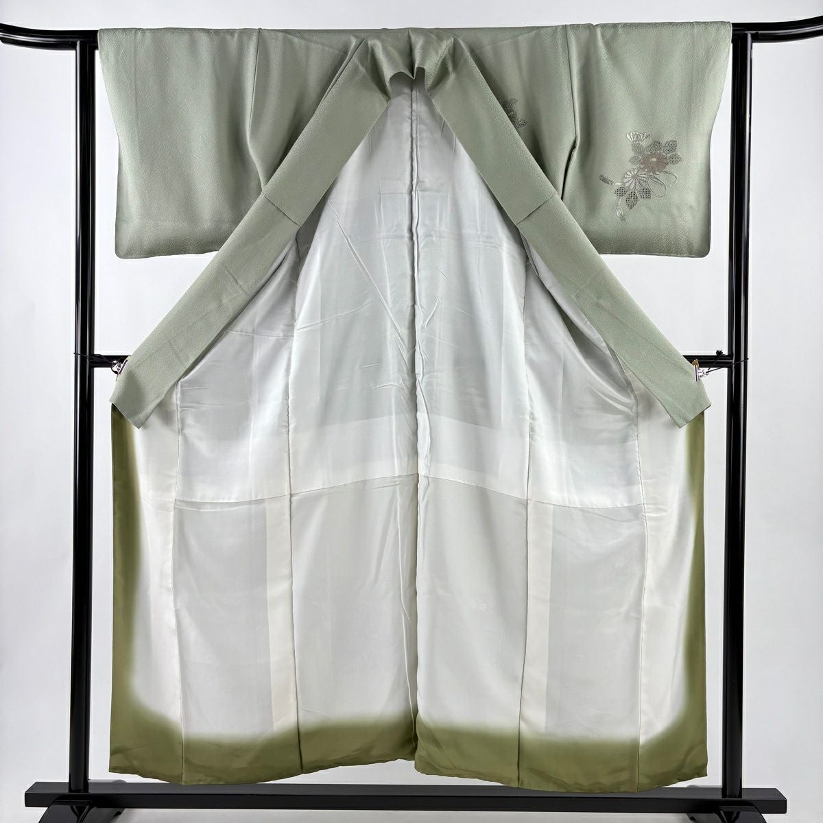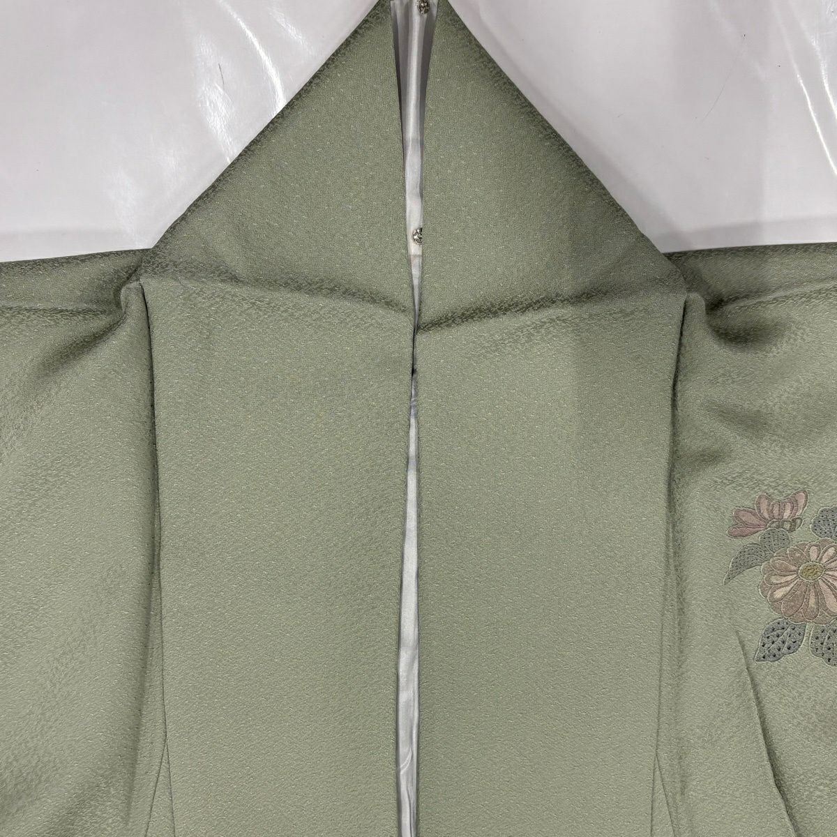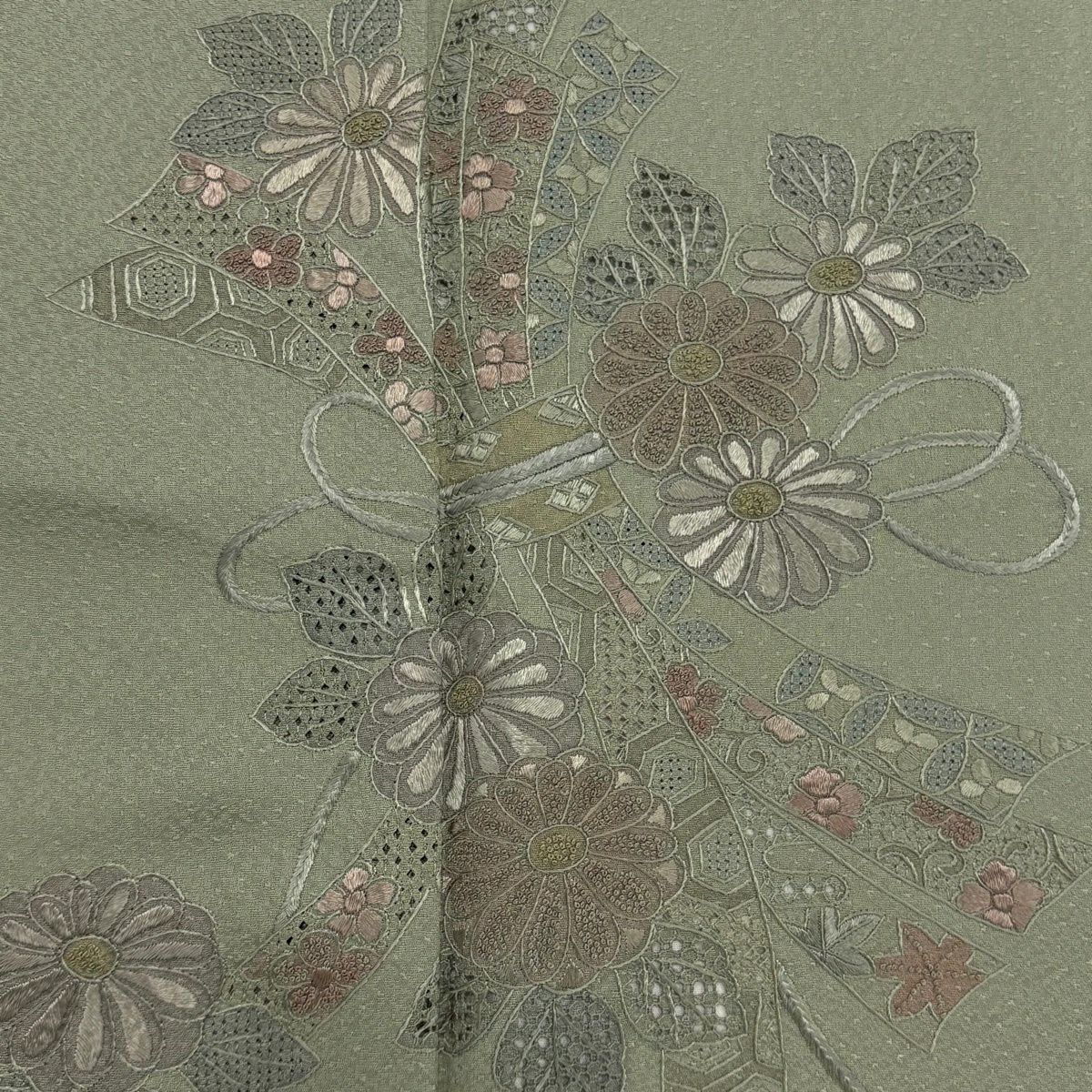 30%OFF 【美品】 付下げ 身丈154cm 裄丈62.5cm S 袷 束ね熨斗 菊 刺繍 灰緑 正絹 秀品 K30
