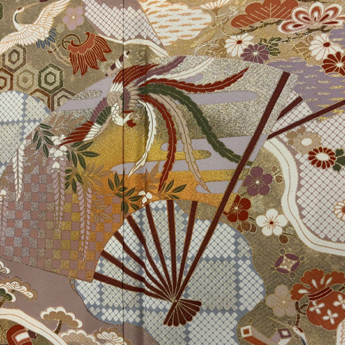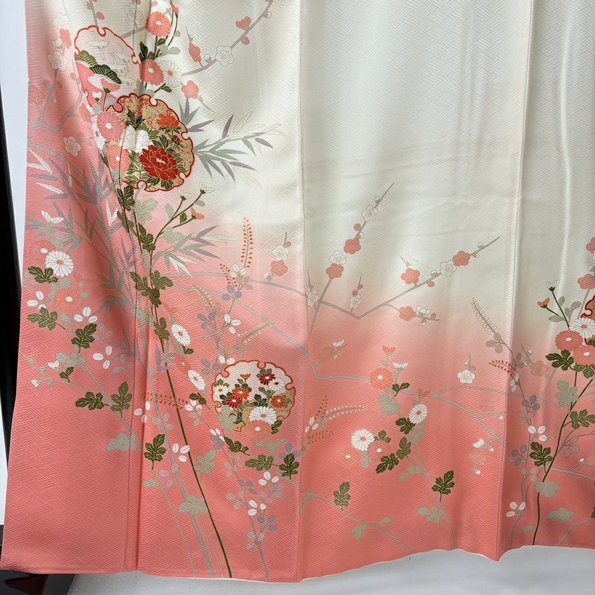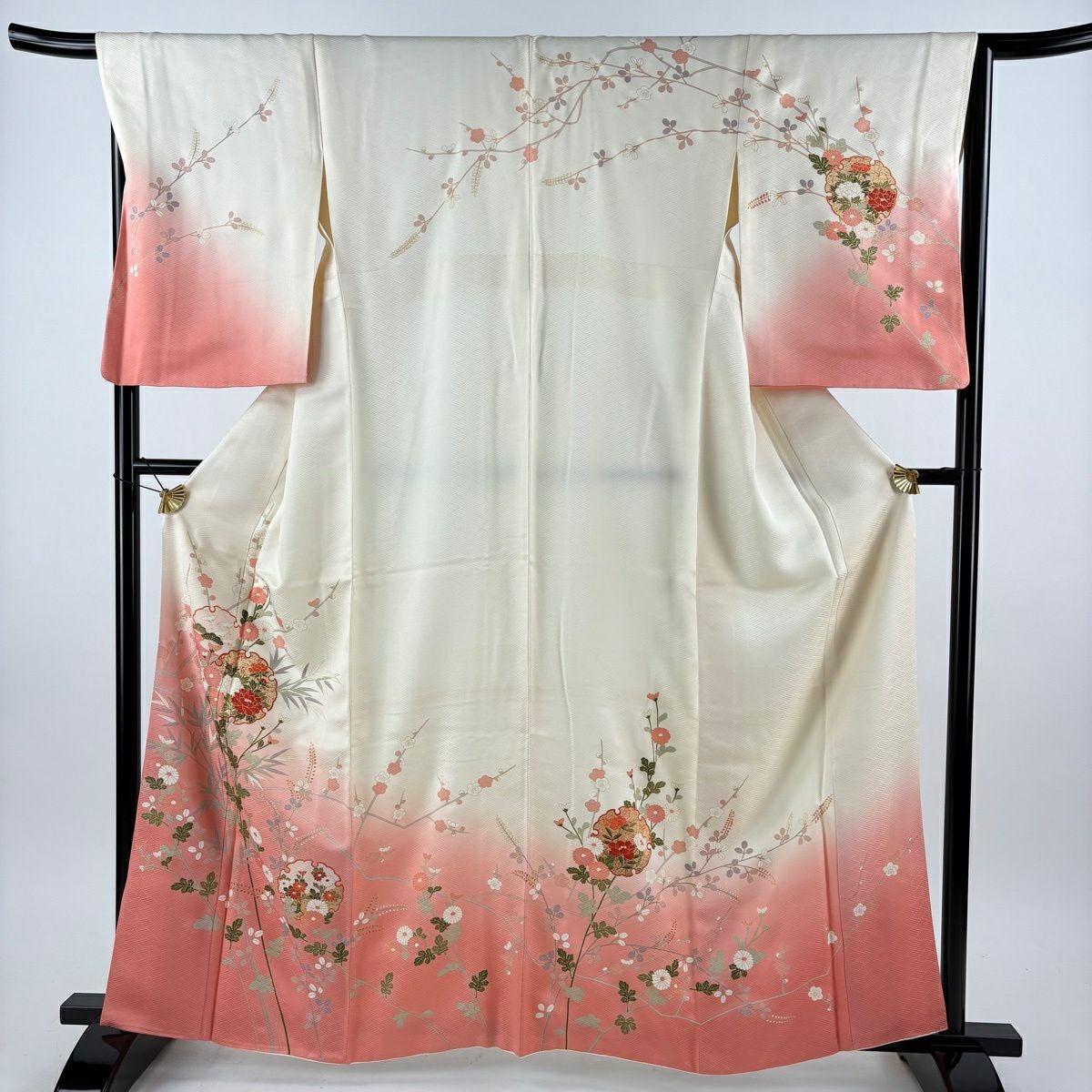 30%OFF 振袖 身丈160.5cm 裄丈64cm M 袷 鶴 枝梅 金糸 金彩 サーモンピンク 正絹 秀品 K30