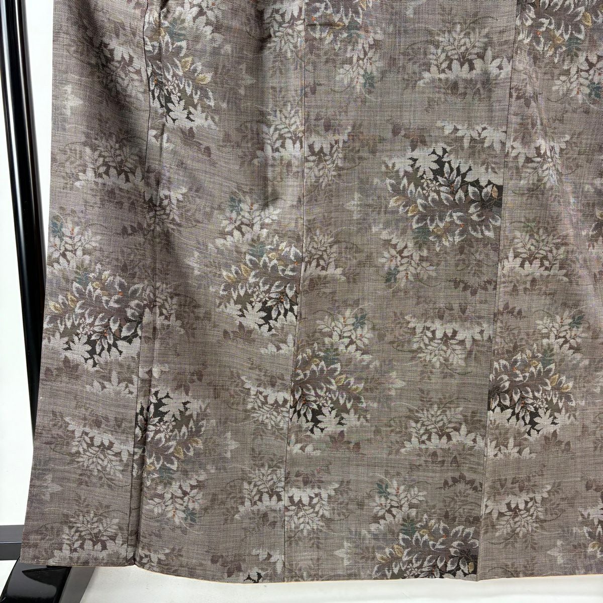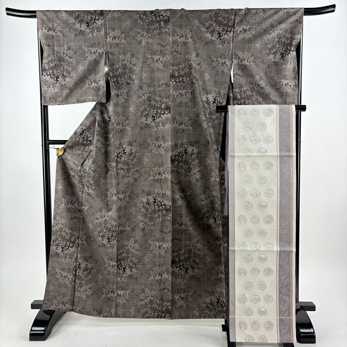 30%OFF 【美品】 紬 身丈164.5cm 裄丈67cm M 袷 名古屋帯セット 葉と実 灰茶 正絹 秀品 K30