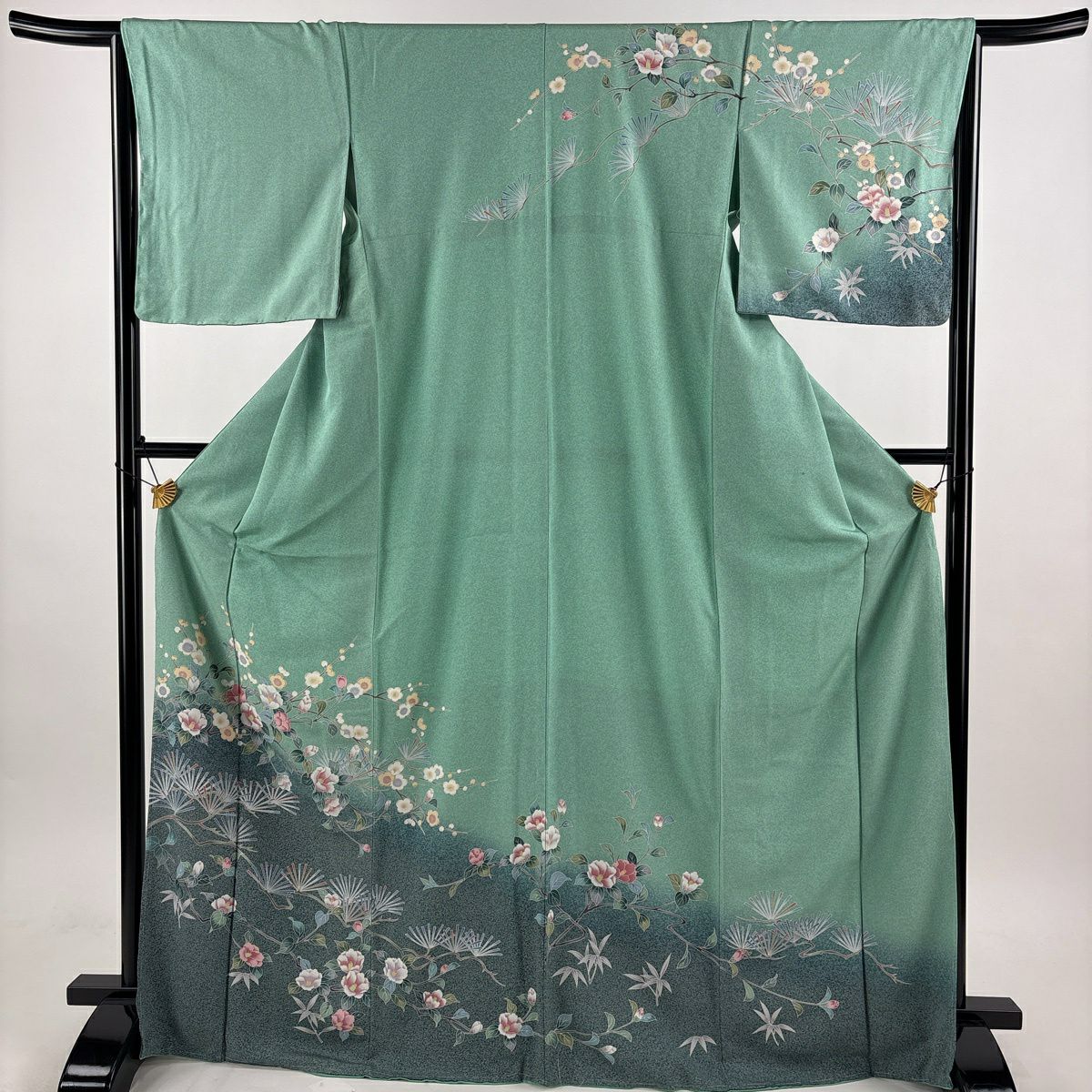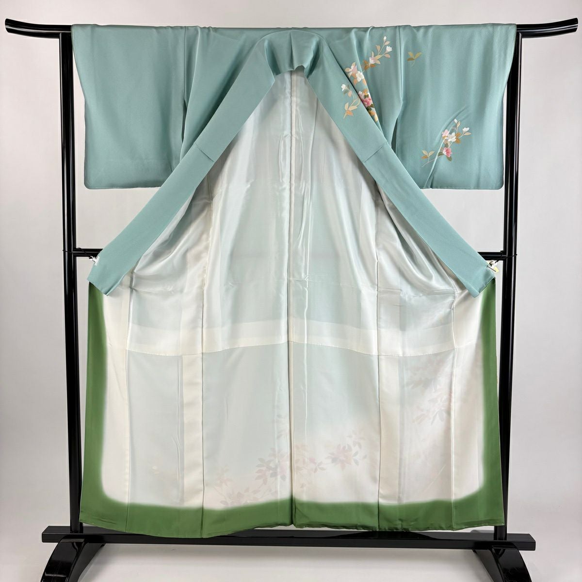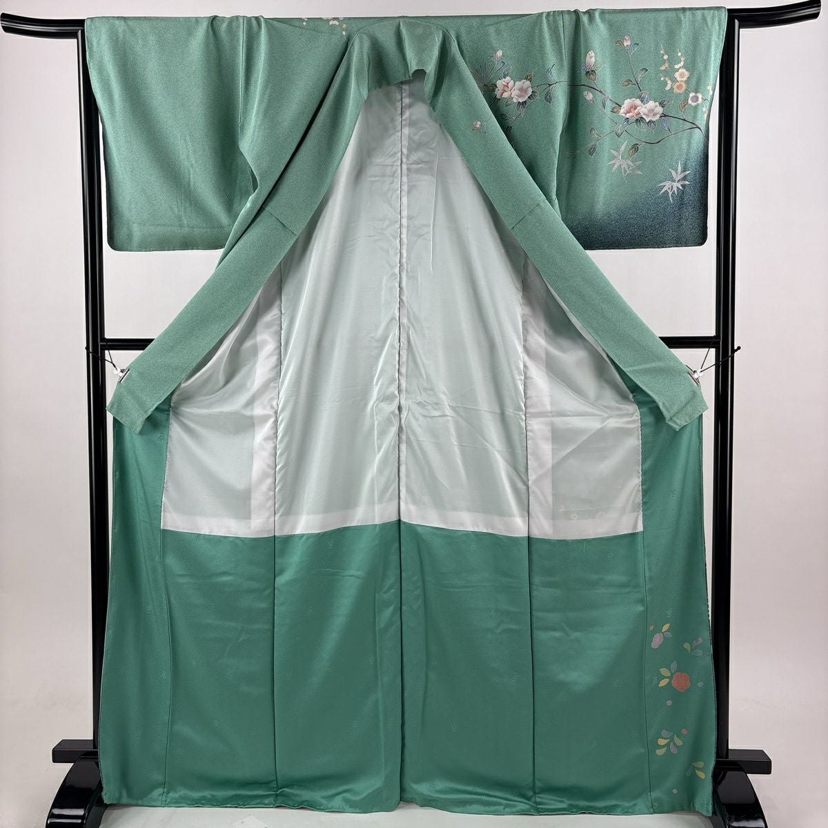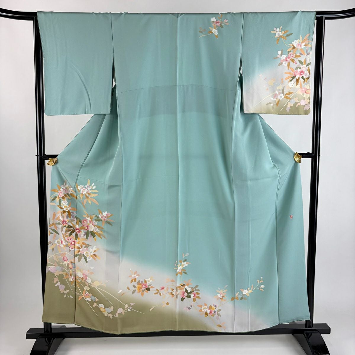 50%OFF 訪問着 身丈157.5cm 裄丈63.5cm S 袷 落款あり 草花 枝花 ぼかし 薄緑 正絹 秀品 K50