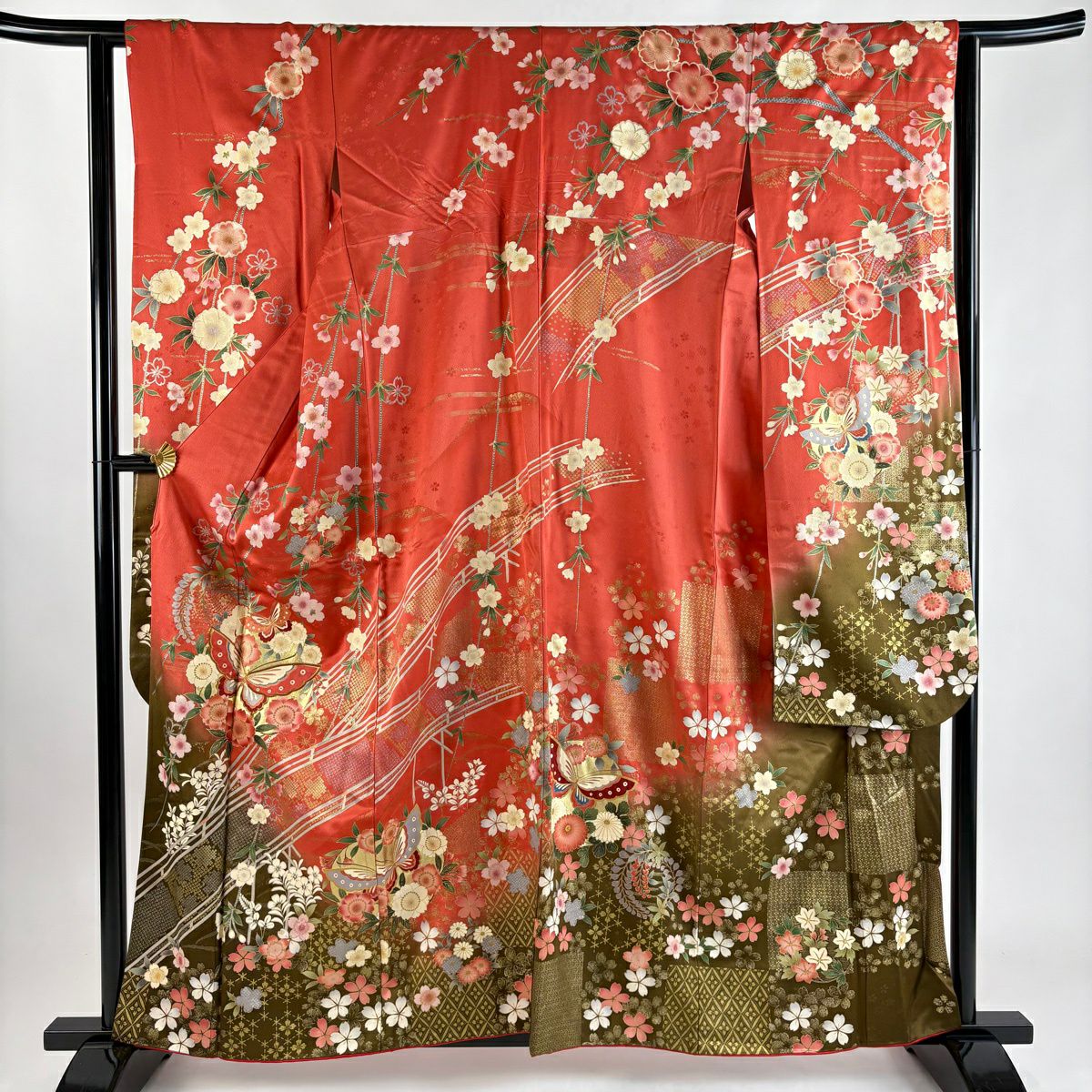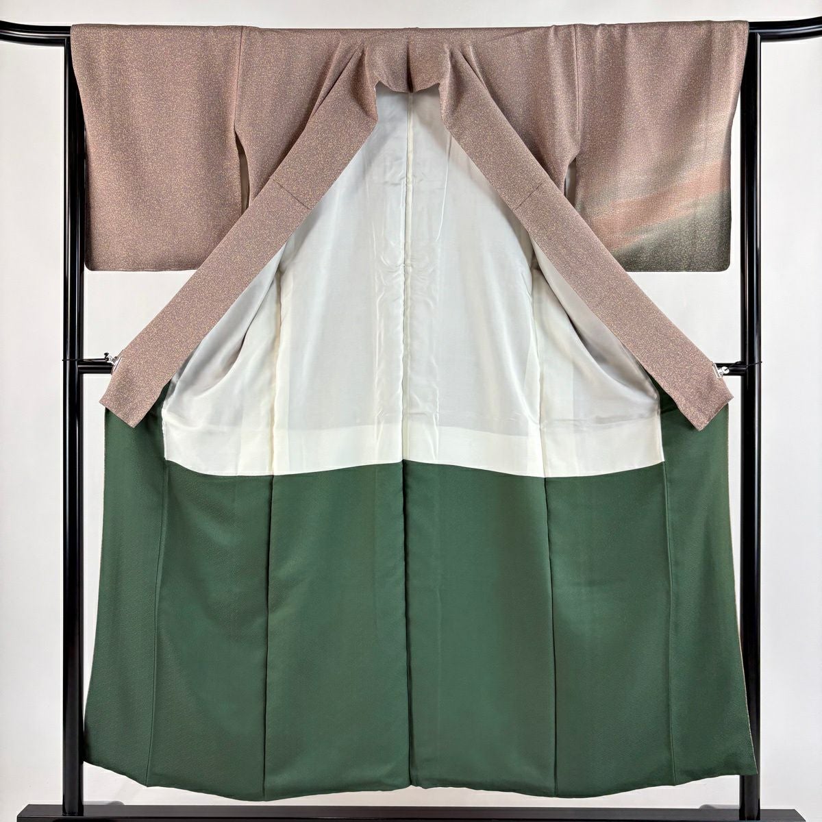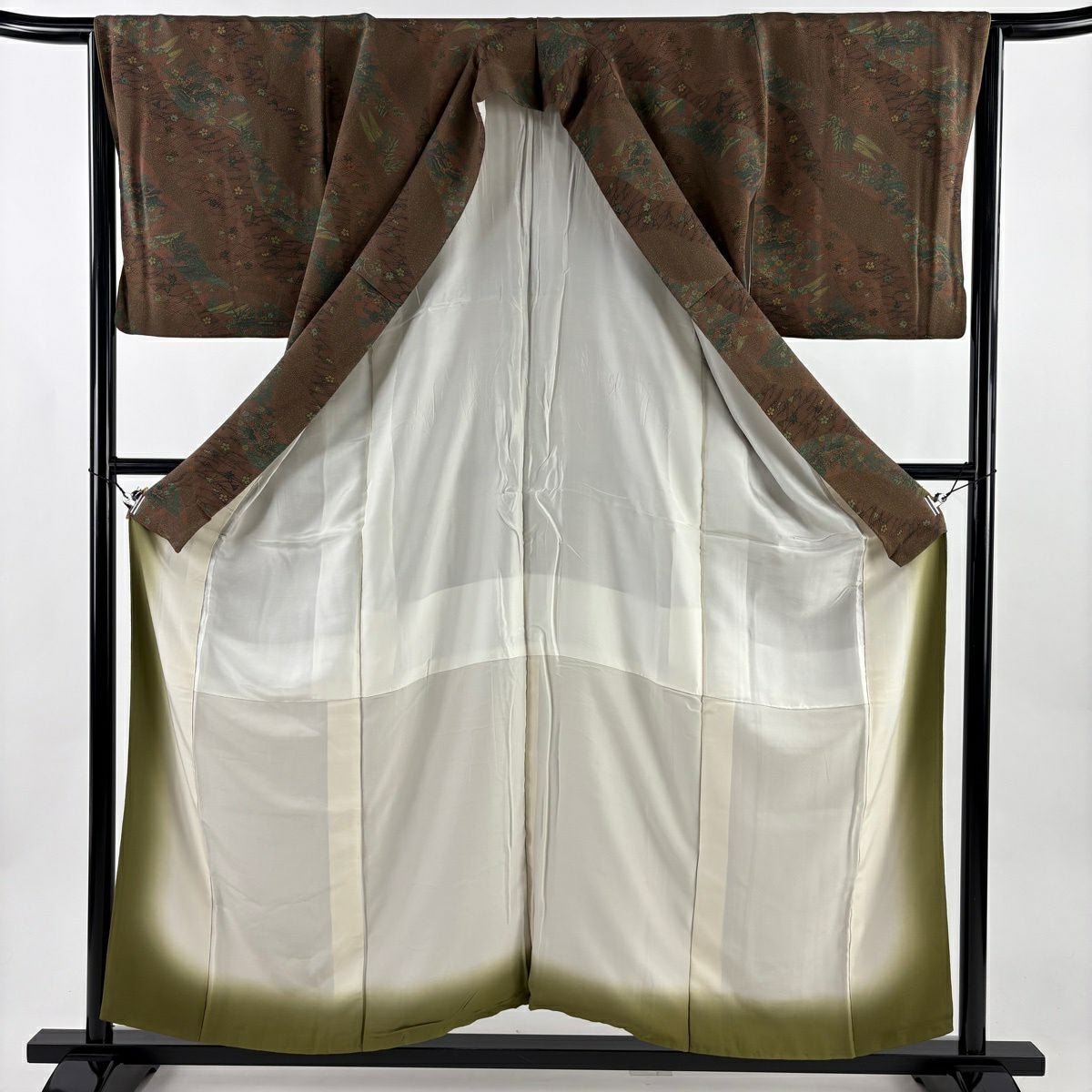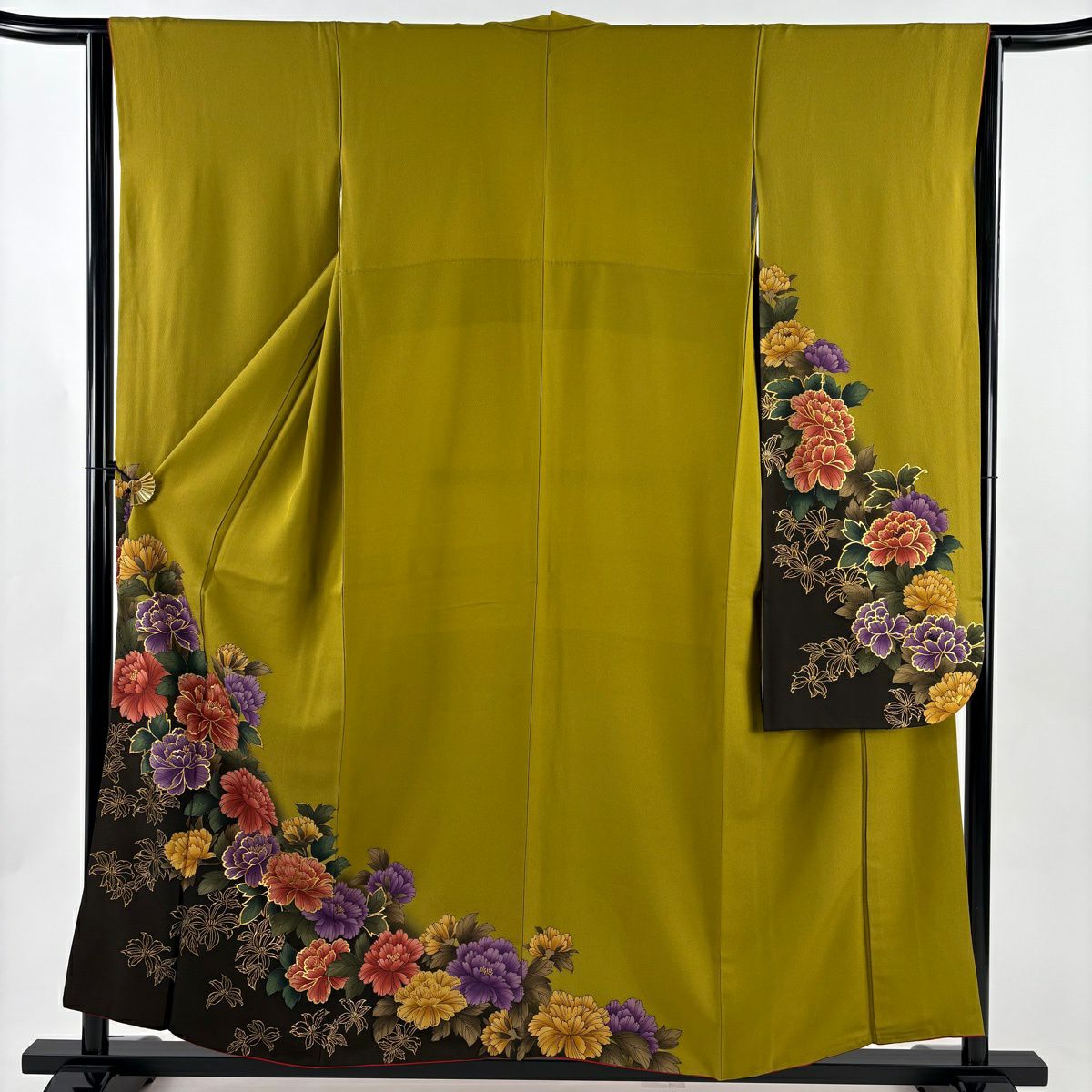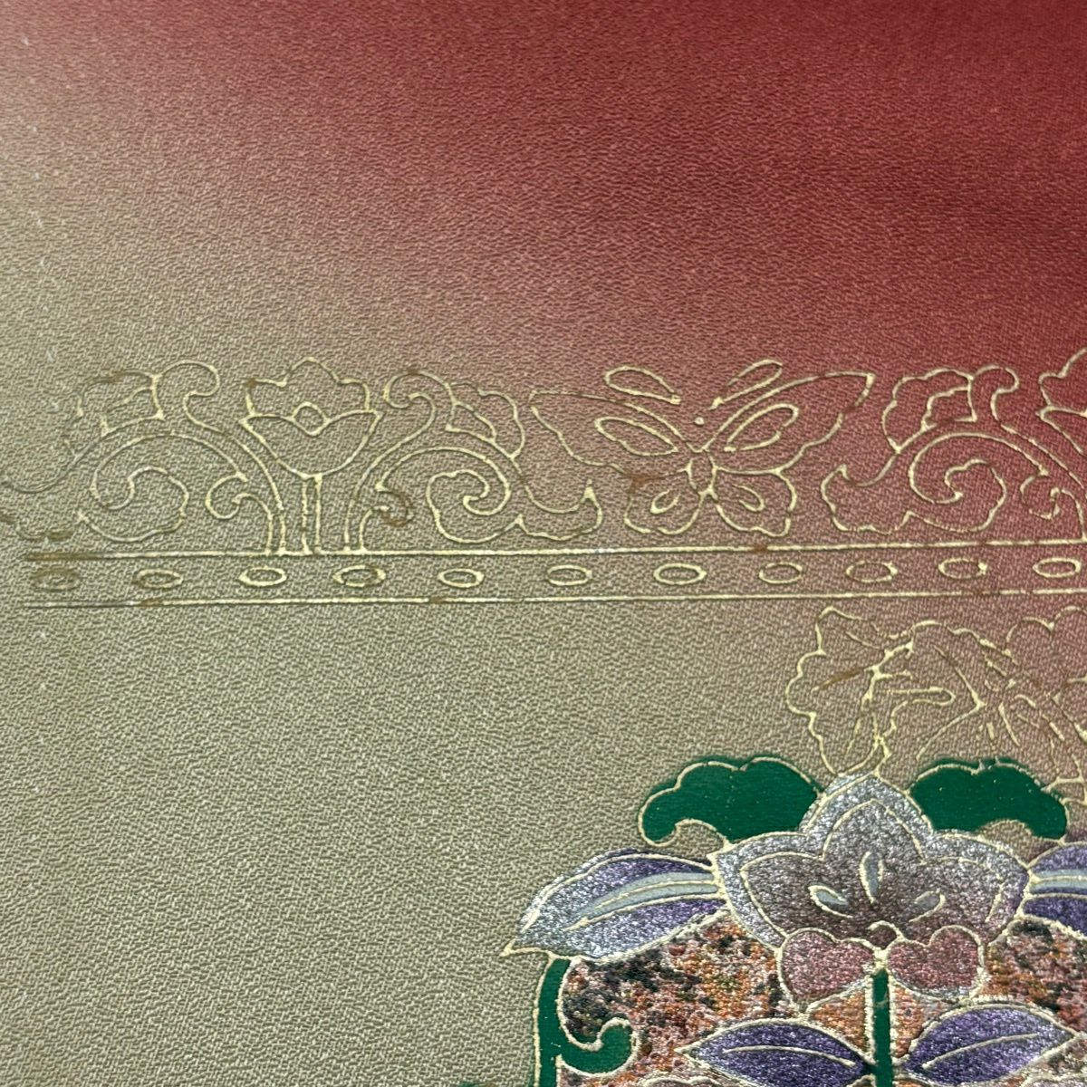 50%OFF 【美品】 振袖 身丈155cm 裄丈64.5cm M 袷 牡丹 金彩 染め分け 茶緑色 正絹 秀品 K50