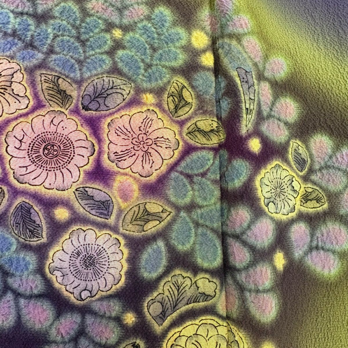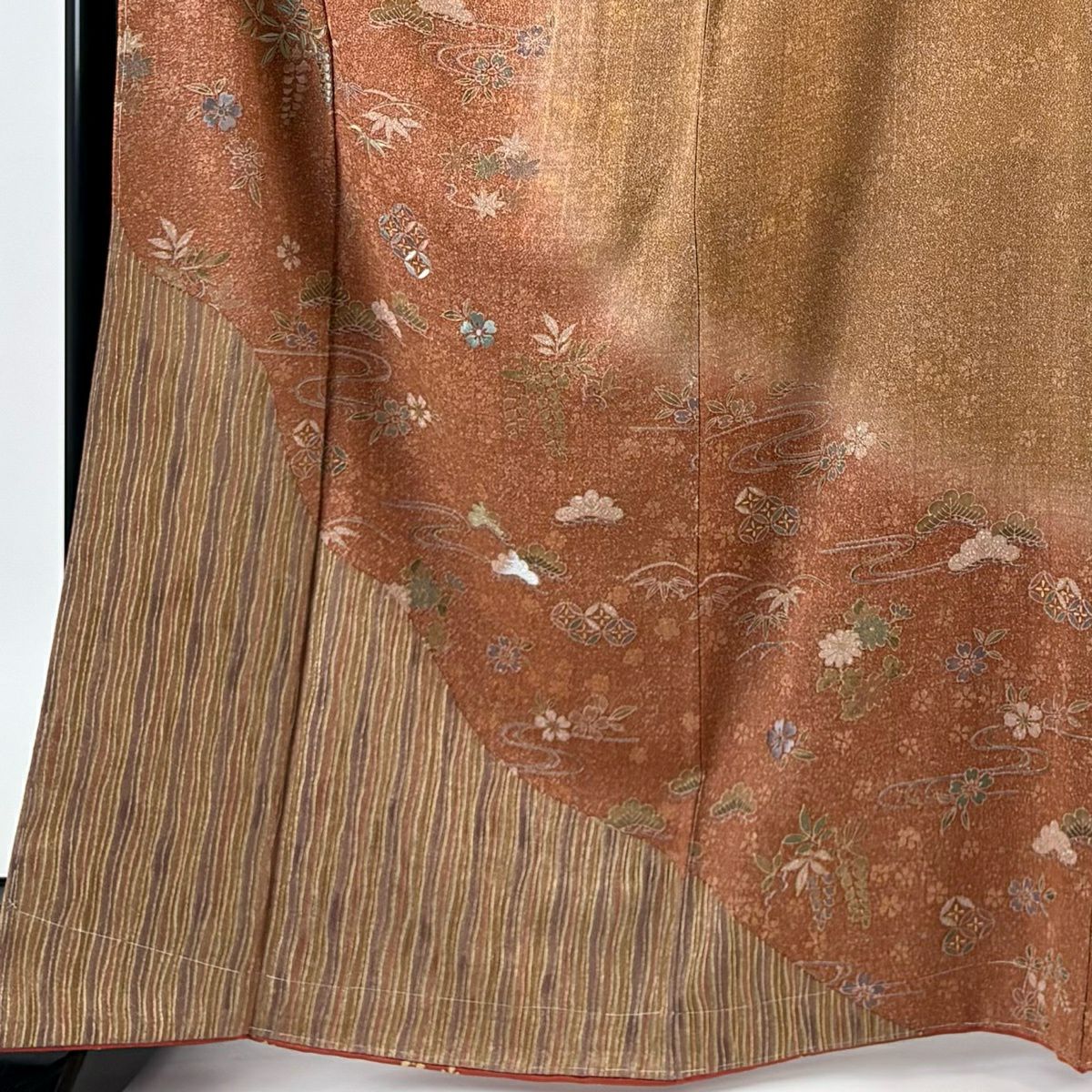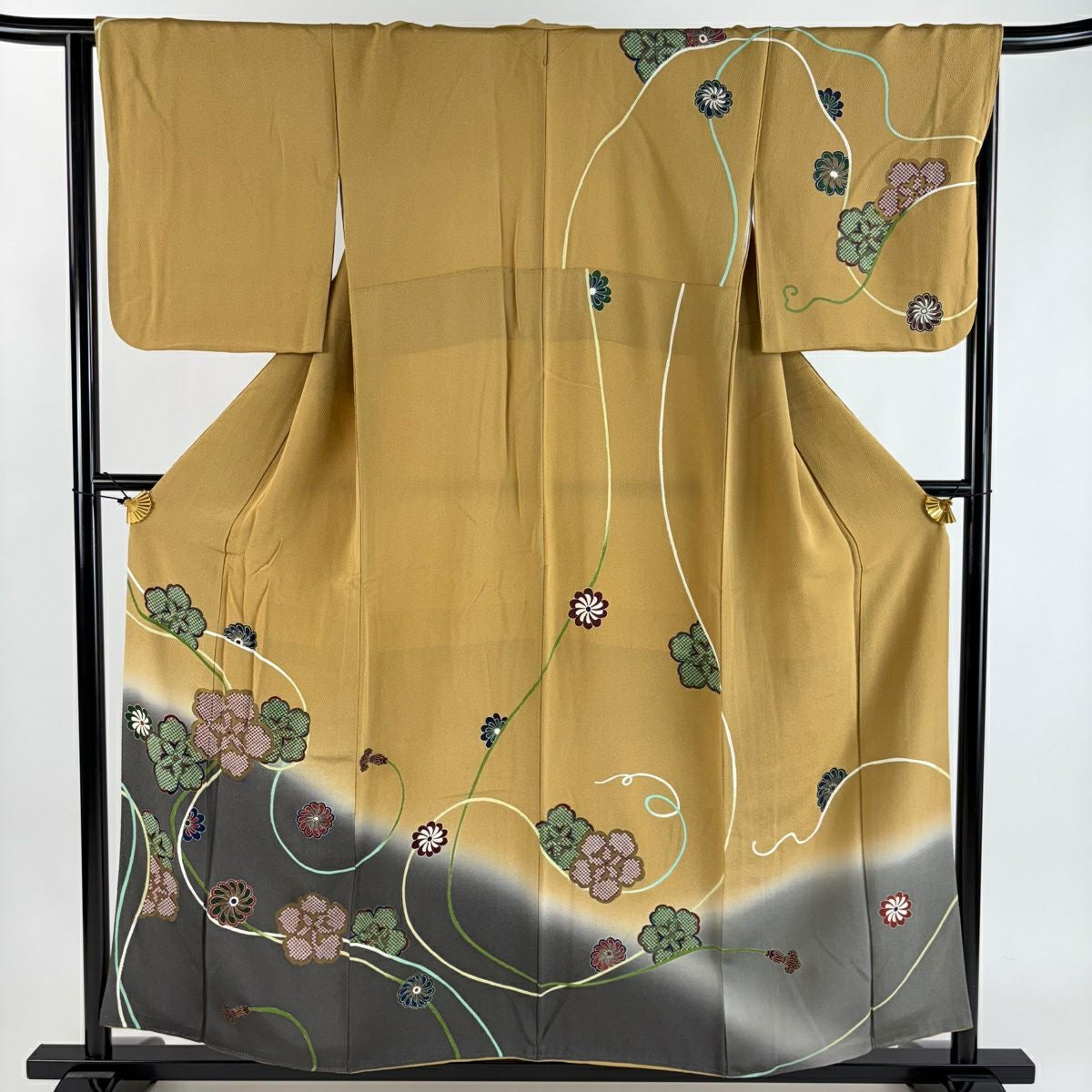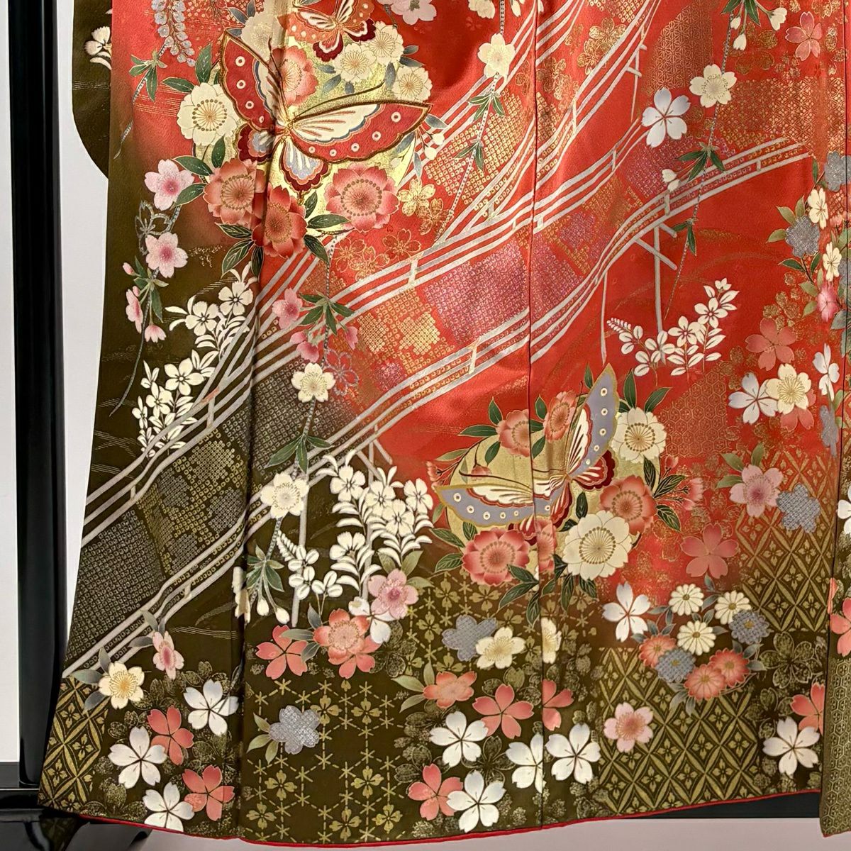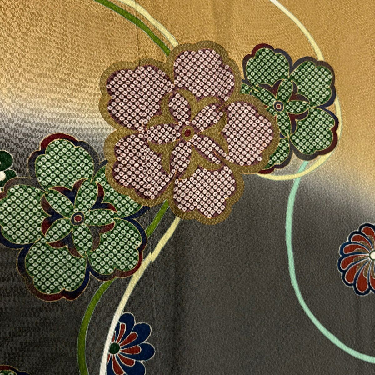 50%OFF 【美品】 振袖 身丈155cm 裄丈64.5cm M 袷 牡丹 金彩 染め分け 茶緑色 正絹 秀品 K50