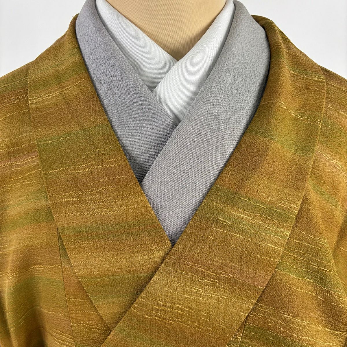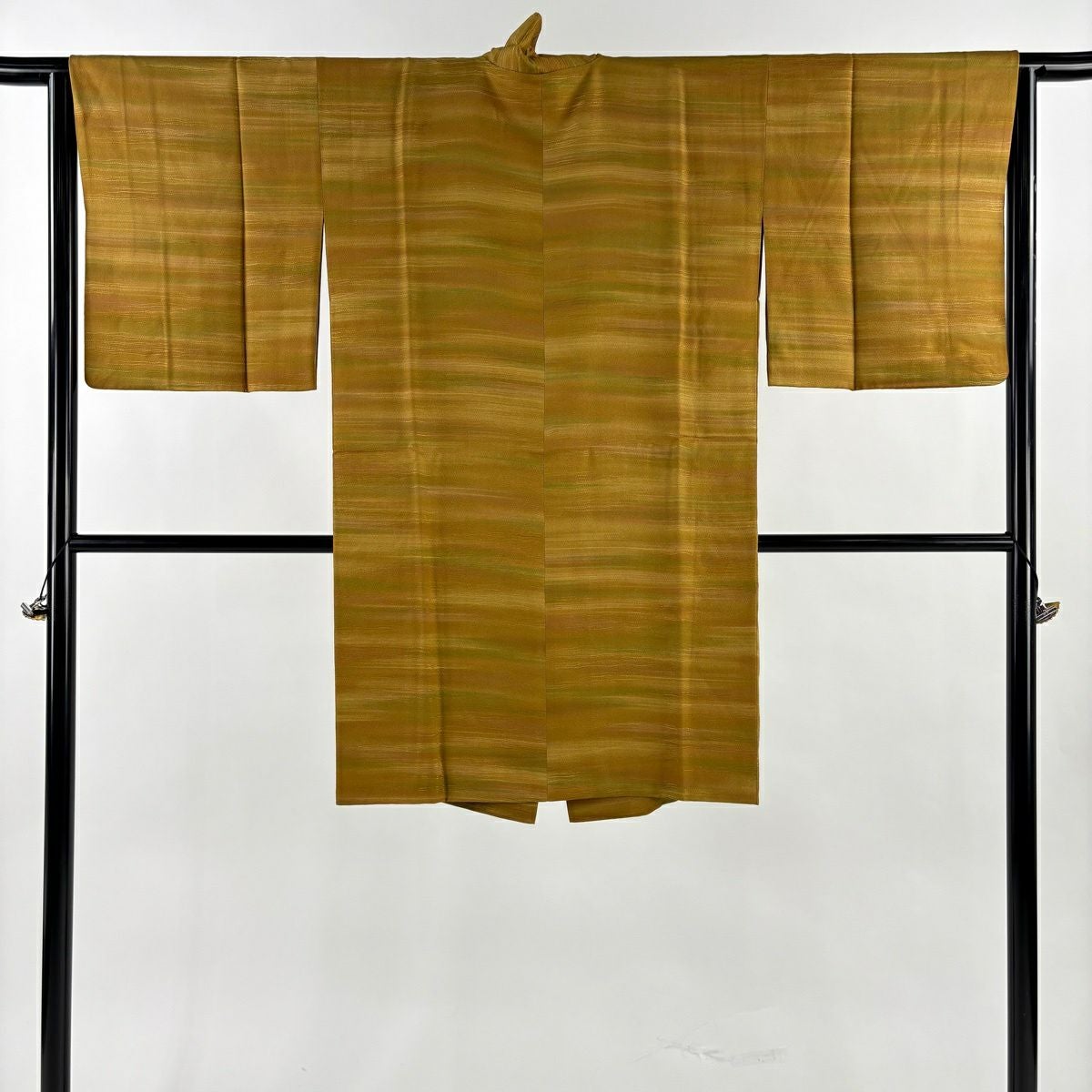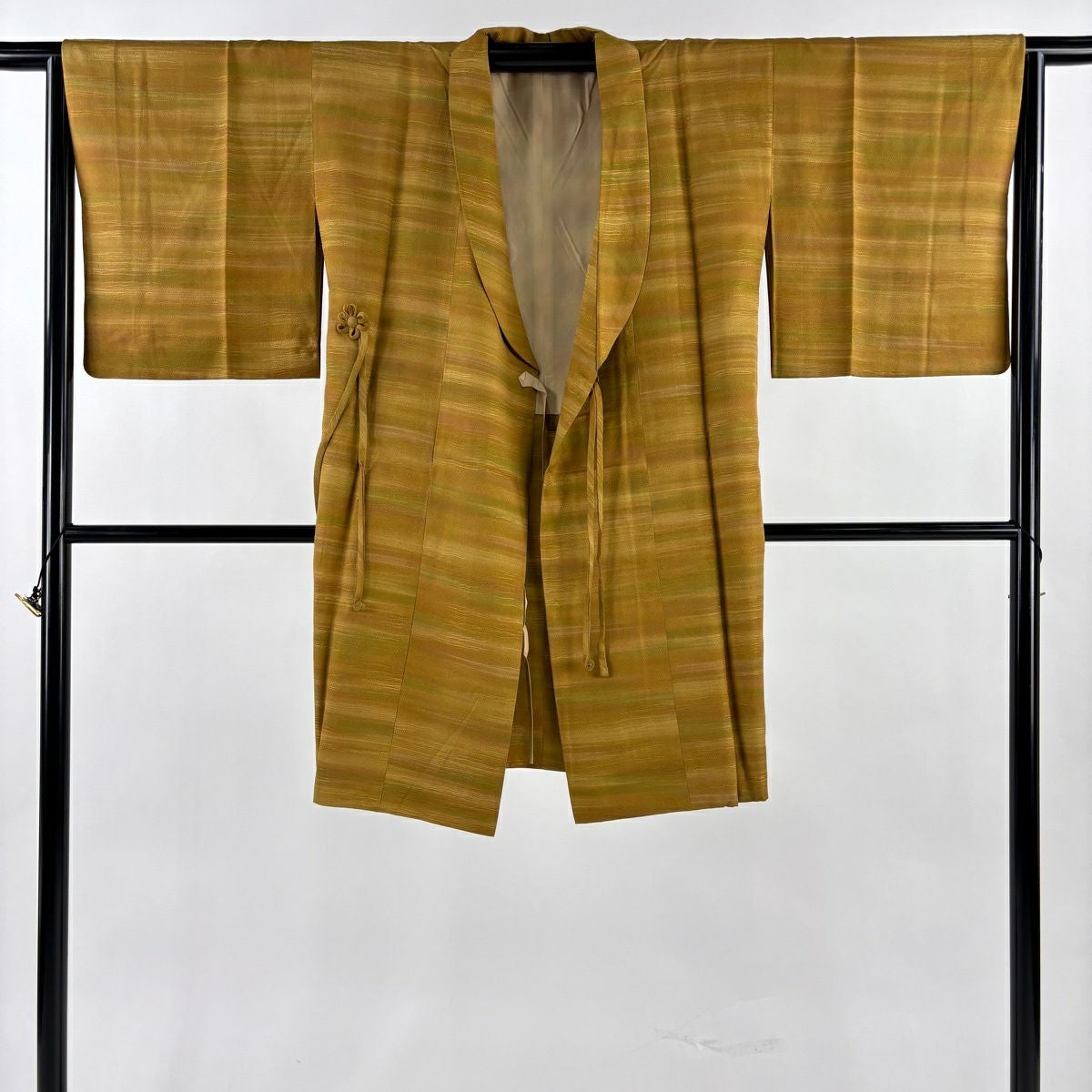 50%OFF 道中着 身丈100cm 裄丈64cm M 和装コート へちま衿 横縞 ぼかし 黄土色 正絹 秀品 K50