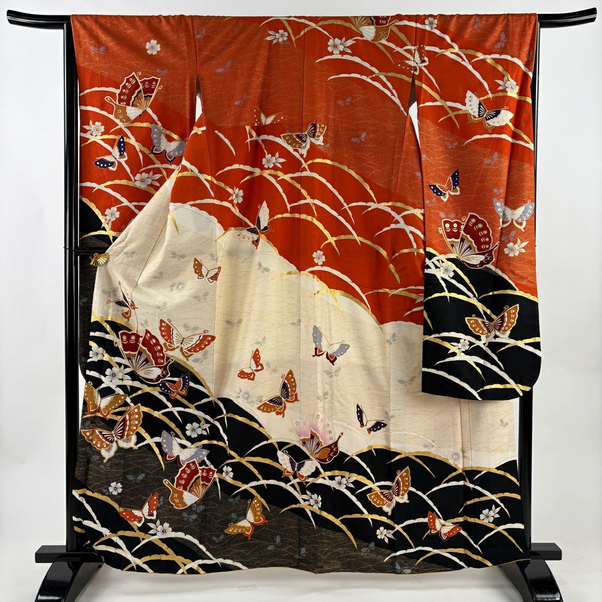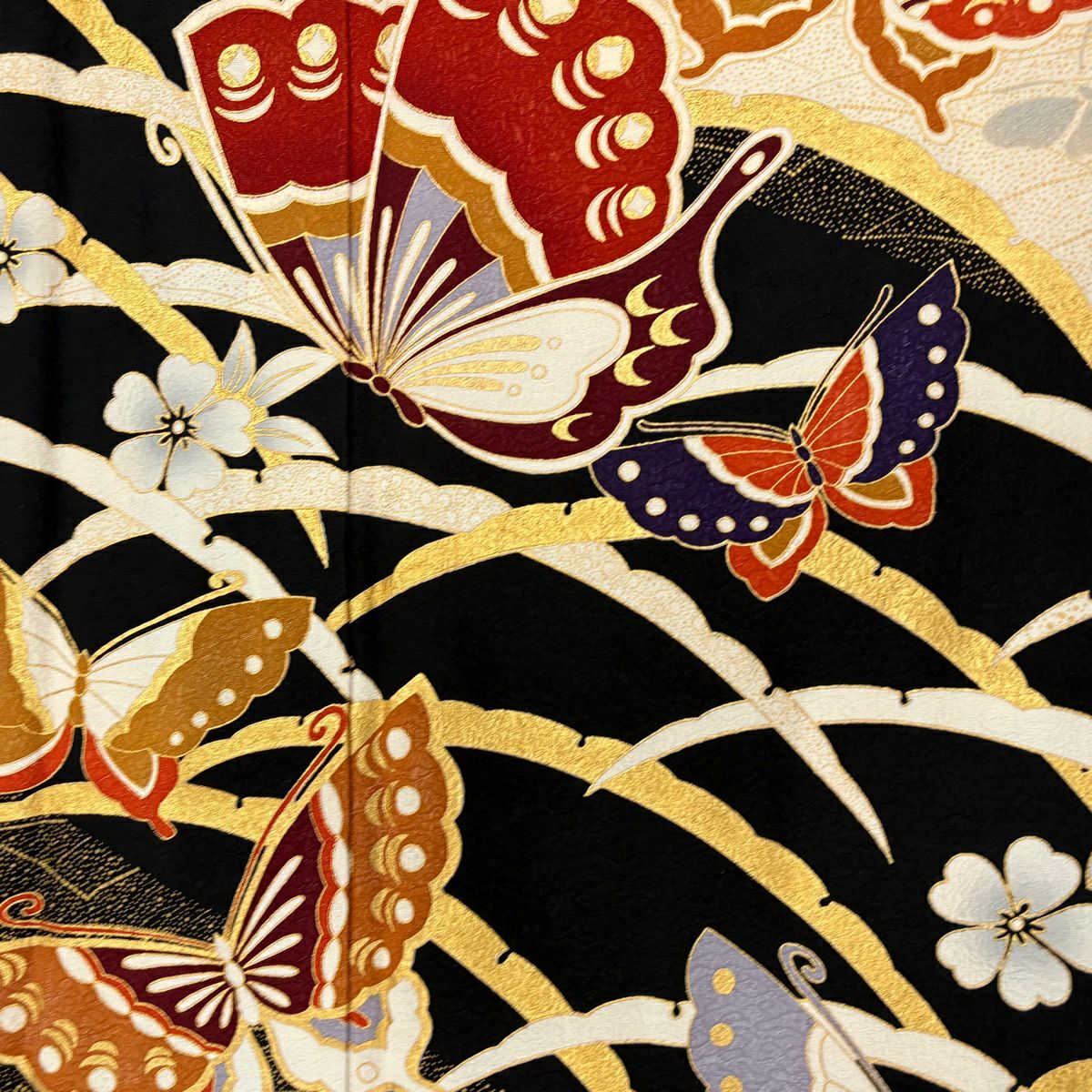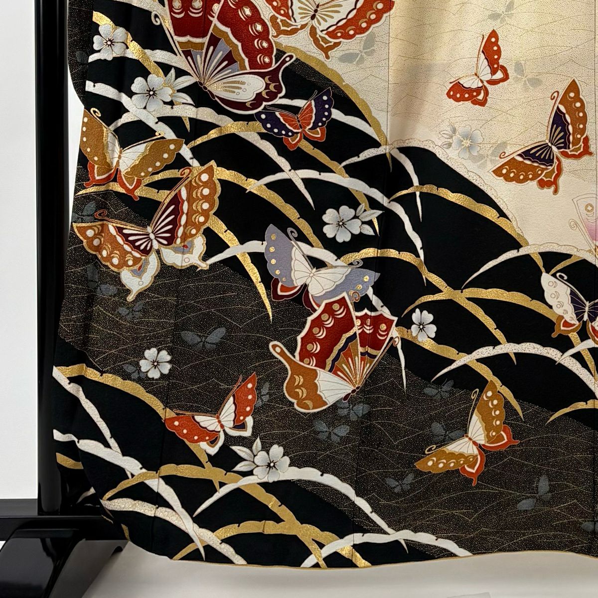 50%OFF 【美品】 振袖 身丈162.5cm 裄丈65cm M 袷 蝶 雪芝 金彩 染め分け 黒 正絹 秀品 K50