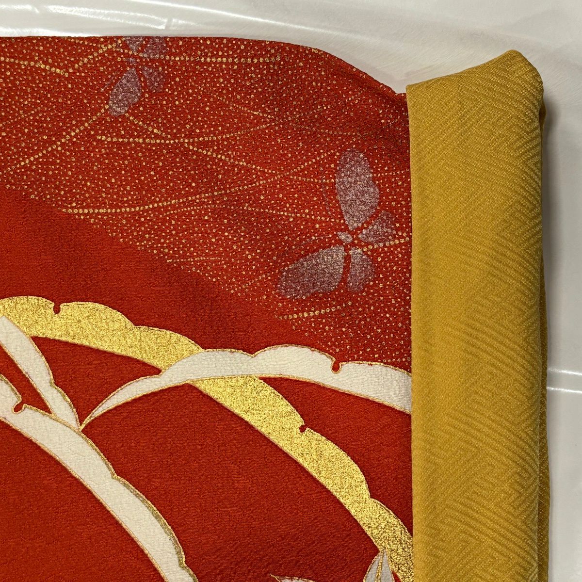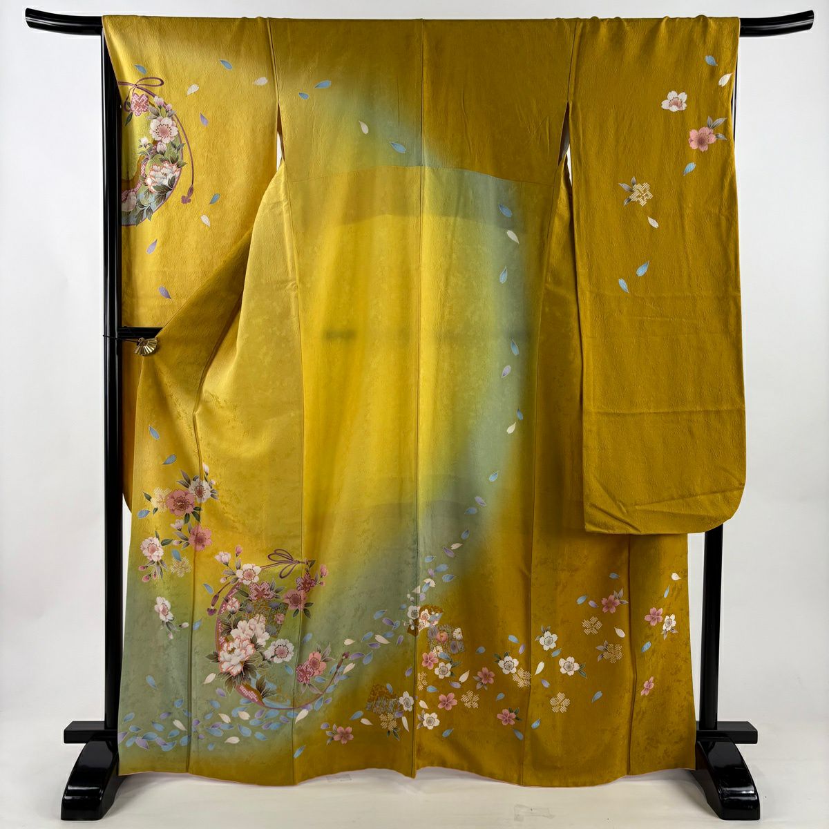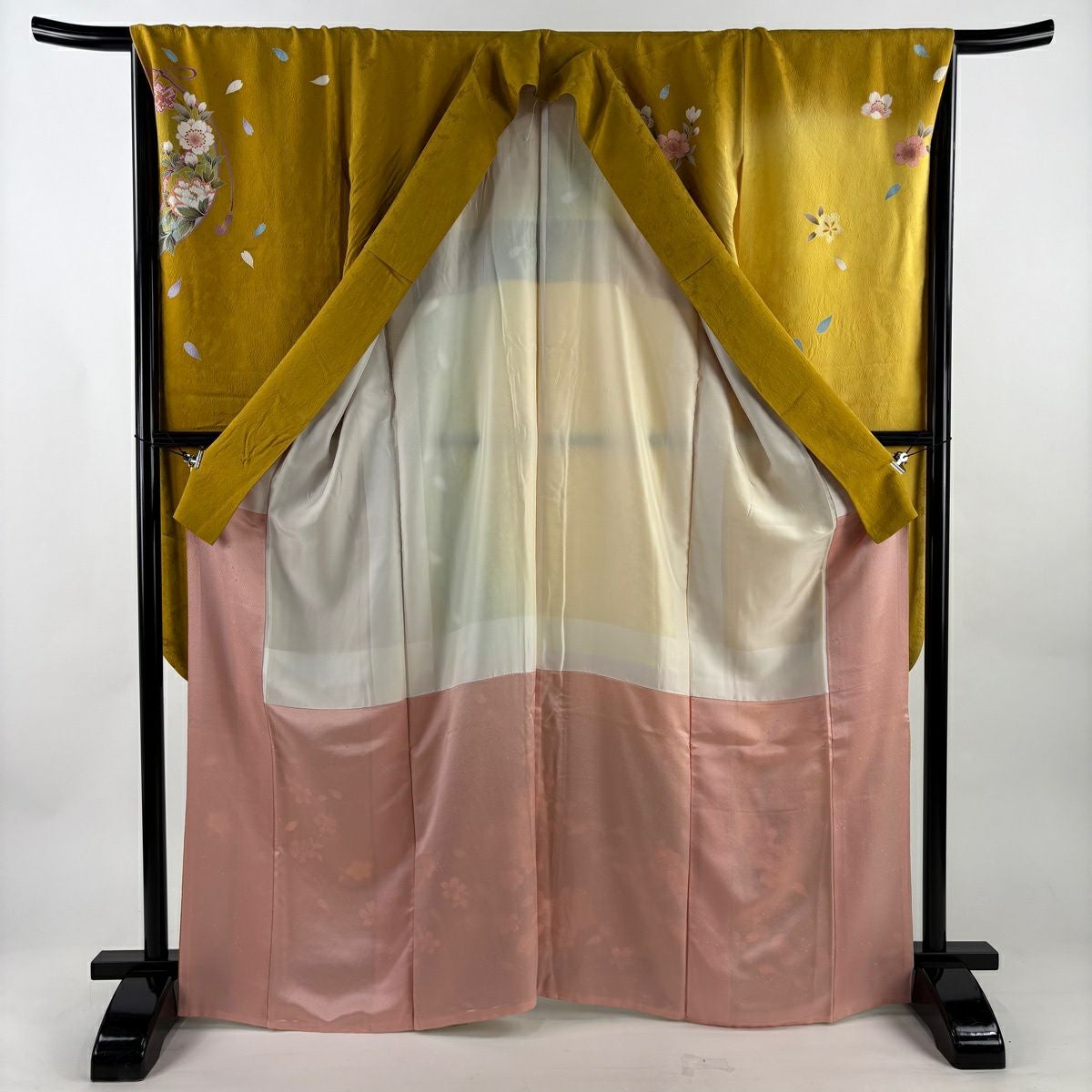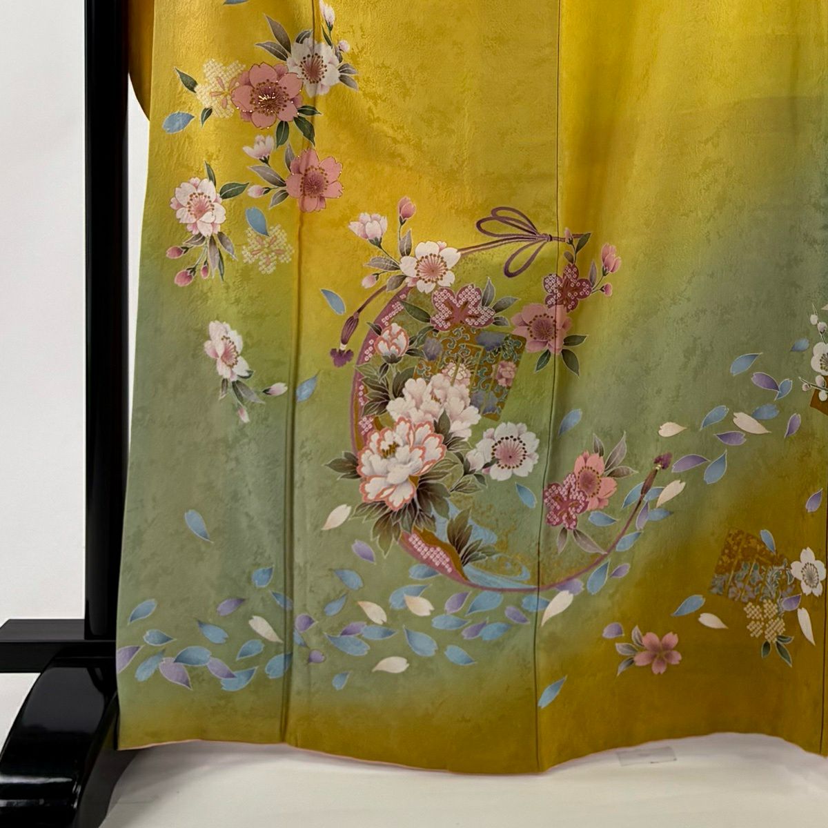 50%OFF 振袖 身丈166.5cm 裄丈64cm M 袷 束ね熨斗 牡丹 金彩 ぼかし 山吹色 正絹 秀品 K50