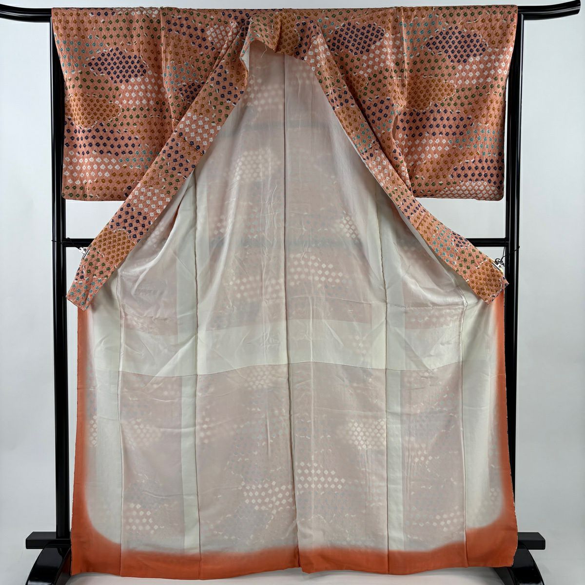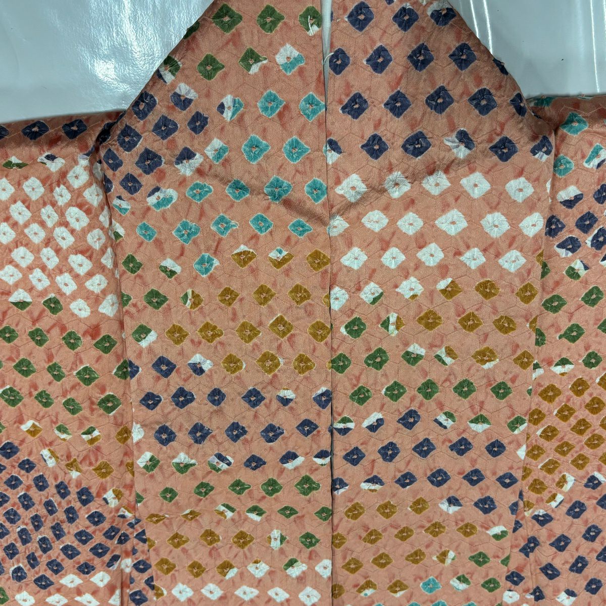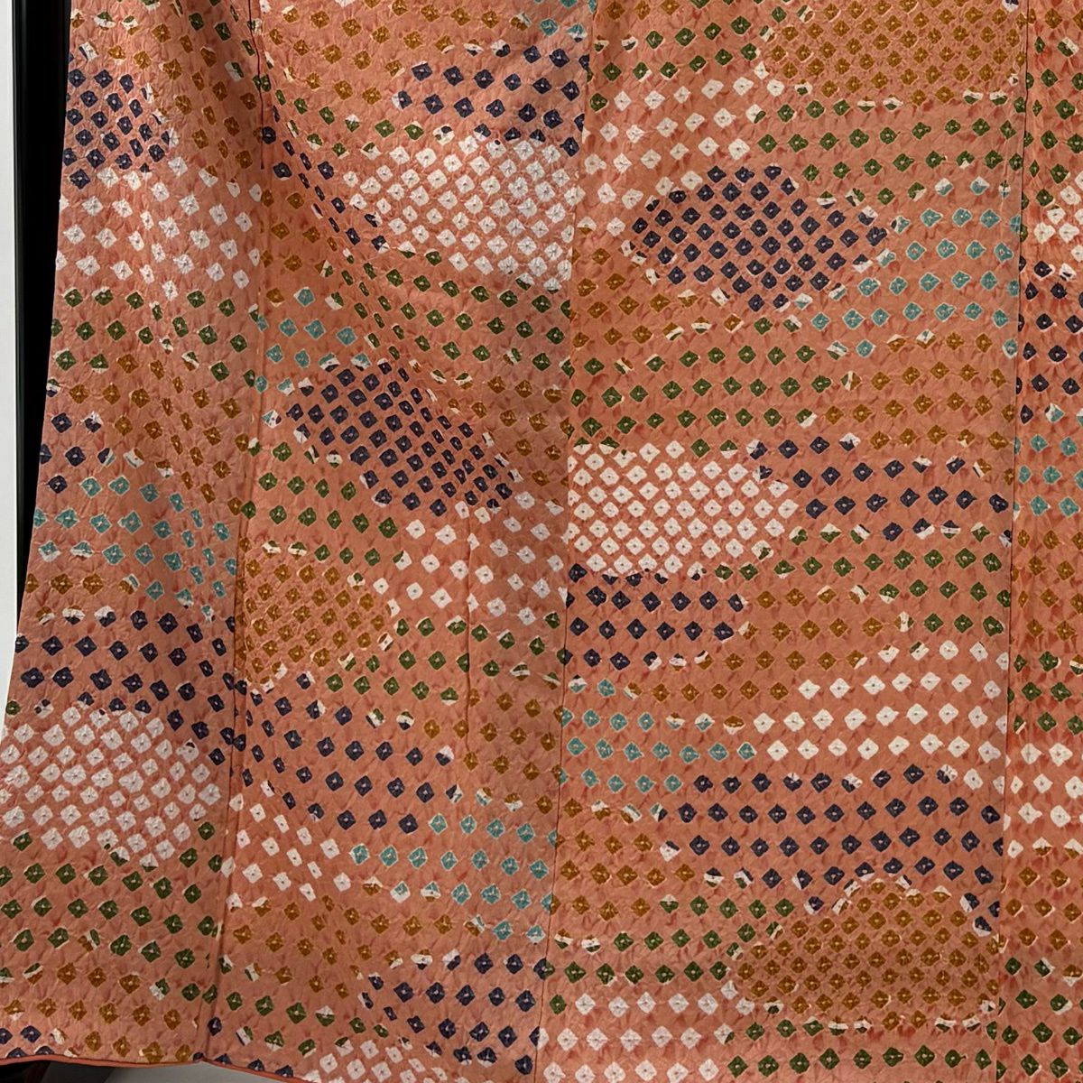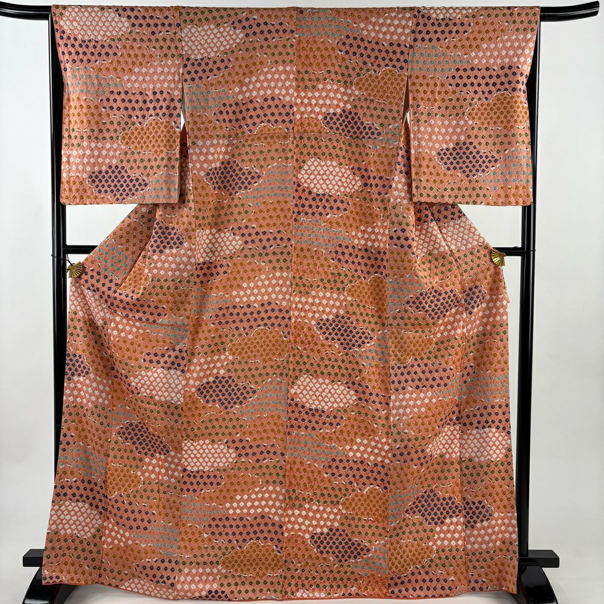 50%OFF 【美品】 小紋 身丈168cm 裄丈66cm M 袷 幾何学 絞り サーモンピンク 正絹 秀品 K50