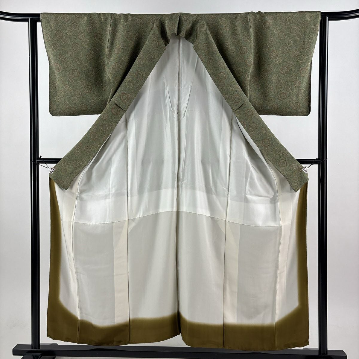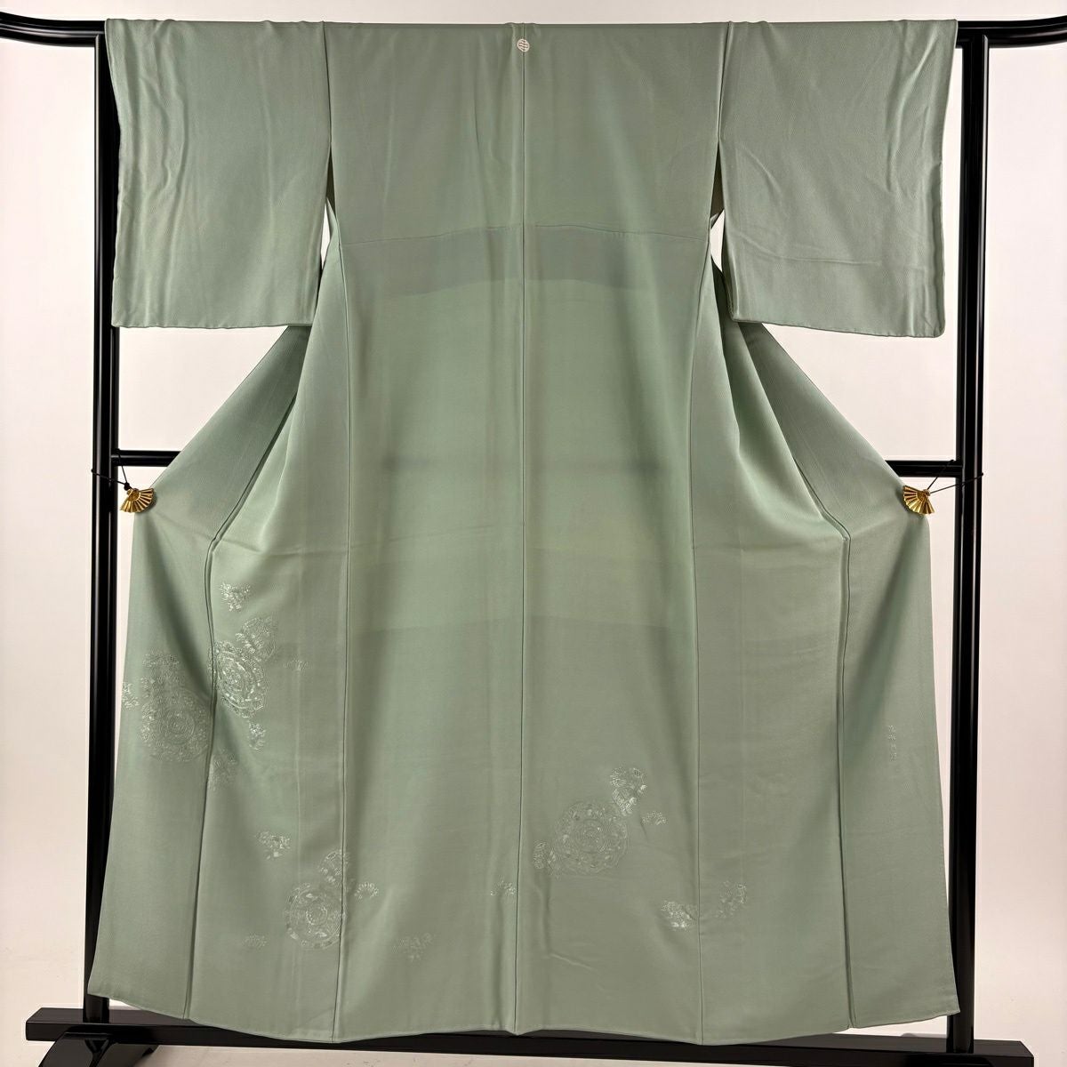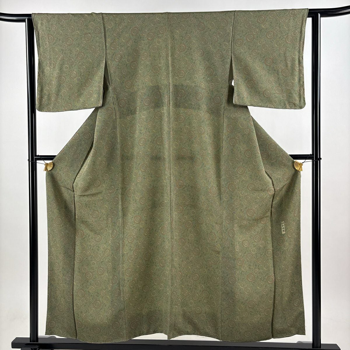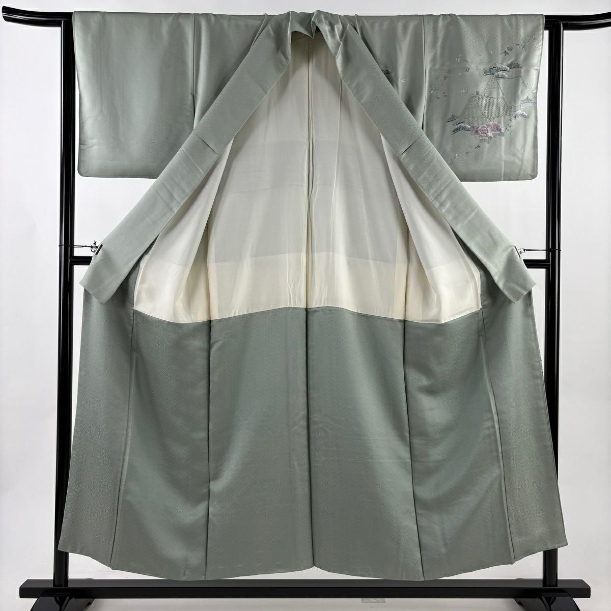 50%OFF 訪問着 身丈162.5cm 裄丈66cm M 袷 菊 短冊 刺繍 絞り 灰緑 正絹 秀品 一つ紋 K50