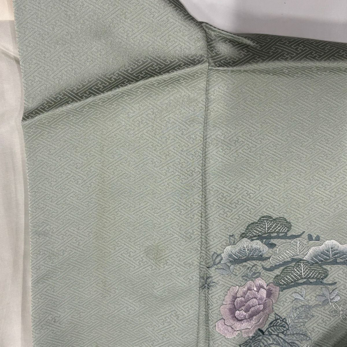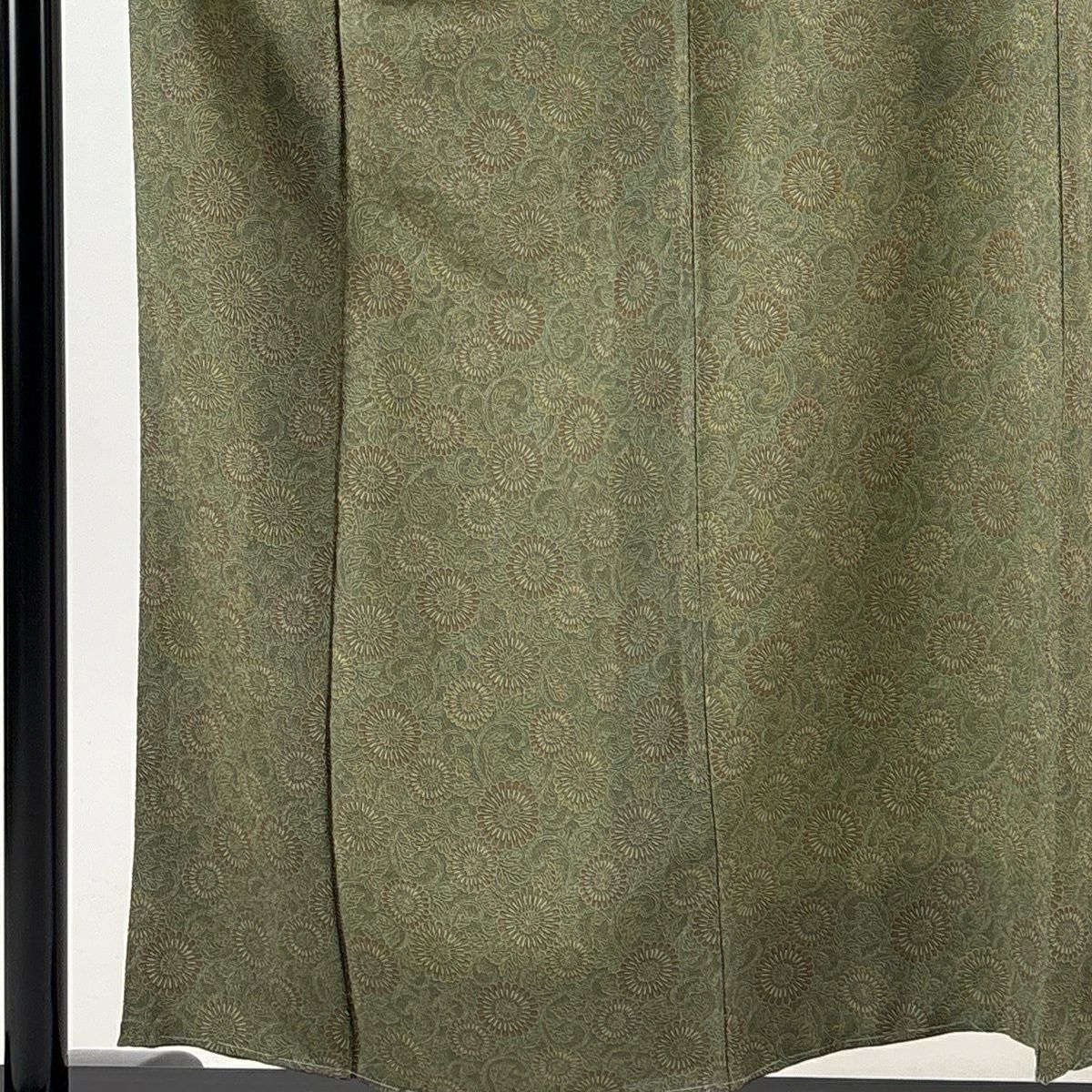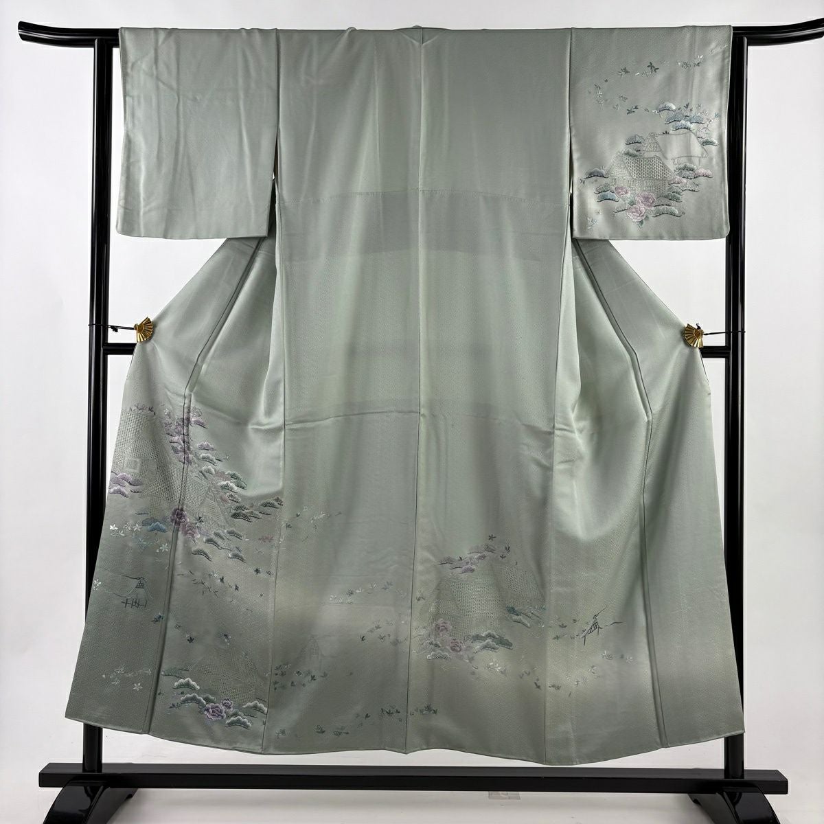 50%OFF 訪問着 身丈162.5cm 裄丈66cm M 袷 菊 短冊 刺繍 絞り 灰緑 正絹 秀品 一つ紋 K50