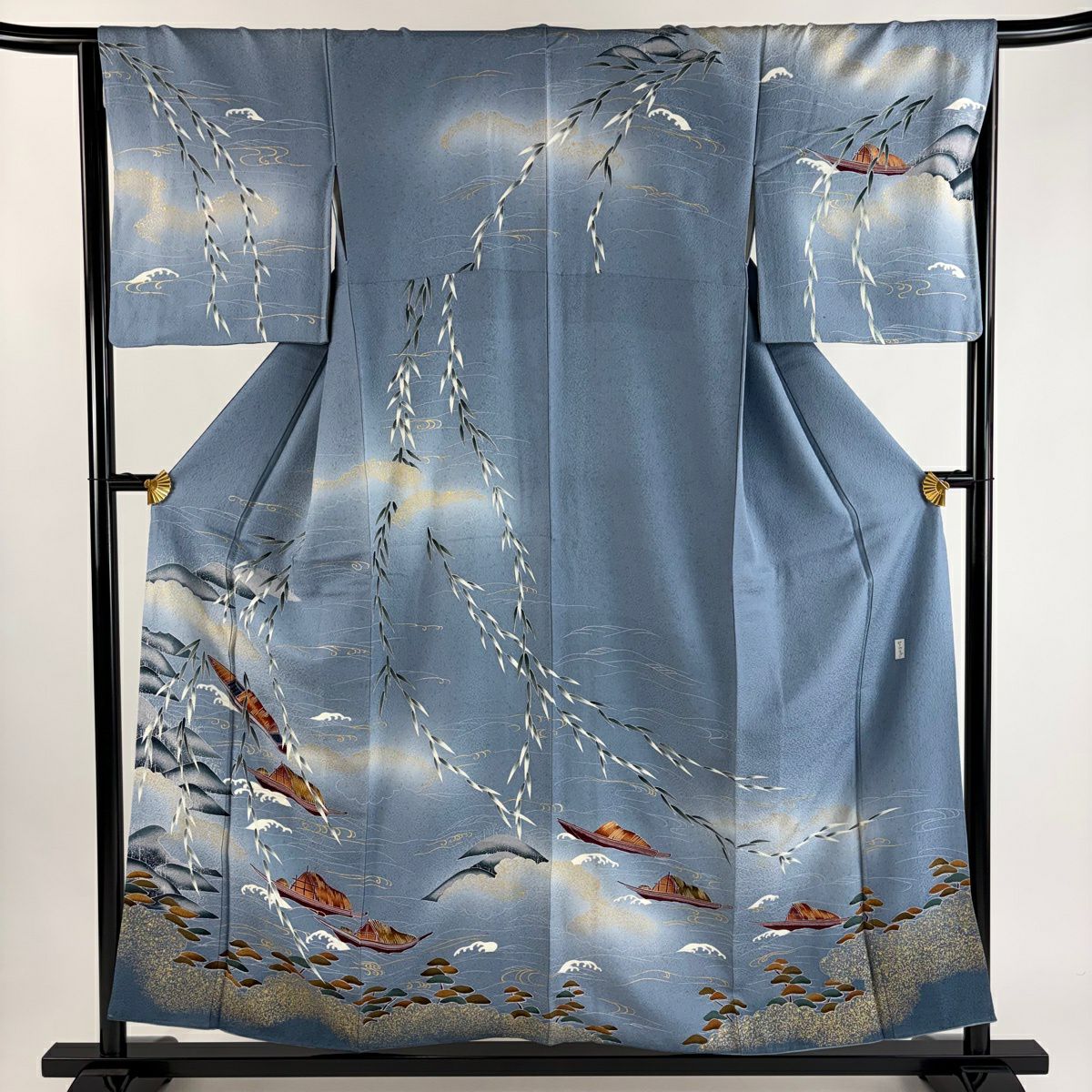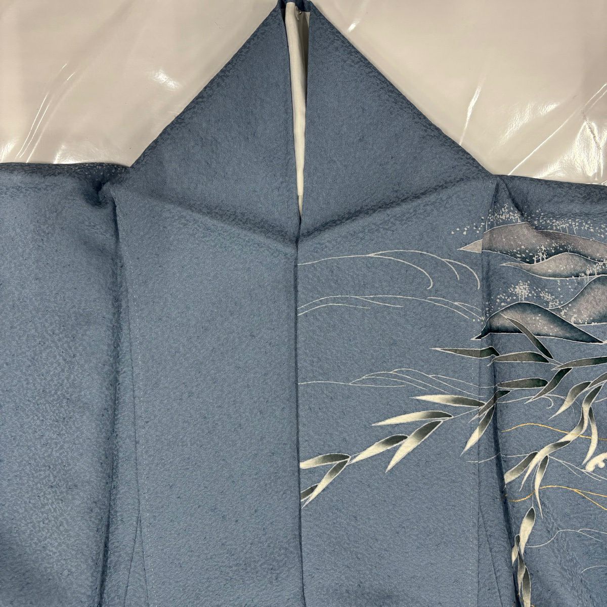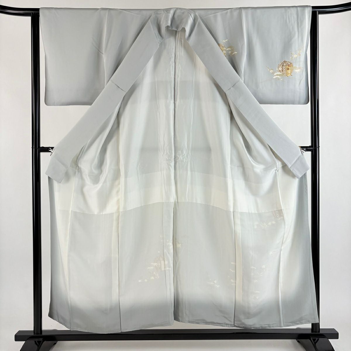 50%OFF 付下げ 身丈156cm 裄丈64.5cm M 袷 向かい鳥 草花 刺繍 金糸 青灰色 正絹 秀品 K50