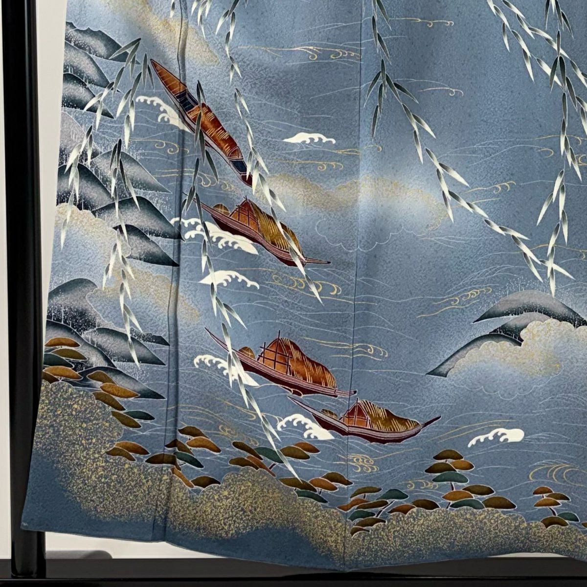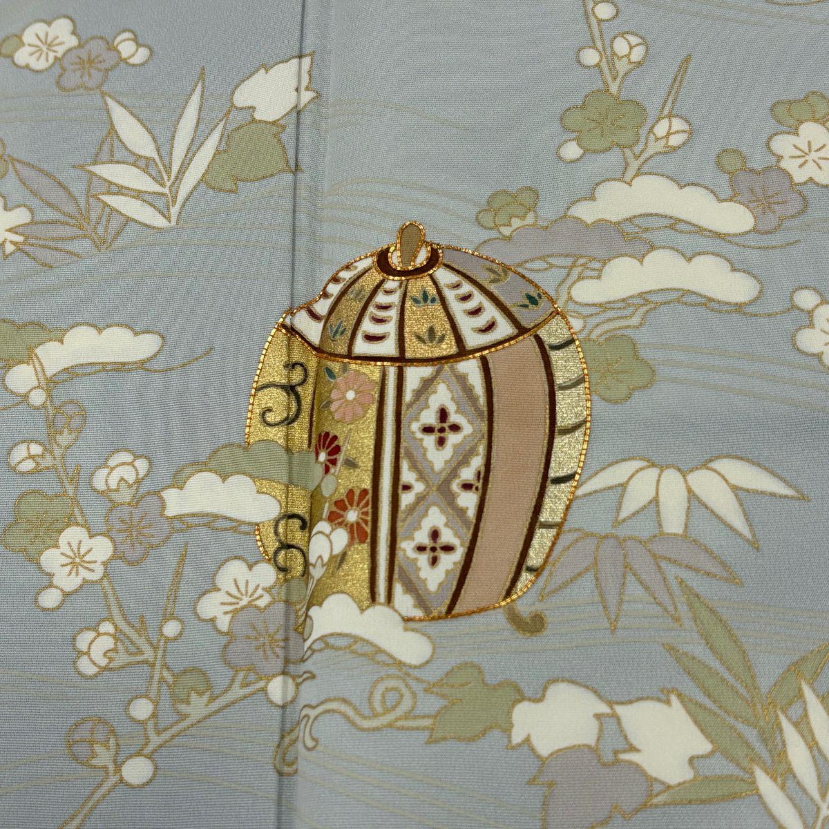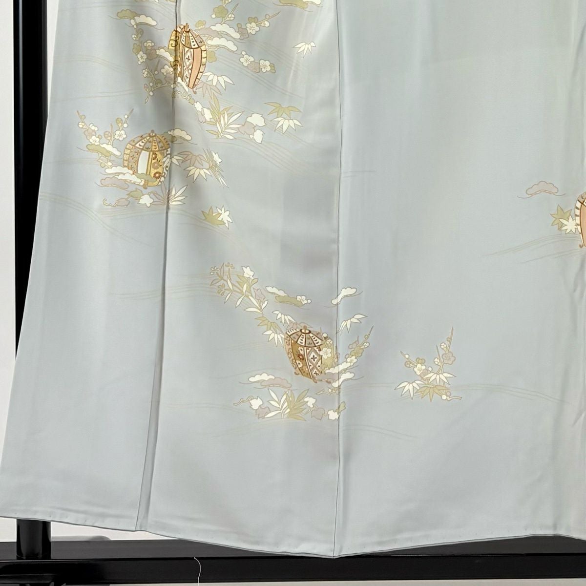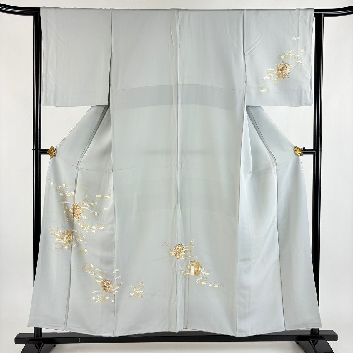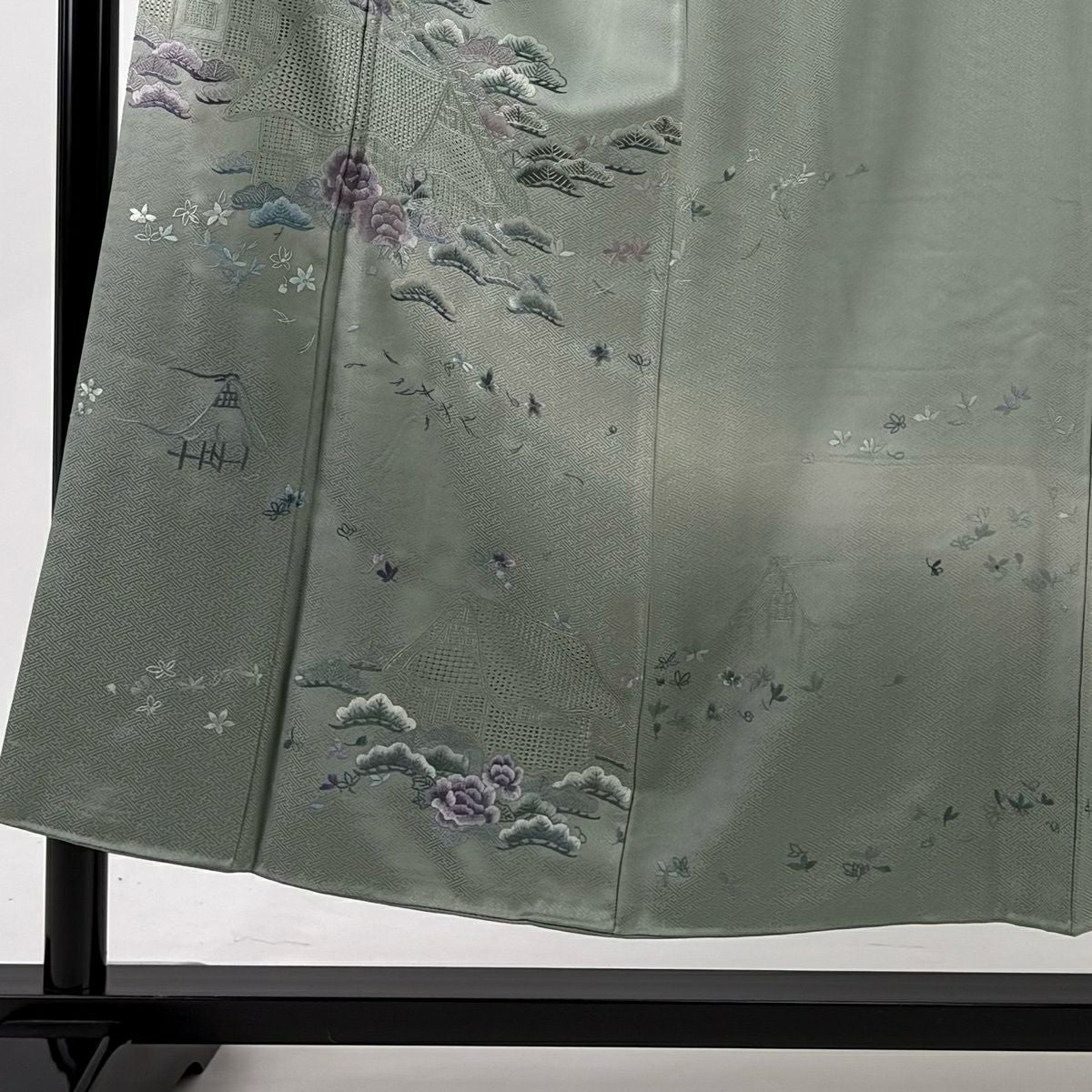 50%OFF 色留袖 身丈165.5cm 裄丈67.5cm L 袷 建物 草花 ぼかし 青灰色 正絹 秀品 一つ紋 K50