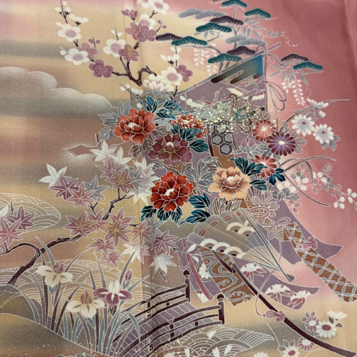 【美品】 振袖 身丈167.5cm 裄丈68cm L 袷 袋帯フルセット 花丸文 菊 金彩 ぼかし ピンク 正絹 秀品