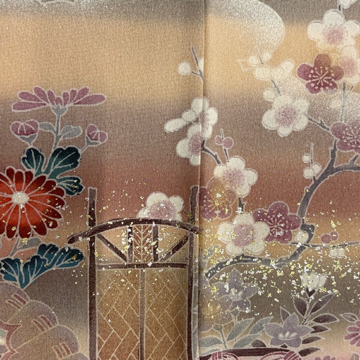 【在庫一掃】 訪問着 身丈158cm 裄丈66cm M 袷 人物 松梅 金彩 ぼかし ベージュ 正絹 秀品 一つ紋