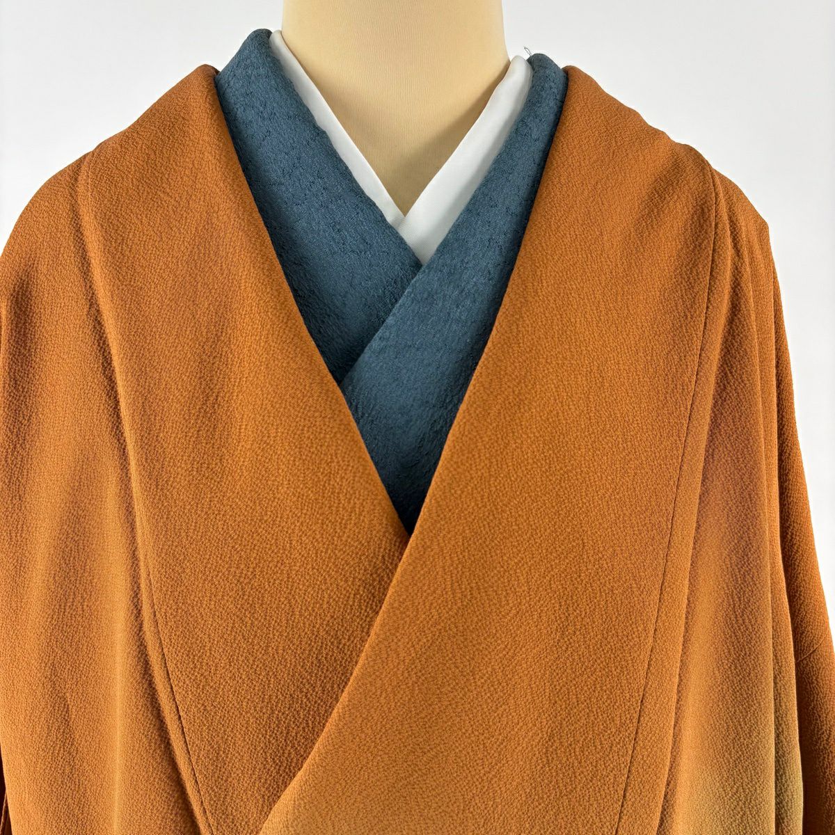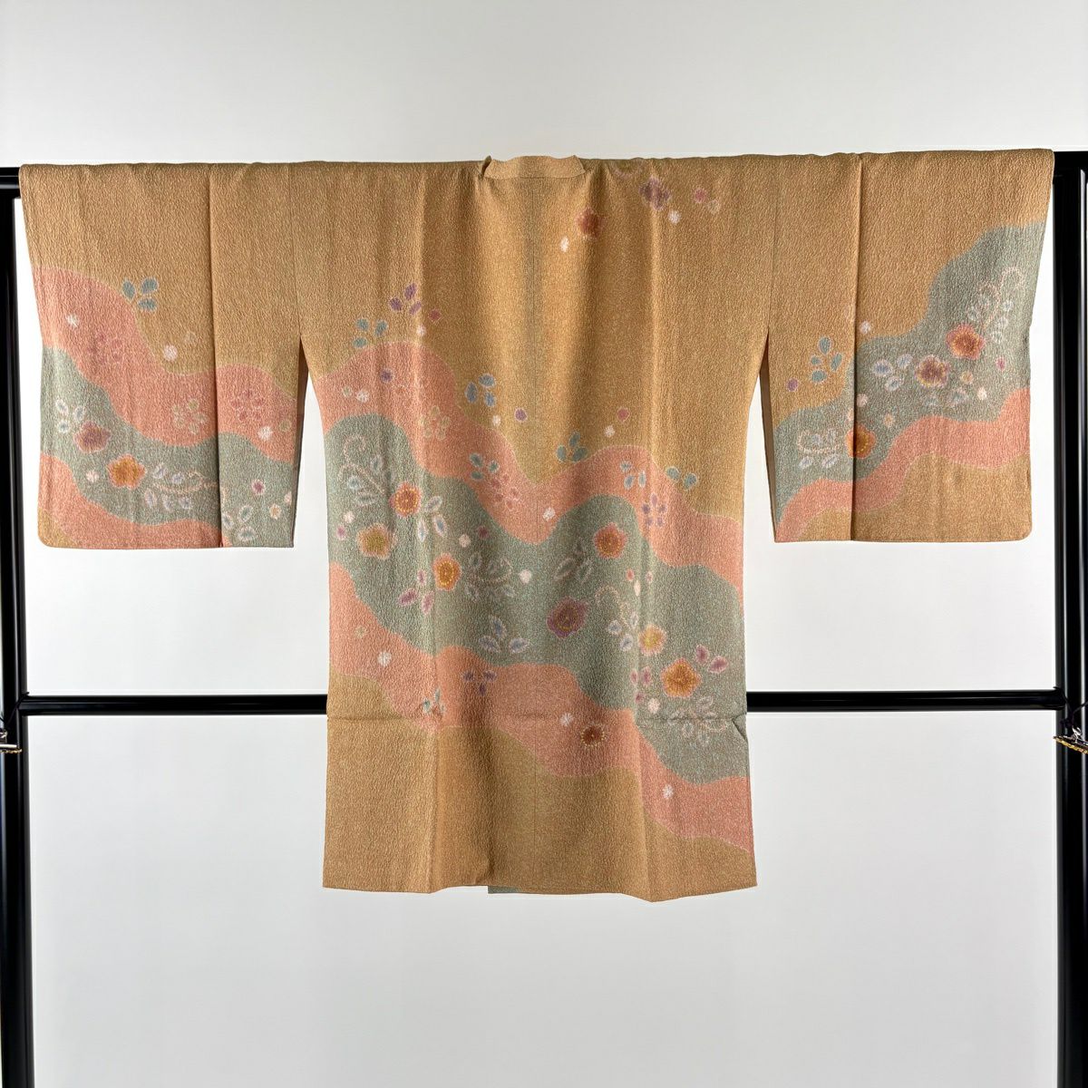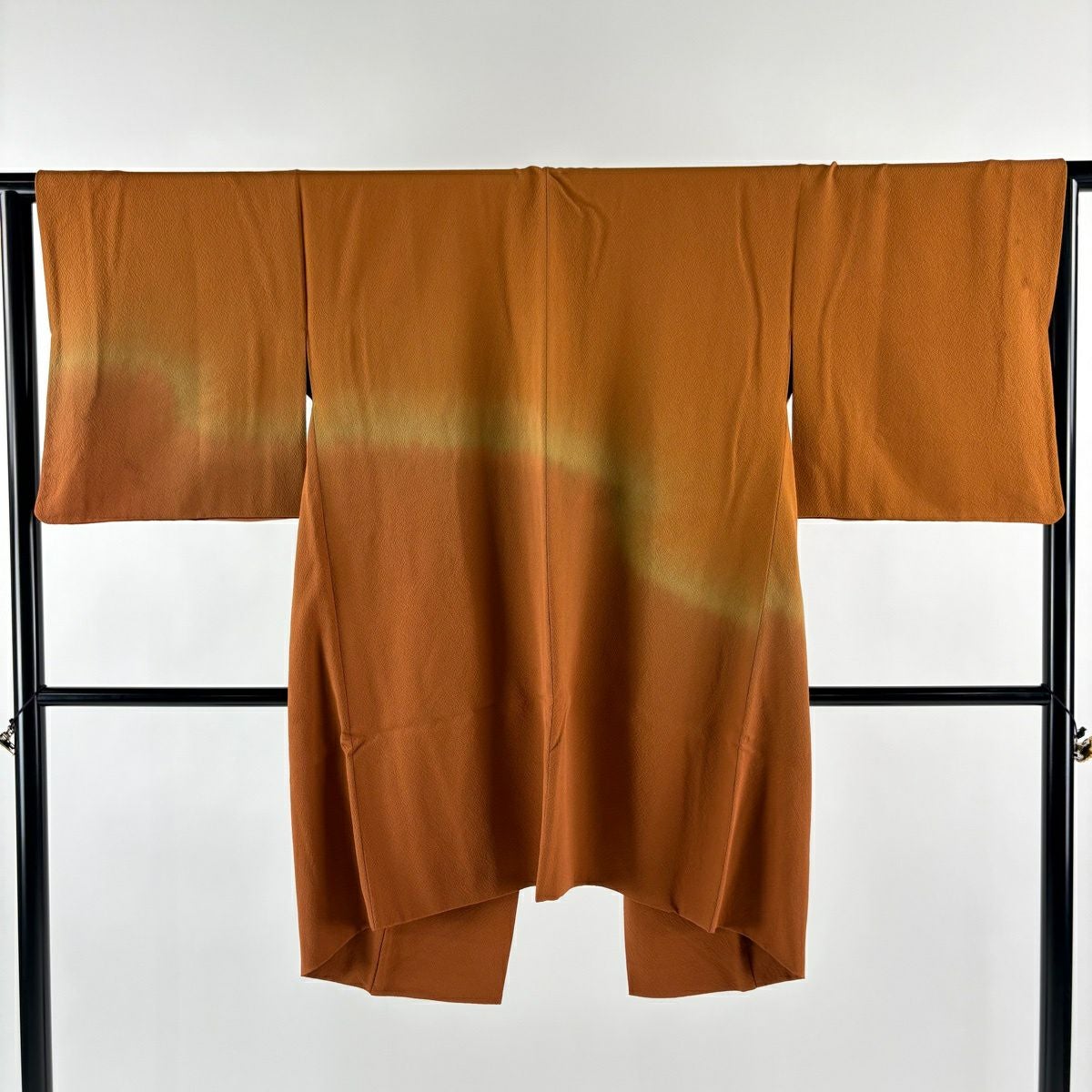【在庫一掃】 小紋 身丈157cm 裄丈64cm M 袷 柿本市郎 落款あり 地紋 松竹梅 黄土色 正絹 秀品 一つ紋