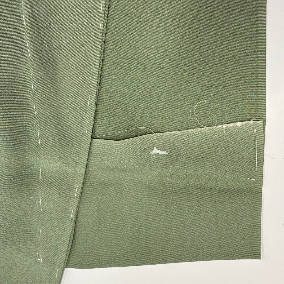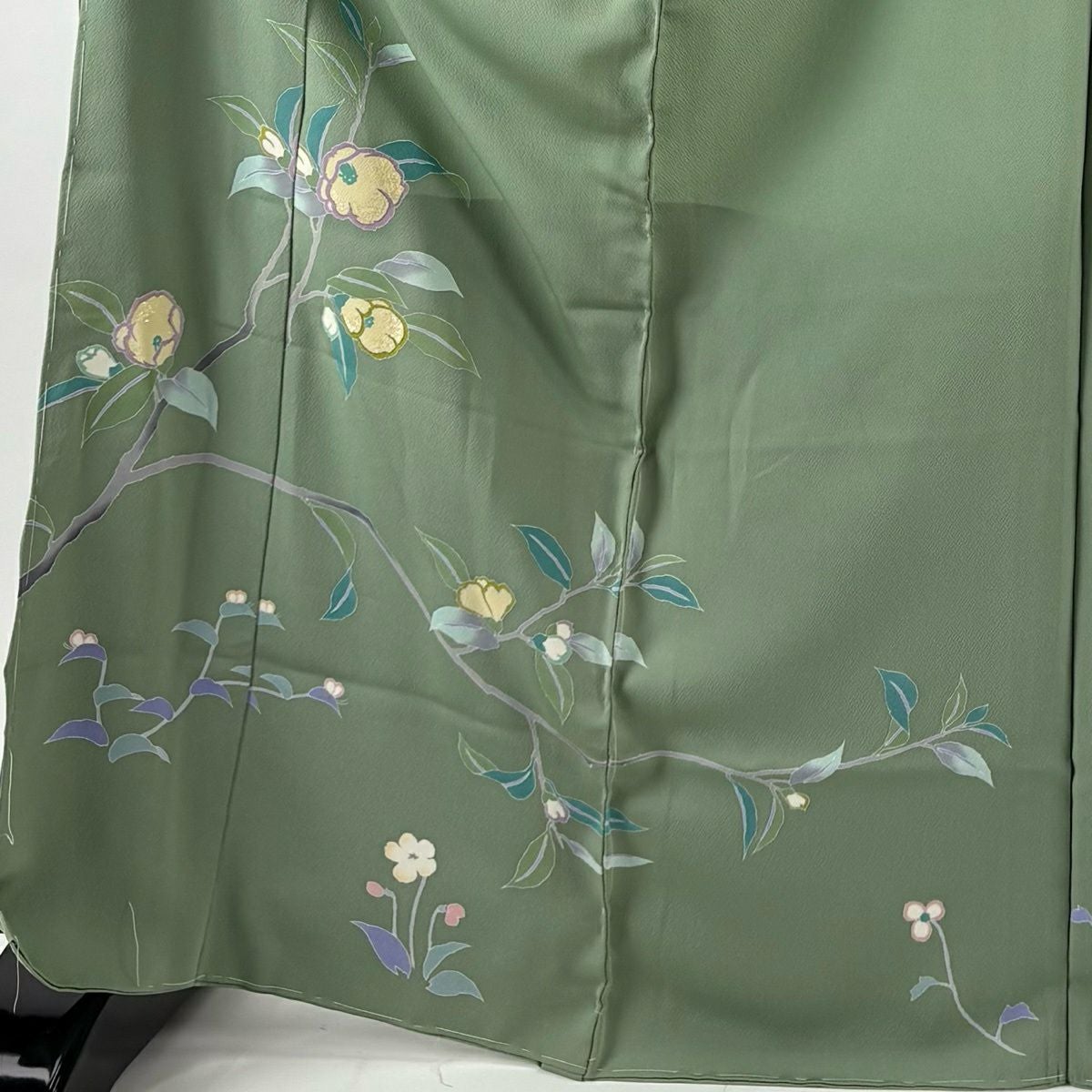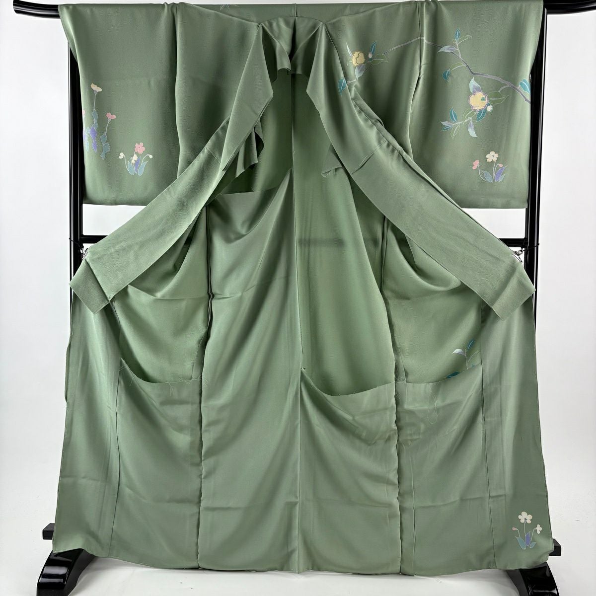 【在庫一掃】 【美品】 訪問着 身丈163cm 裄丈65.5cm M 袷 流水 御所車 金彩 刺繍 よもぎ色 正絹 秀品