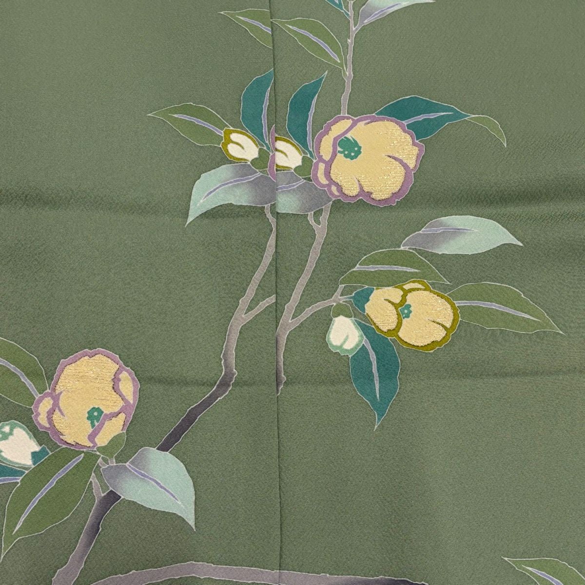 【在庫一掃】 付下げ 身丈155cm 裄丈67.5cm L 袷 鈴乃屋 松竹梅 尾長鳥 金彩 ぼかし 茶緑色 正絹 秀品