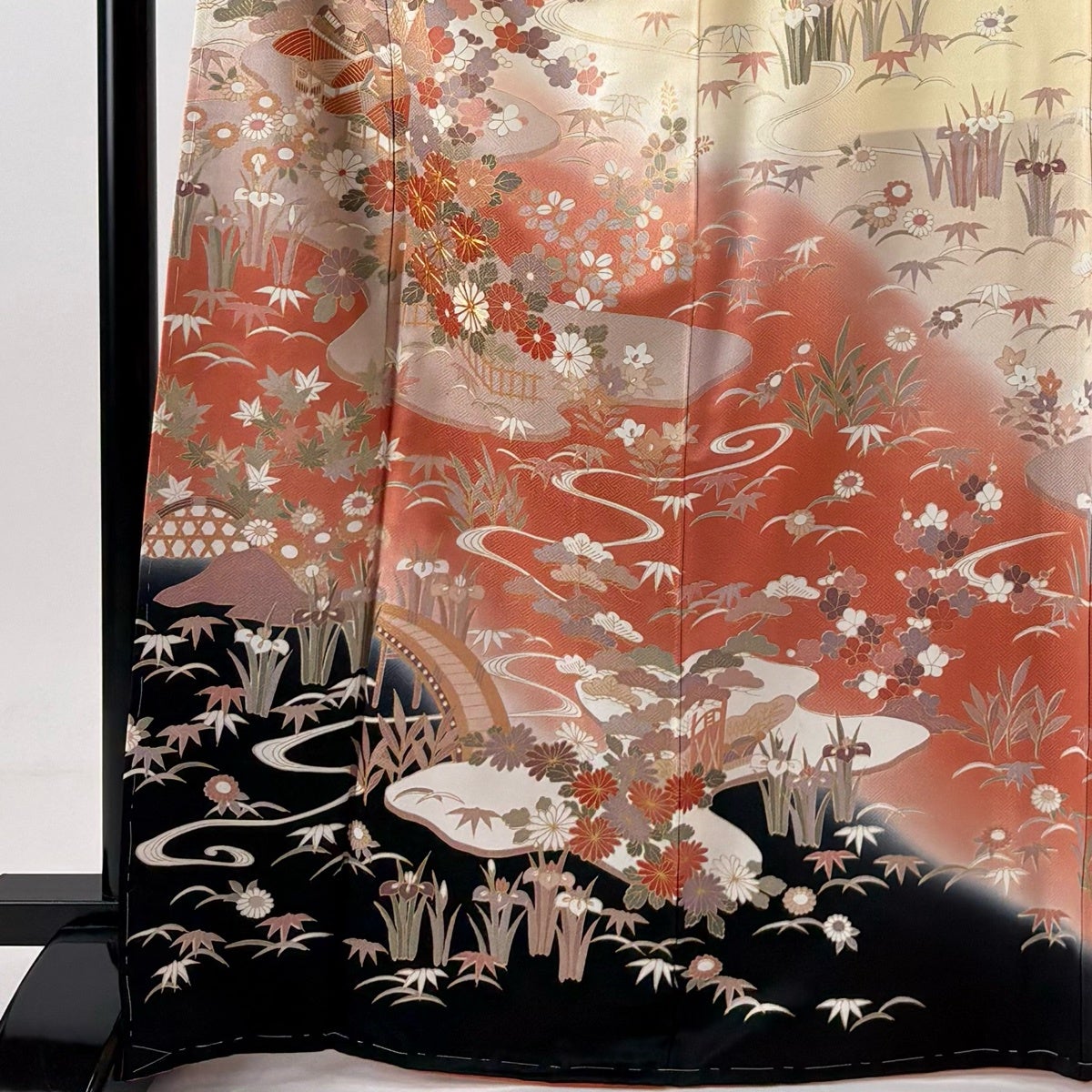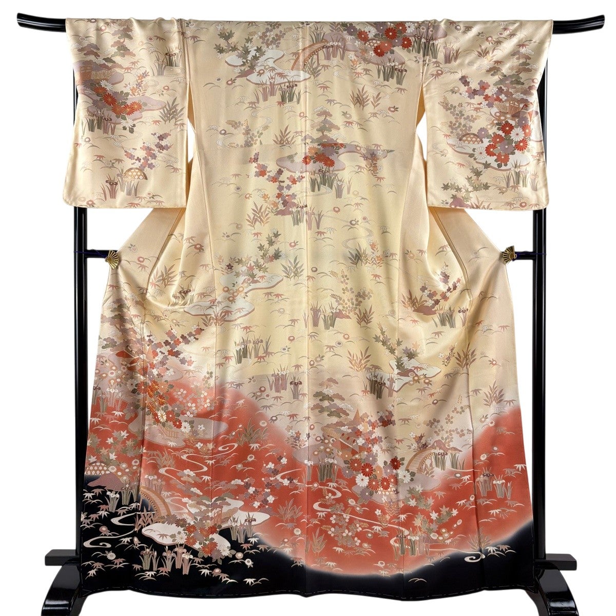 30%OFF 振袖 身丈165cm 裄丈66.5cm M 袷 鶴 菊 金彩 染め分け クリーム 正絹 秀品 K30