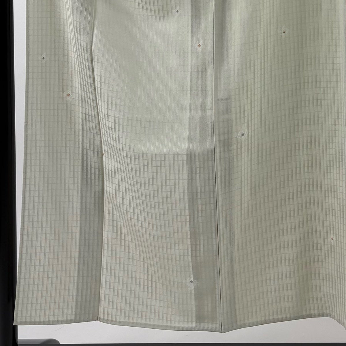 30%OFF 【美品】 小紋 身丈153cm 裄丈63.5cm S 単衣 縦縞 幾何学 灰緑 正絹 秀品 K30