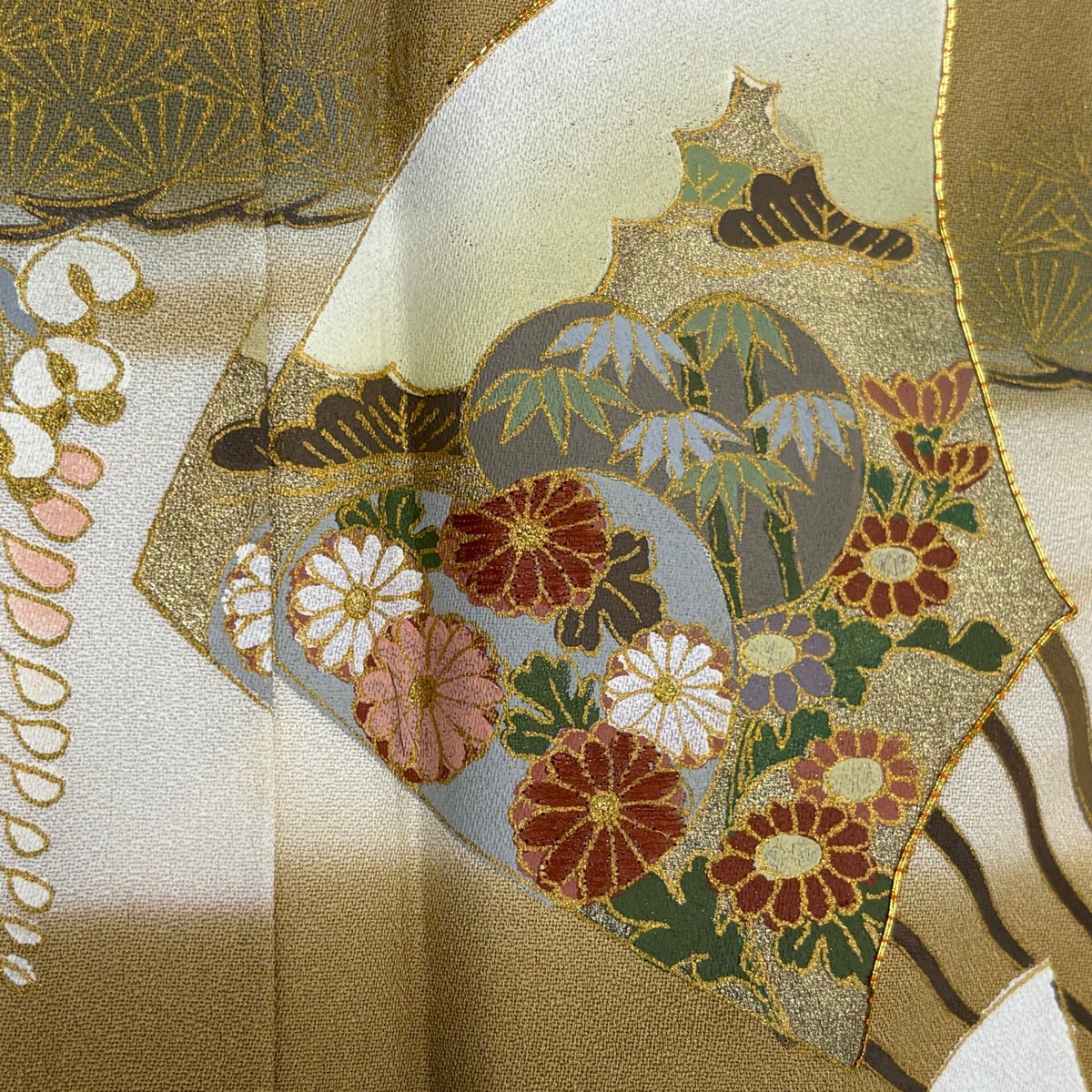 50%OFF 訪問着 身丈167cm 裄丈66.5cm M 袷 牡丹 梅 金糸 絞り 茶緑色 正絹 秀品 K50