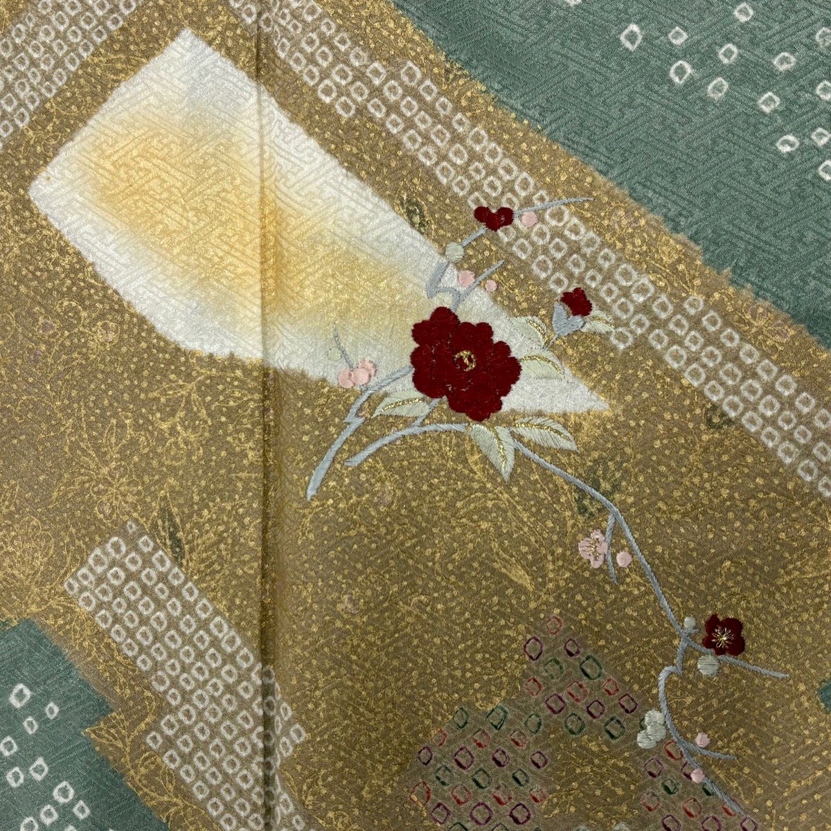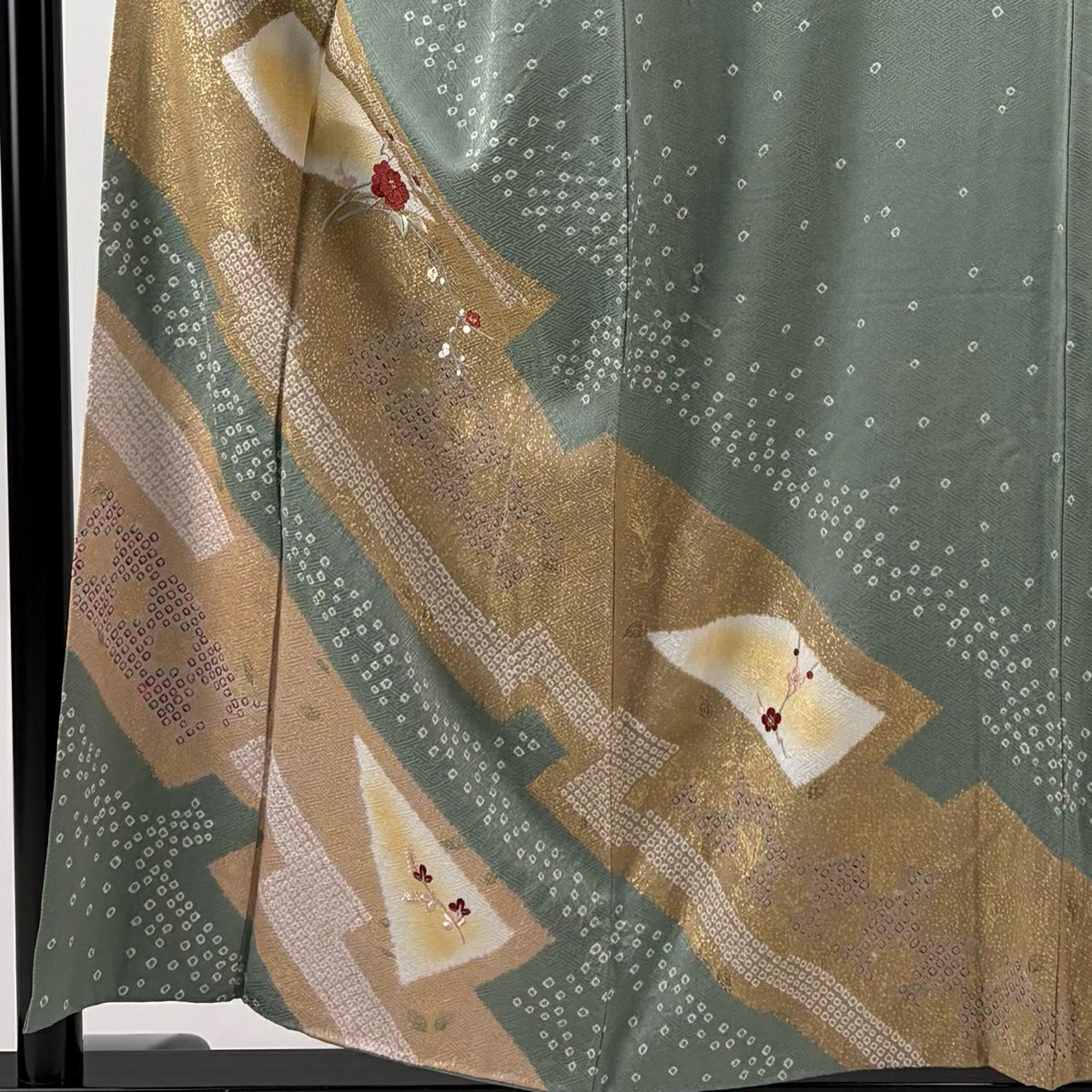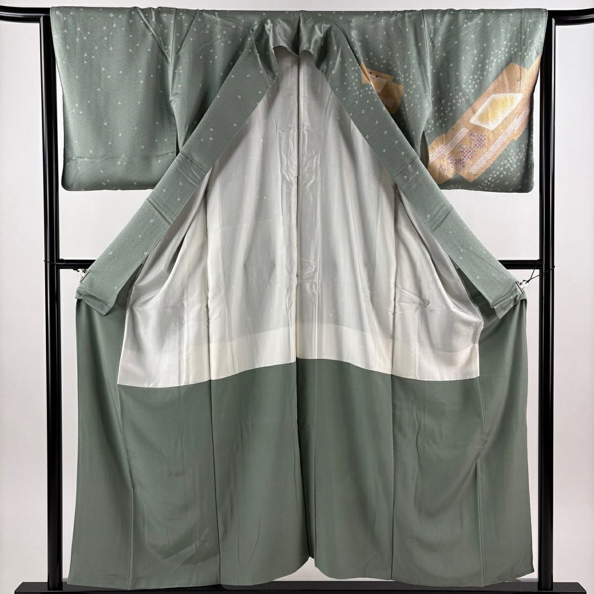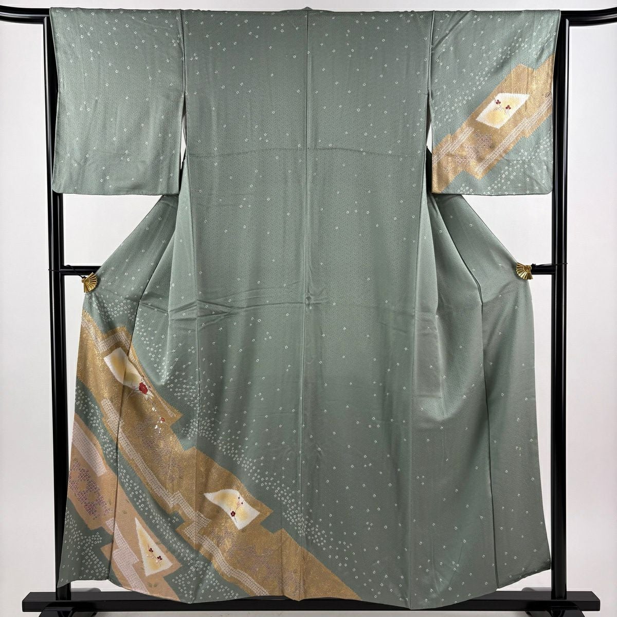 30%OFF 【美品】 訪問着 身丈155cm 裄丈64.5cm M 袷 椿 幾何学 刺繍 絞り 灰緑 正絹 秀品 K30