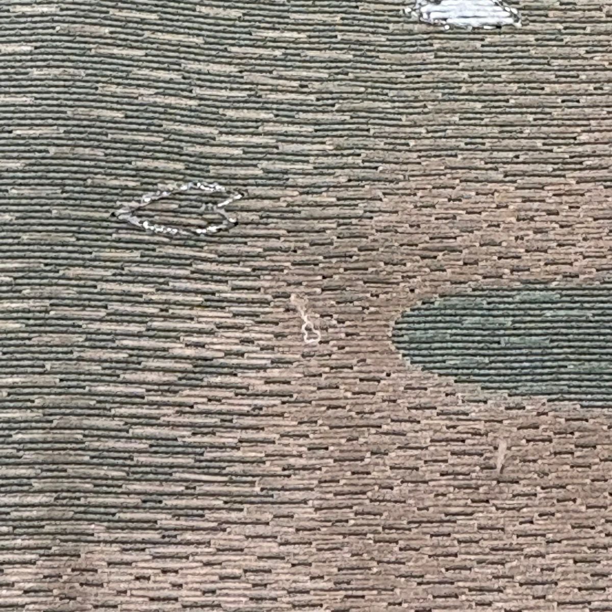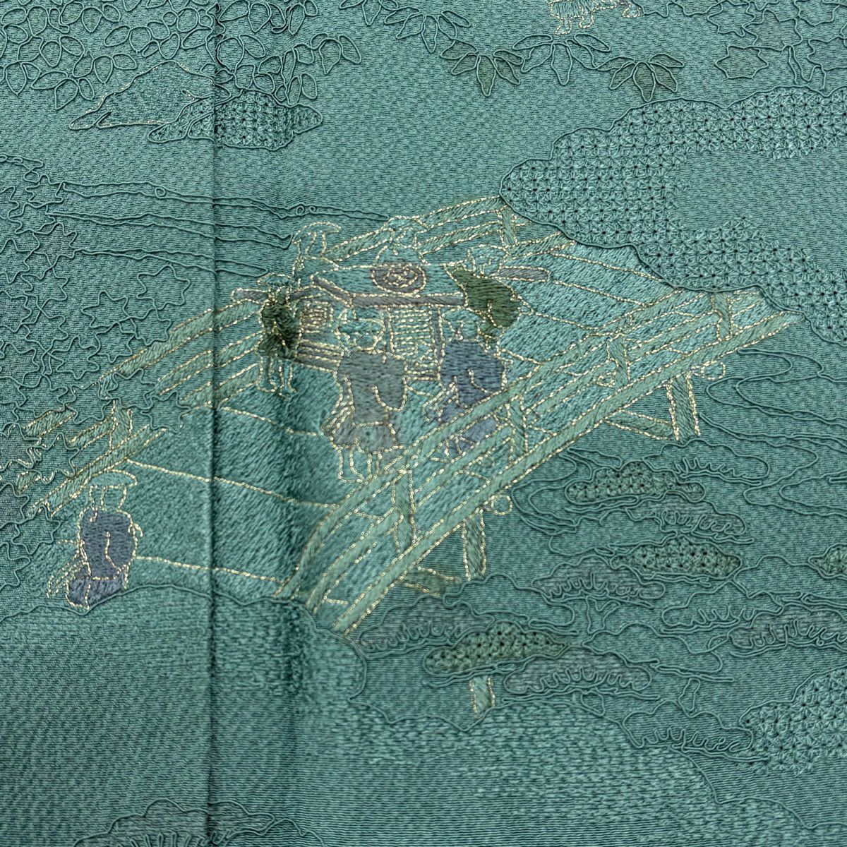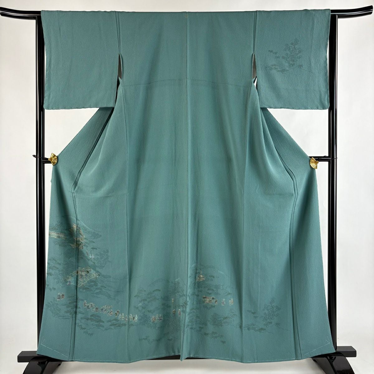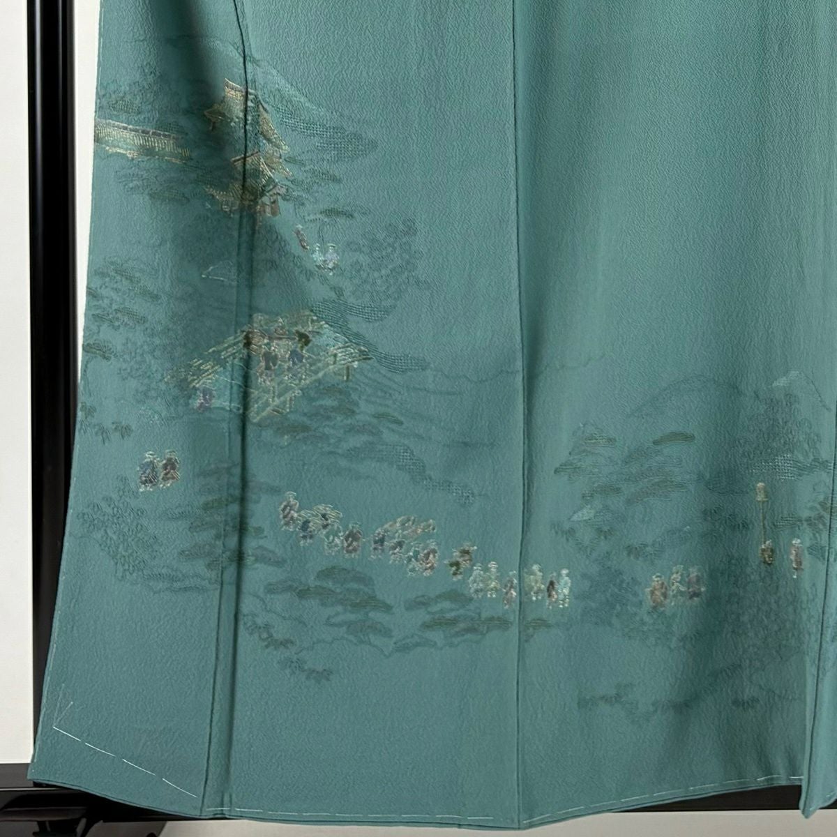30%OFF 付下げ 身丈159.5cm 裄丈64cm M 袷 建物 人物 刺繍 金糸 灰緑 正絹 秀品 一つ紋 K30