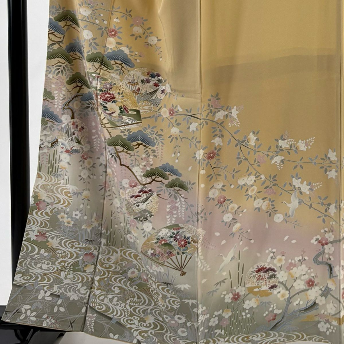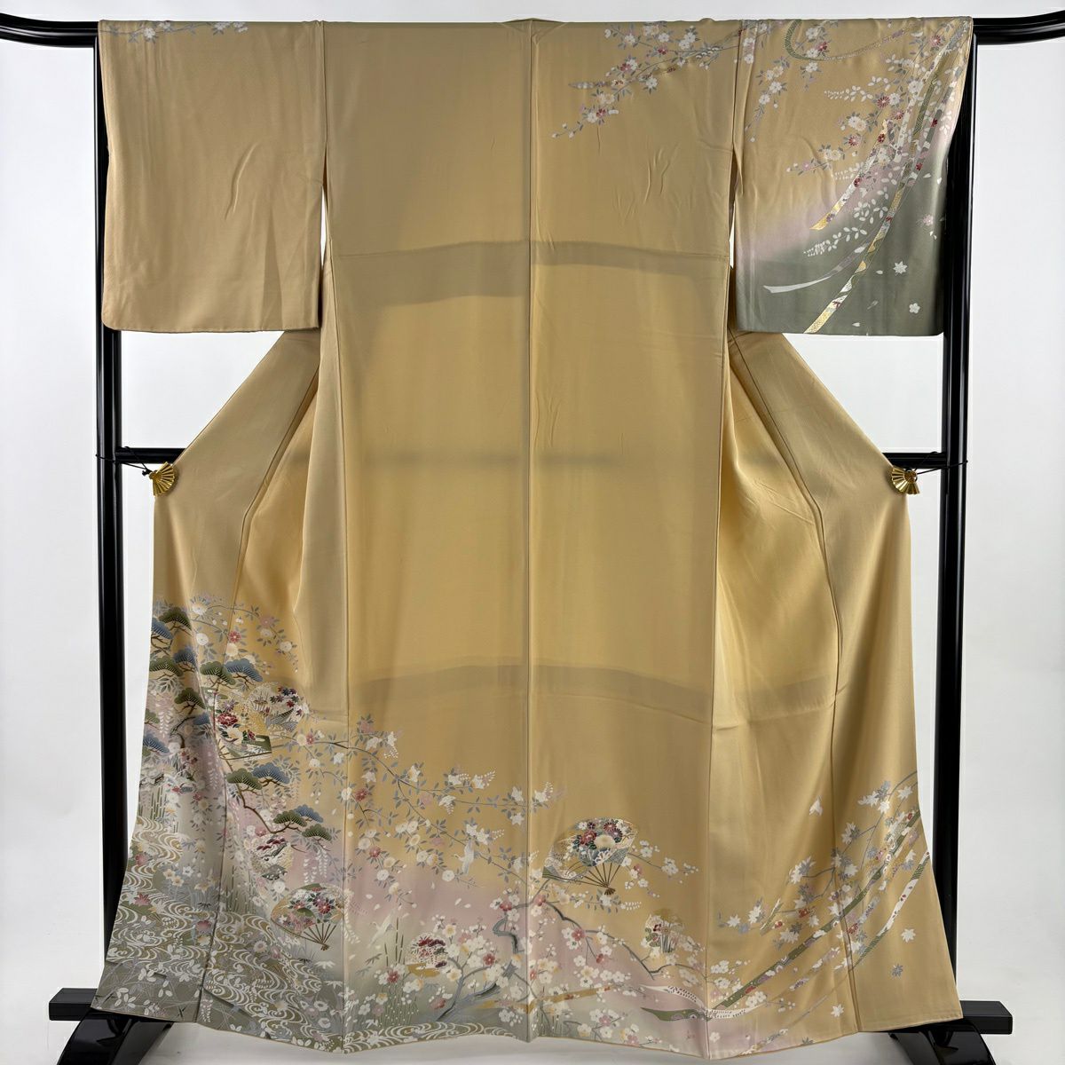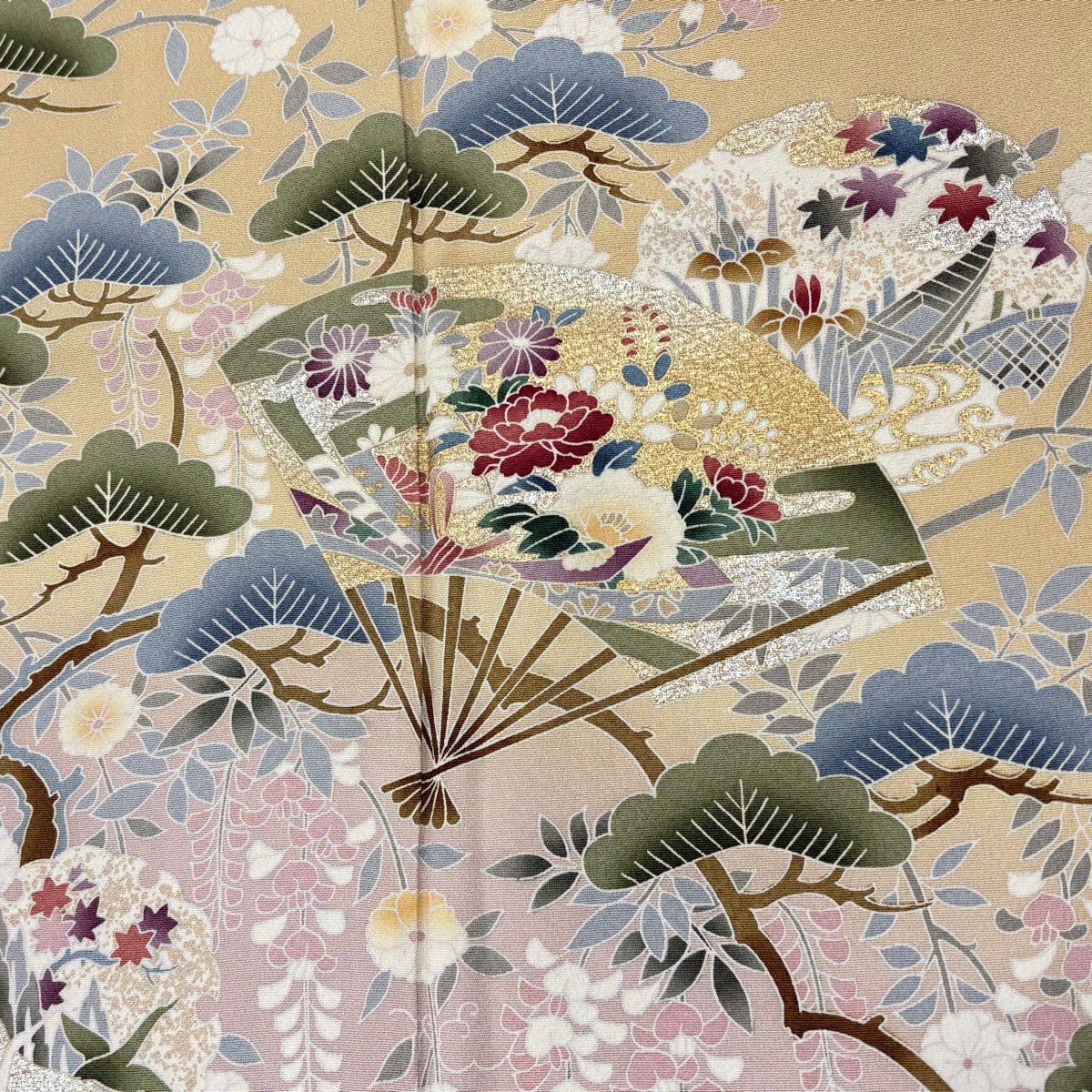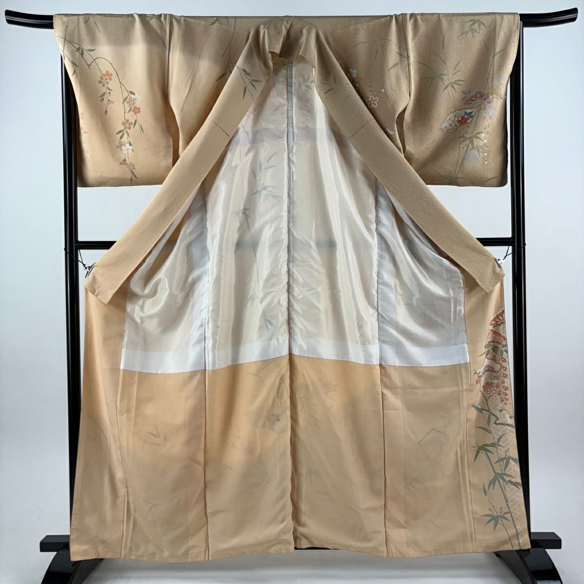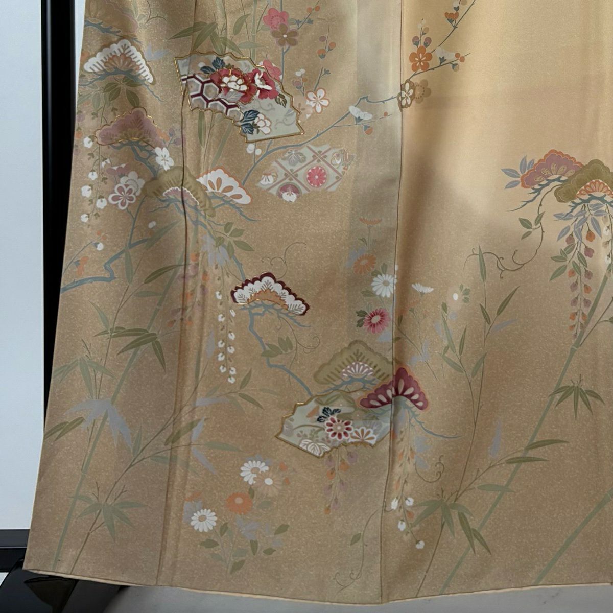 30%OFF 訪問着 身丈162cm 裄丈67.5cm L 袷 松竹梅 扇面 金糸 金彩 ベージュ 正絹 秀品 K30