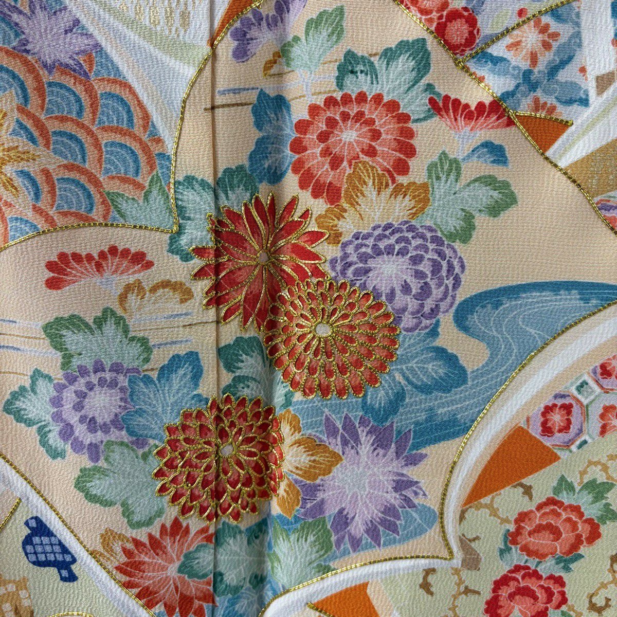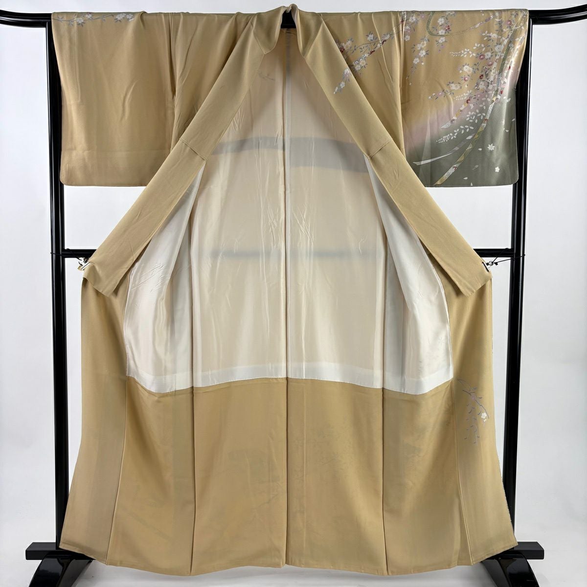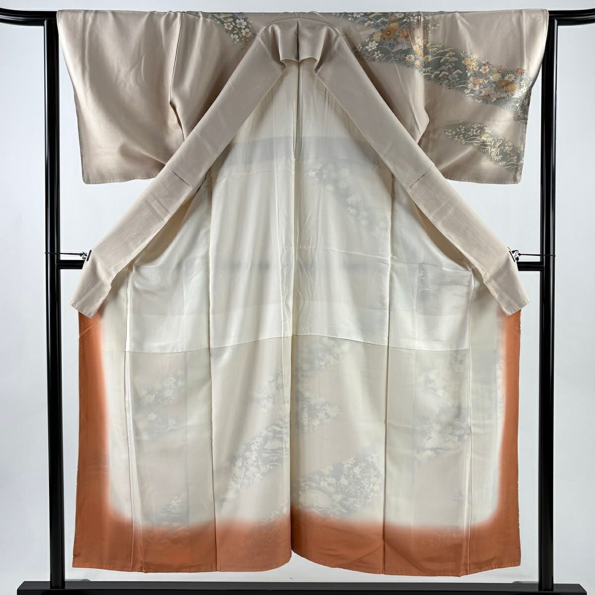 30%OFF 訪問着 身丈160cm 裄丈67cm M 袷 扇 草花 金銀彩 染め分け ベージュ 正絹 秀品 K30
