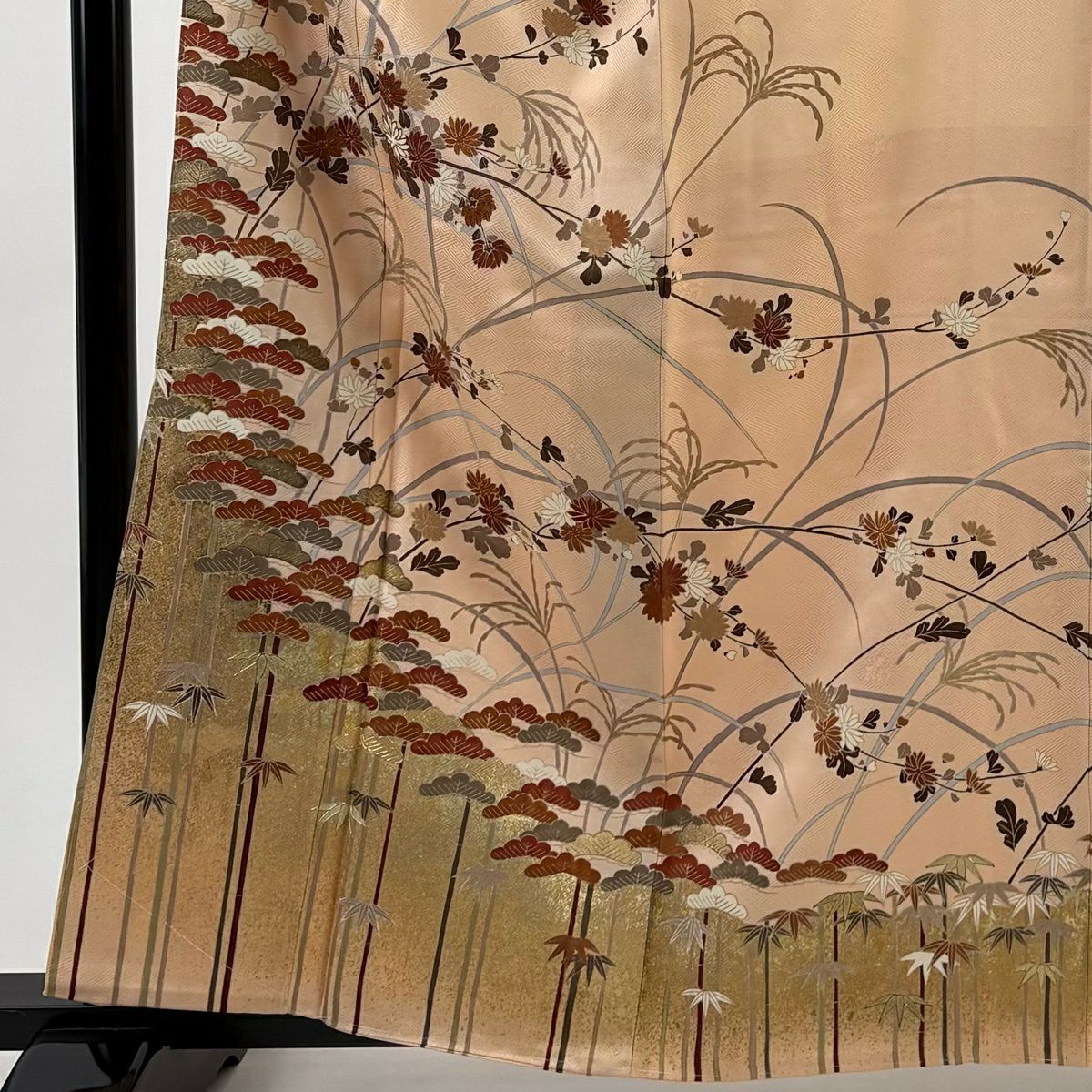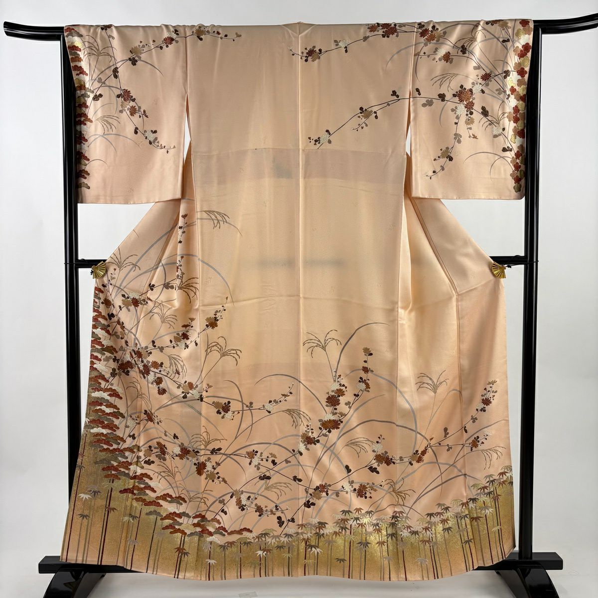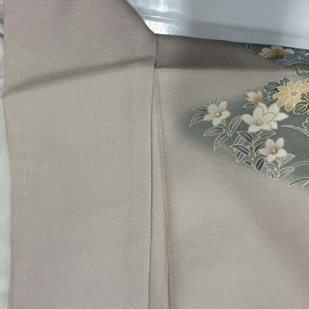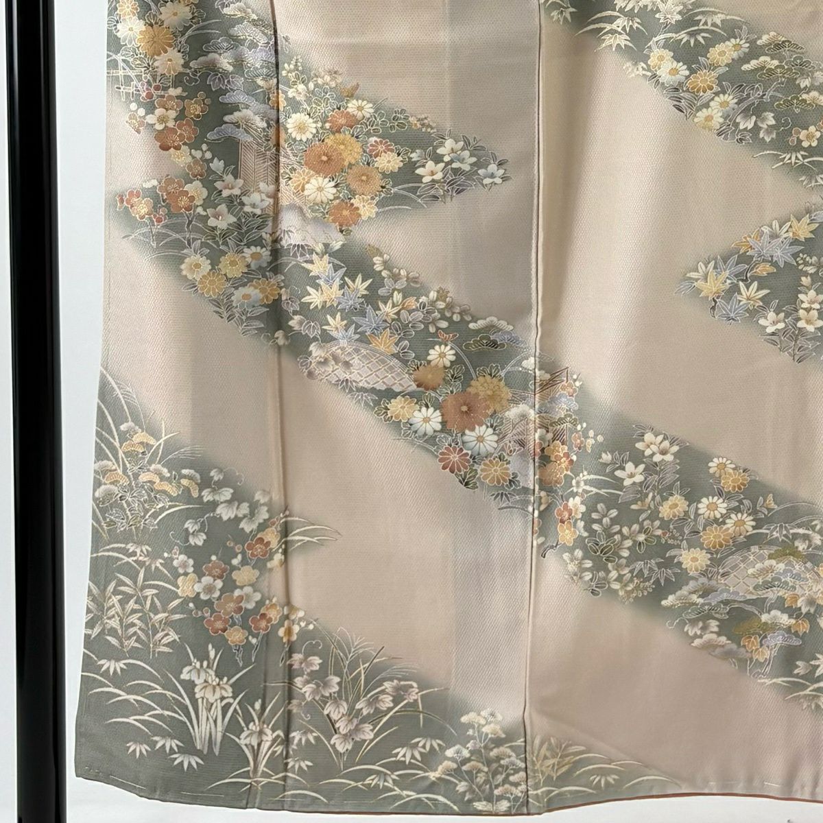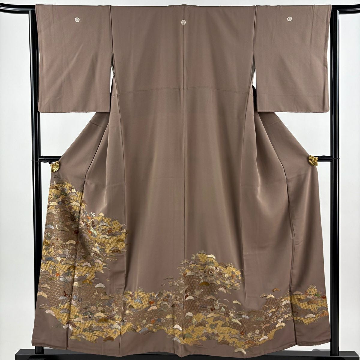 30%OFF 【美品】 訪問着 身丈152.5cm 裄丈64cm M 袷 秋草 松竹梅 金彩 薄茶色 正絹 秀品 K30