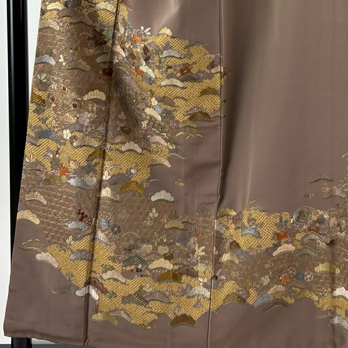 30%OFF 色留袖 身丈157cm 裄丈64.5cm M 袷 松梅 籠目 金糸 刺繍 茶色 正絹 秀品 一つ紋 K30