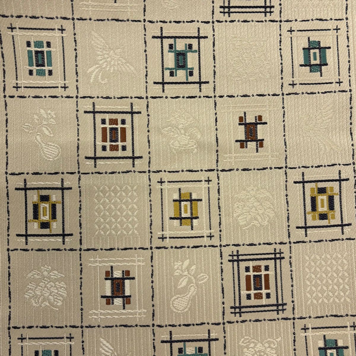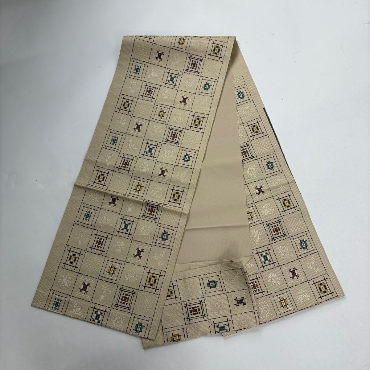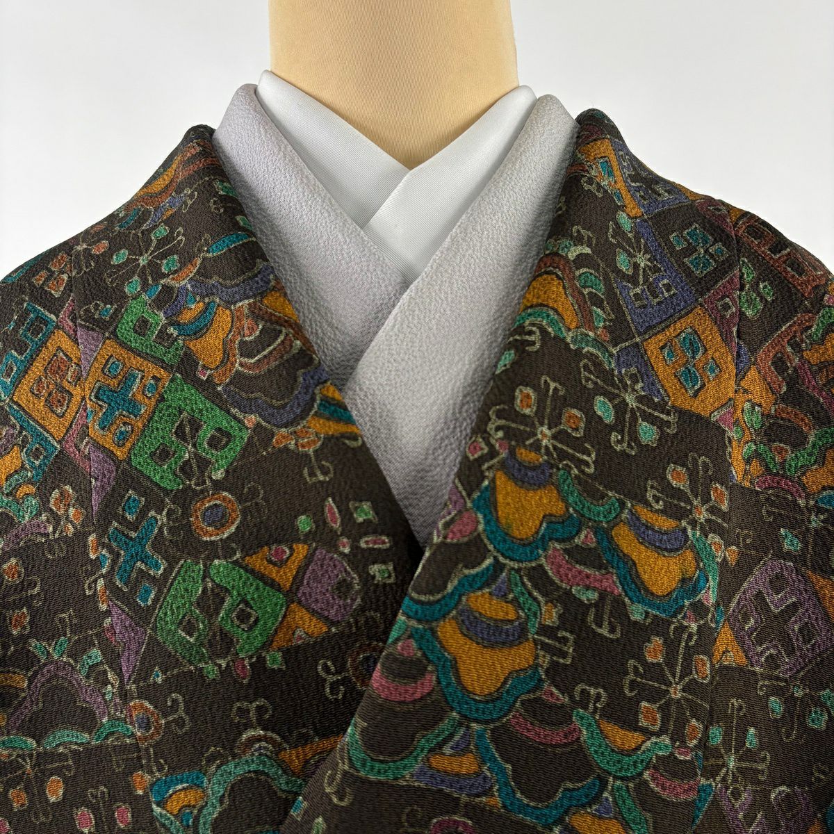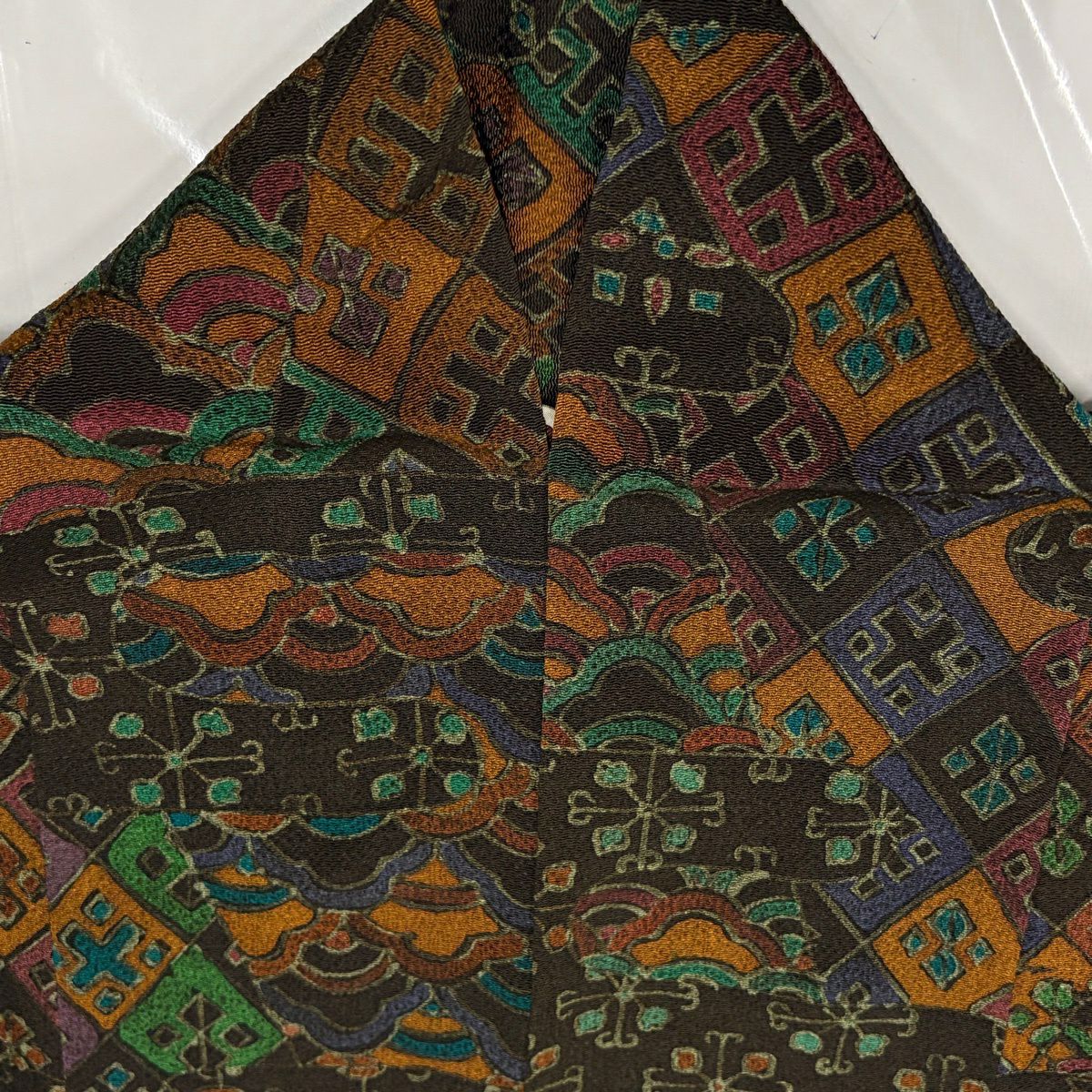 30%OFF 【美品】 紬 身丈160cm 裄丈65cm M 袷 名古屋帯セット 幾何学模様 焦茶色 正絹 秀品 K30