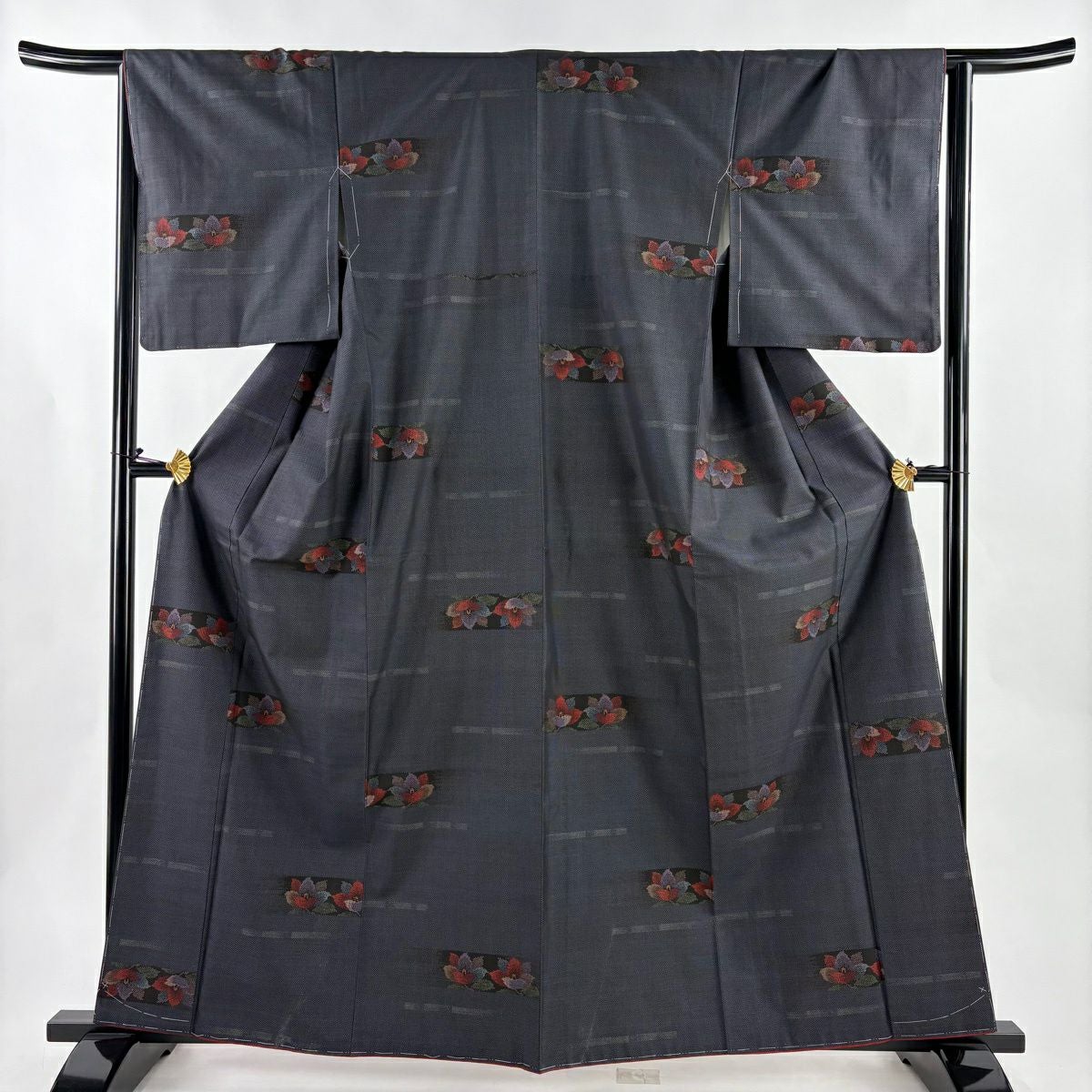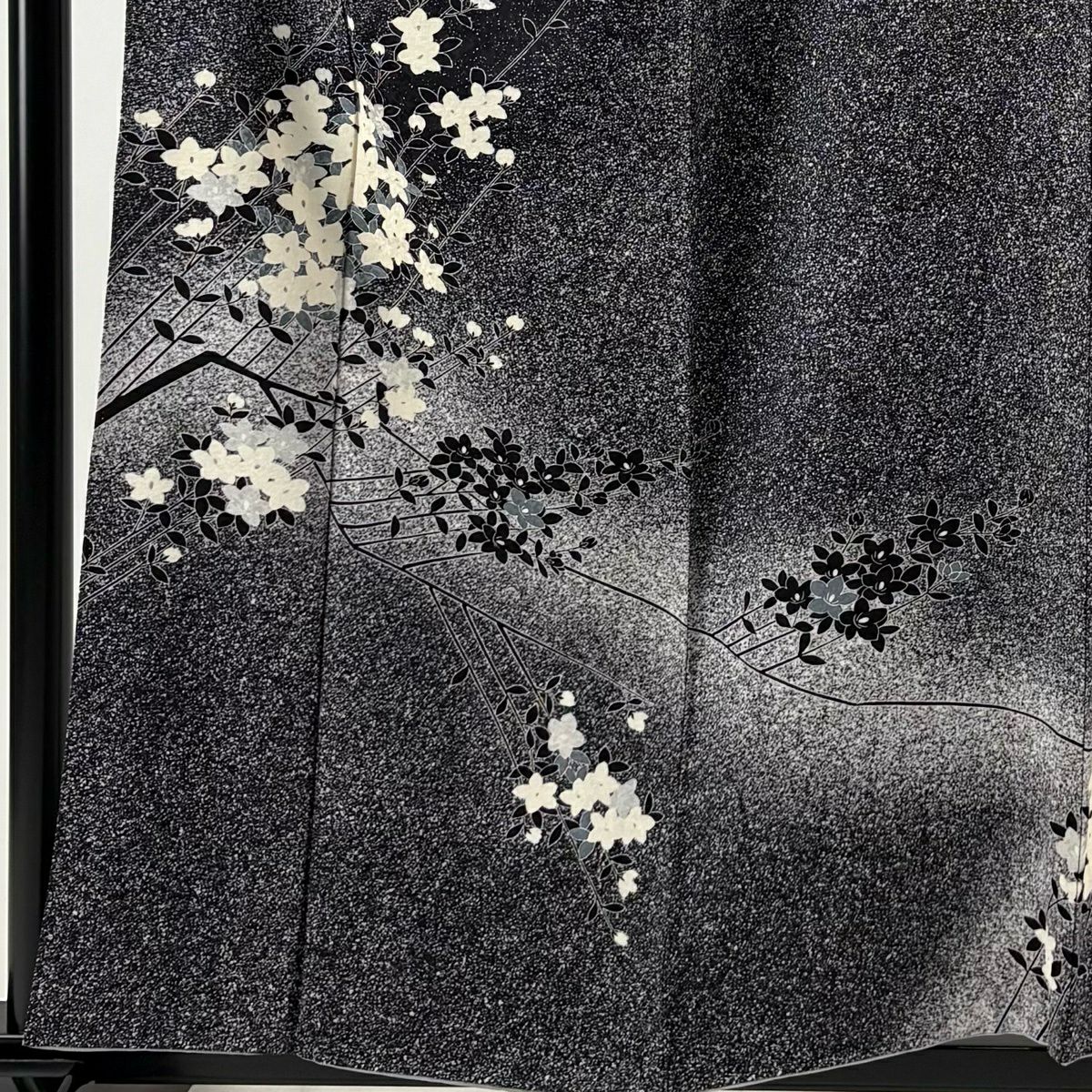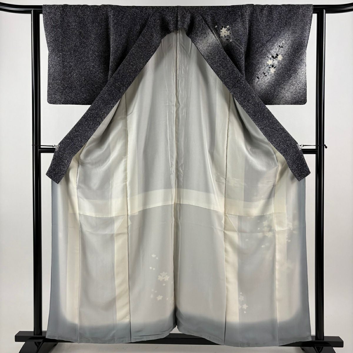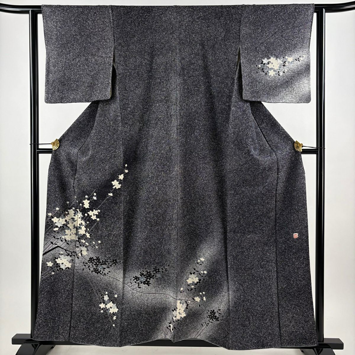 30%OFF 訪問着 身丈157.5cm 裄丈61.5cm S 袷 落款あり 枝花 幾何学 ぼかし 黒灰 正絹 秀品 K30