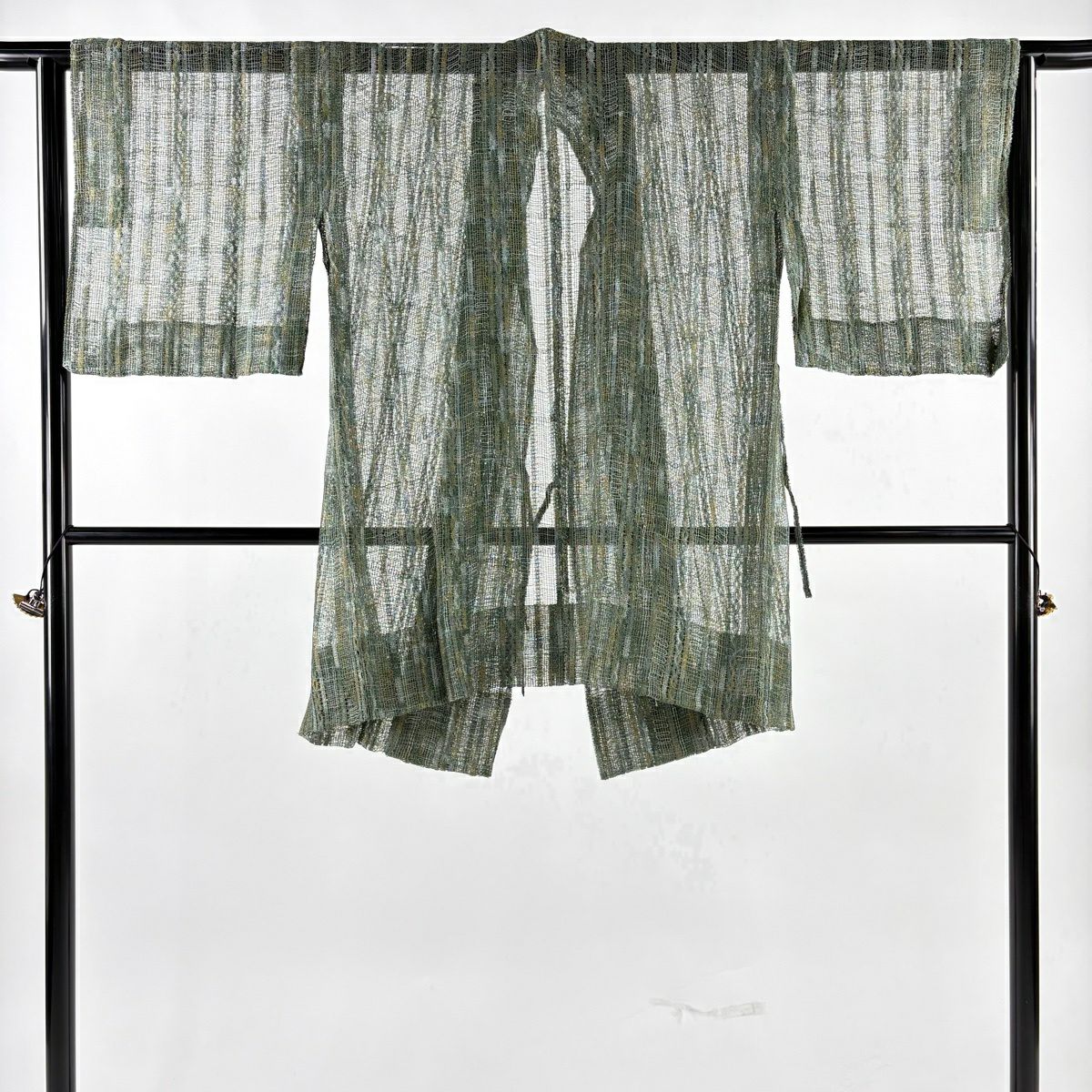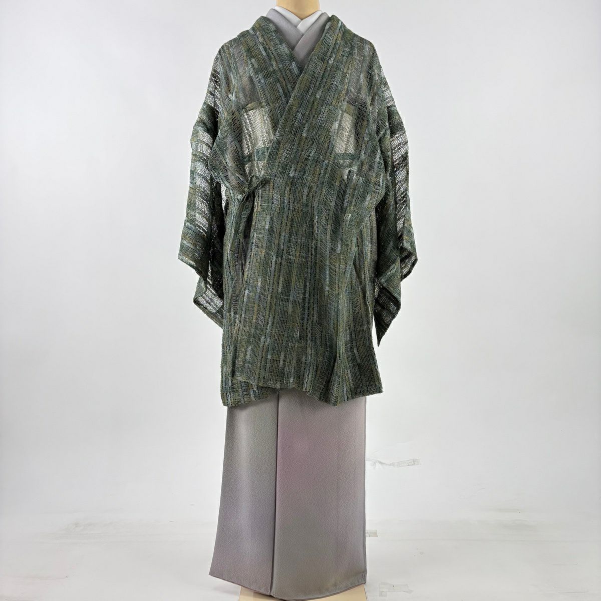 30%OFF 【美品】 道中着 身丈90cm 裄丈66cm M 和装コート 縞 幾何学模様 よもぎ色 正絹 秀品 K30