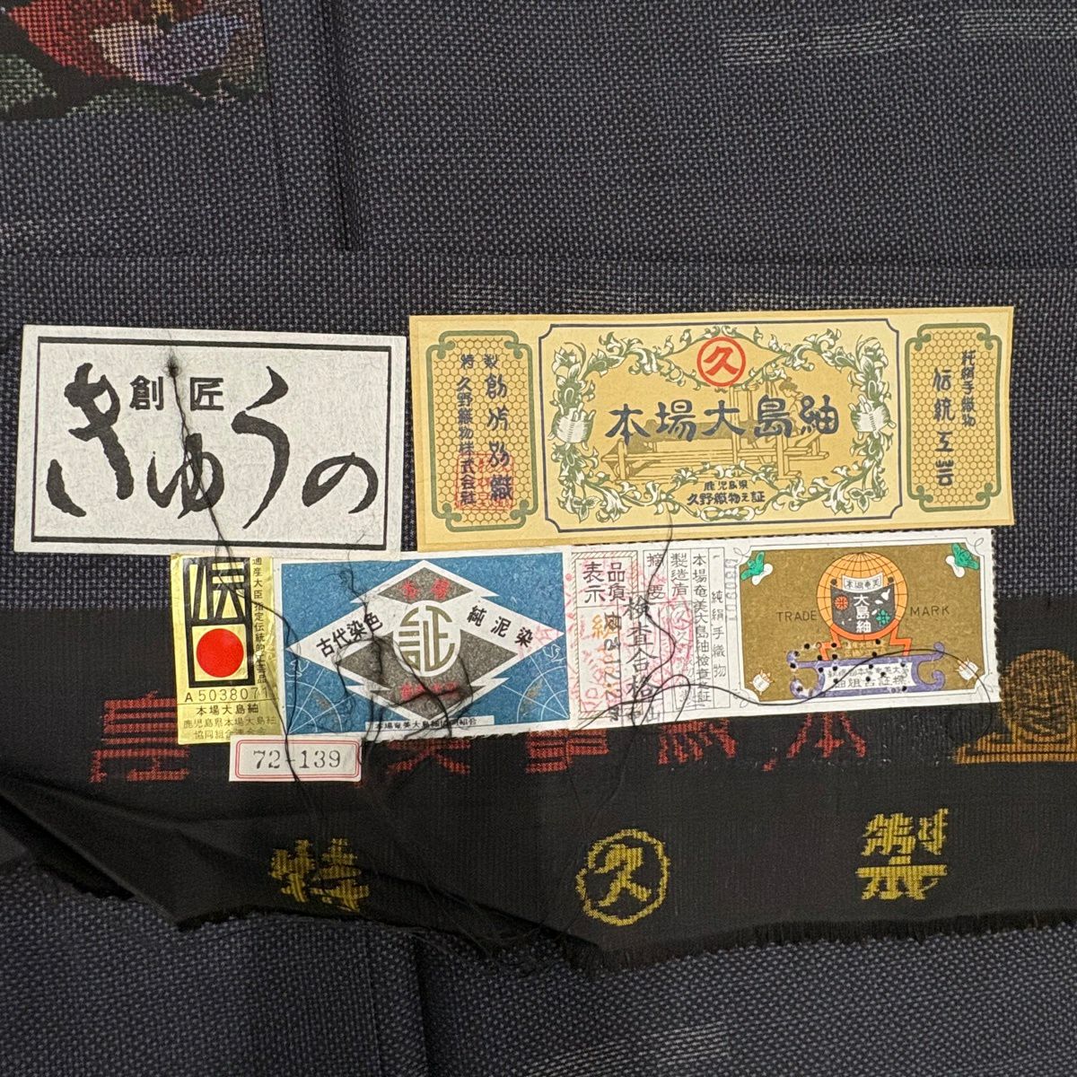 30%OFF 【美品】 大島紬 身丈162.5cm 裄丈65cm M 袷 純泥染 証紙あり 草花 紺色 正絹 秀品 K30
