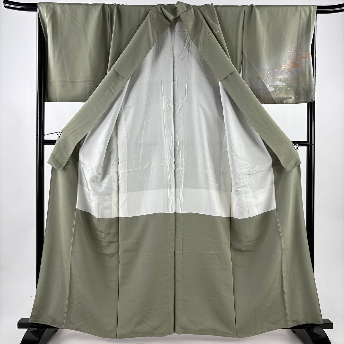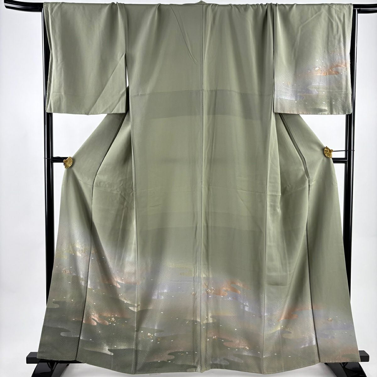 30%OFF 訪問着 身丈161cm 裄丈71cm L 袷 やまと 草花 霞ぼかし 金銀糸 刺繍 灰緑 正絹 秀品 K30