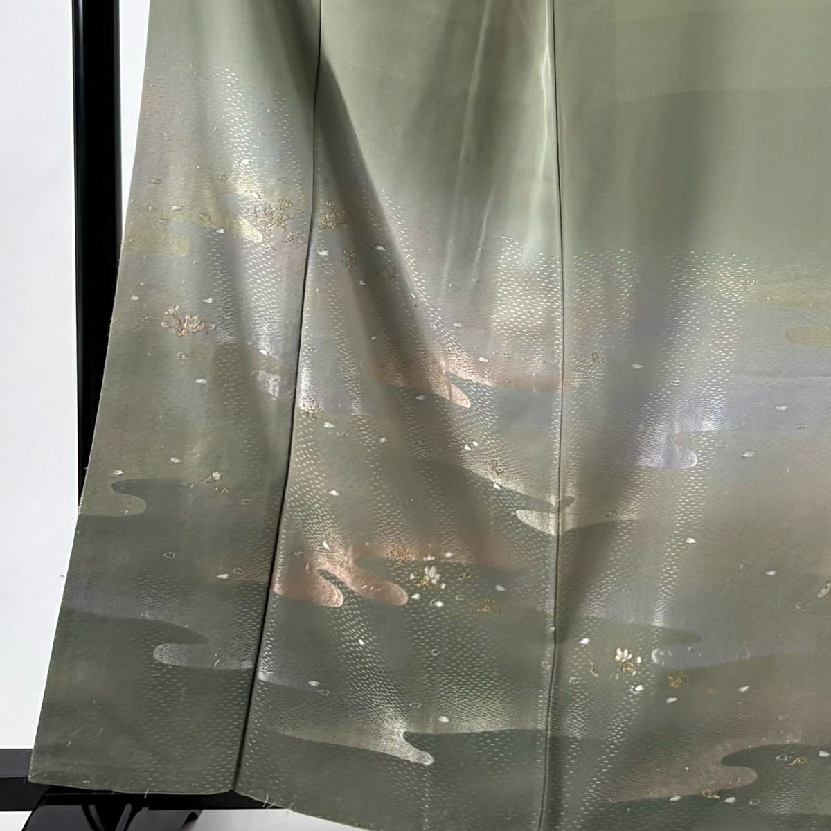 30%OFF 付下げ 身丈154cm 裄丈64cm M 袷 落款あり 花びら 石畳 金彩 ぼかし 深緑 正絹 秀品 K30