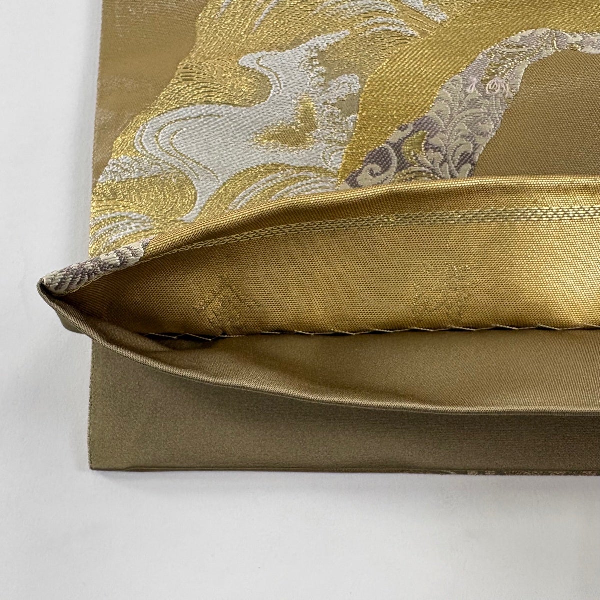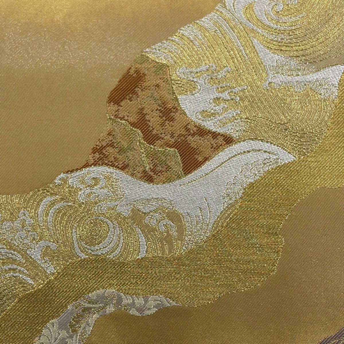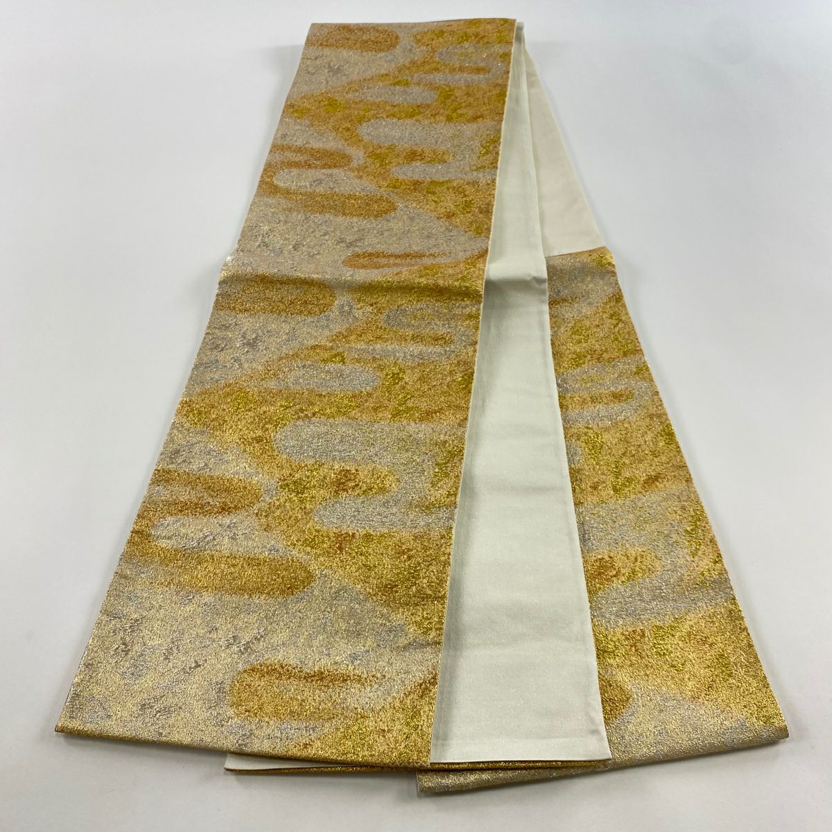 【美品】 袋帯 秀品 道長取り 波 金糸 箔 金色 六通 正絹