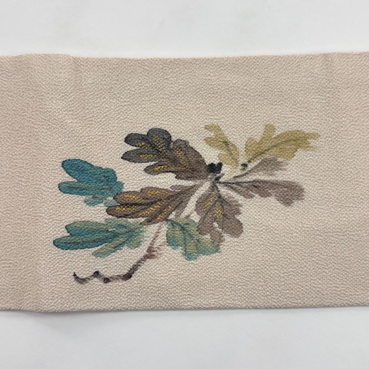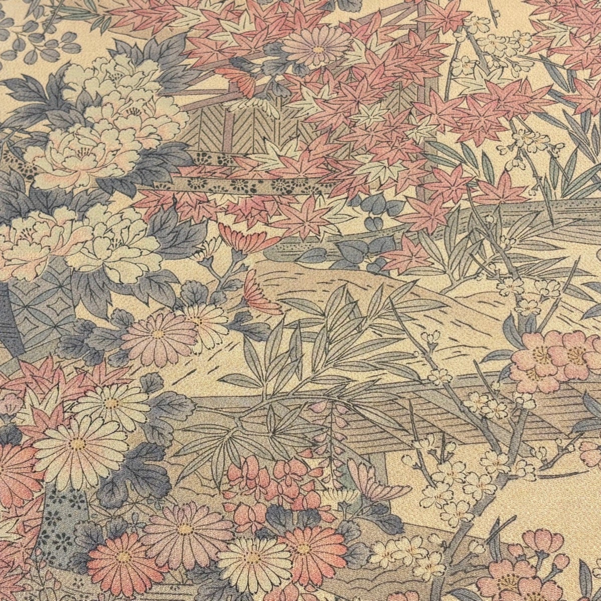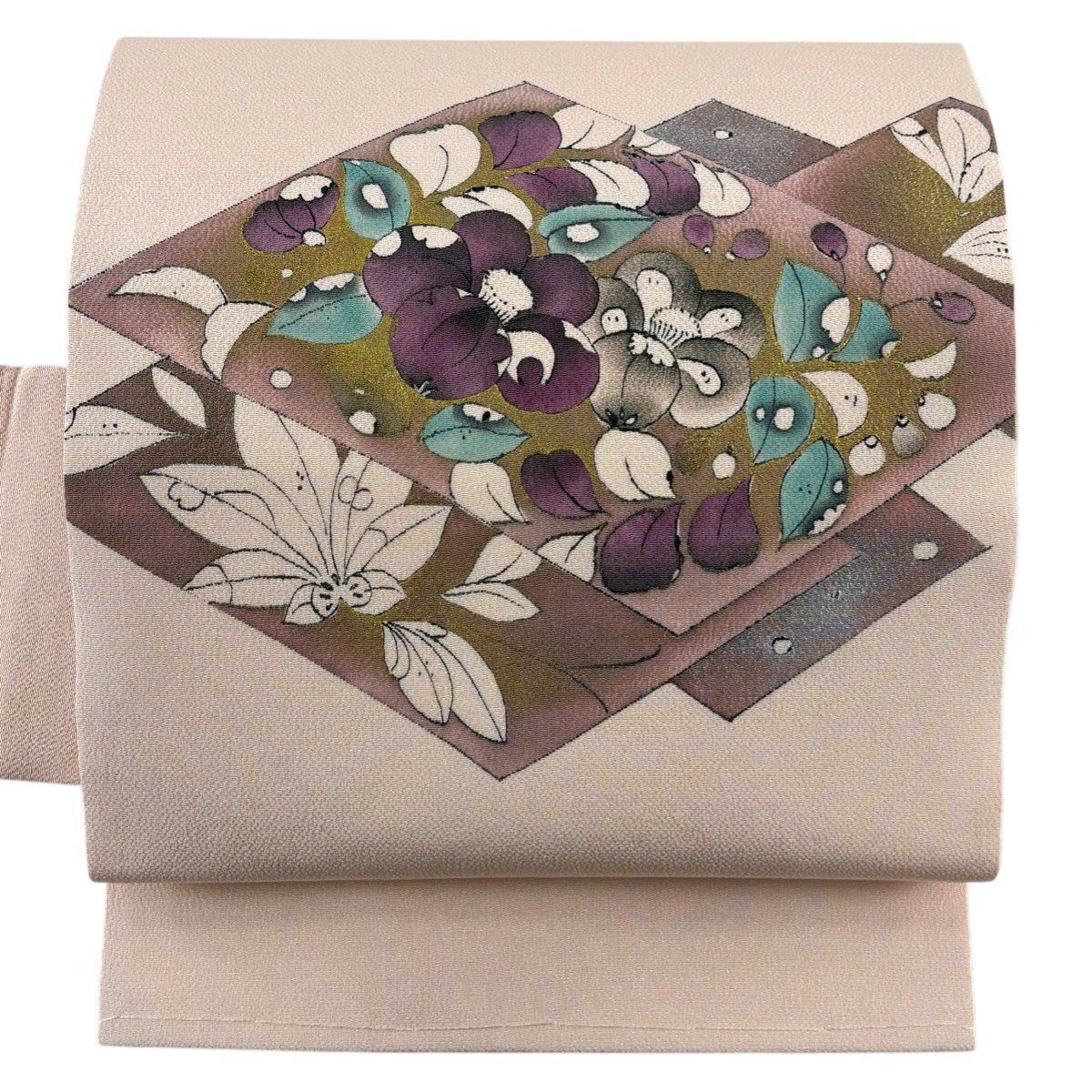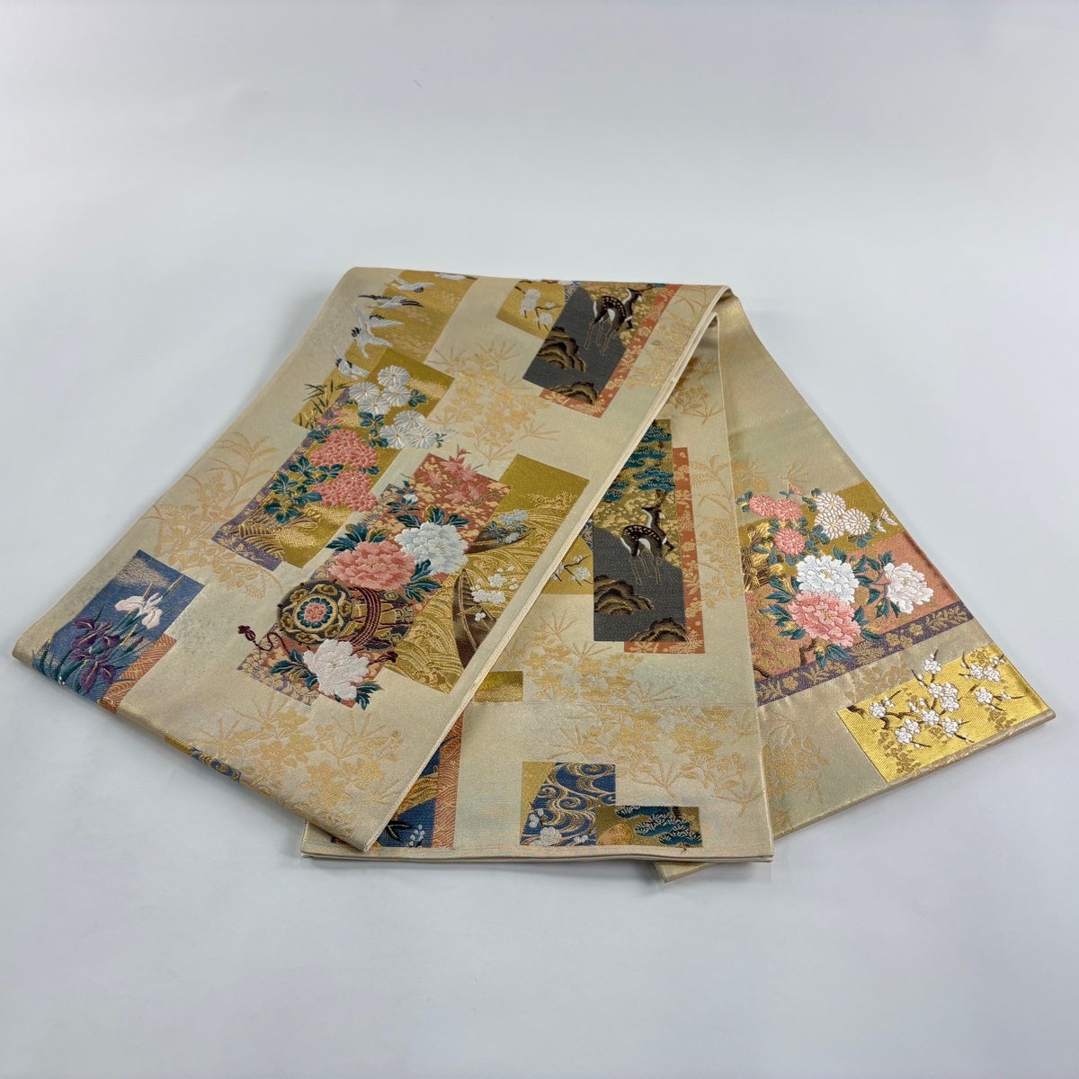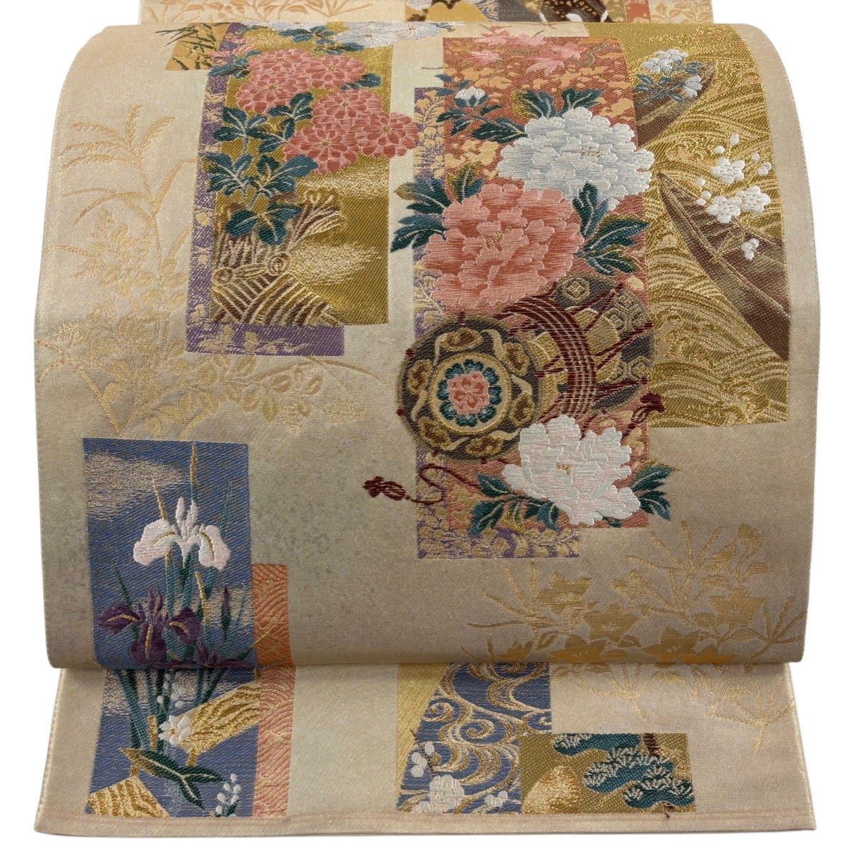 袋帯 秀品 雪輪 草花 金糸 刺繍 ベージュ 六通 正絹