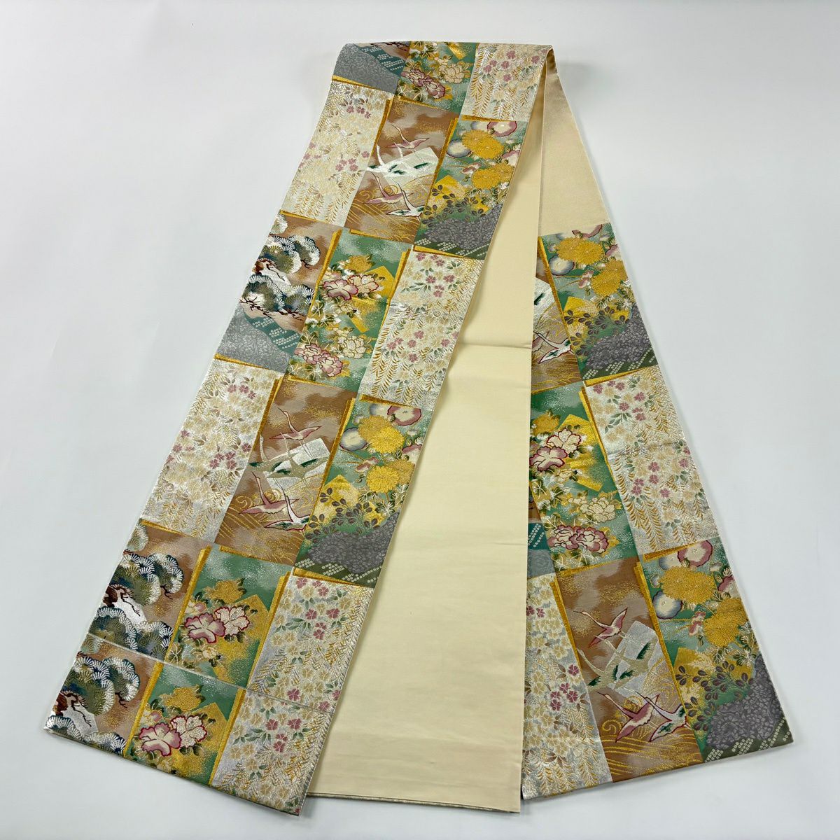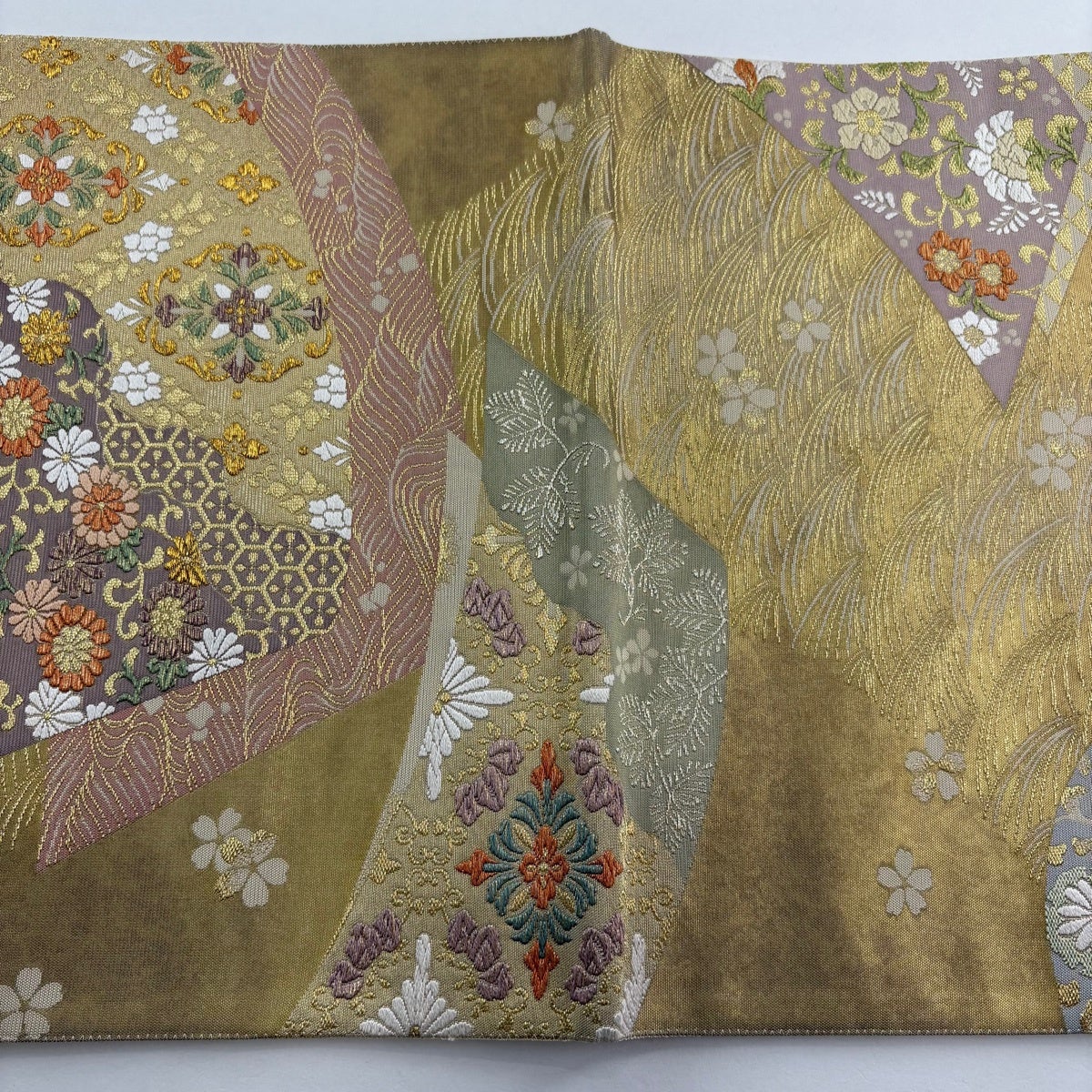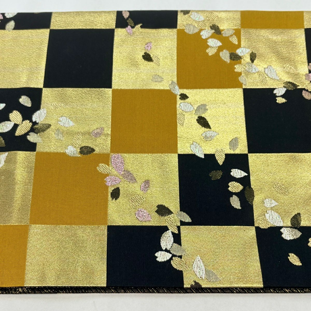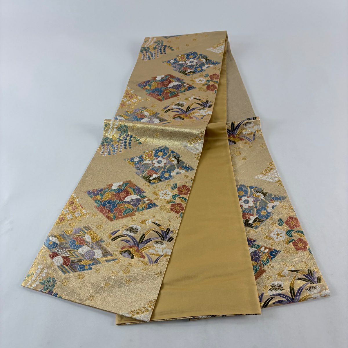 袋帯 秀品 面総柄全通 市松 花びら 金糸 箔 金色 全通 正絹