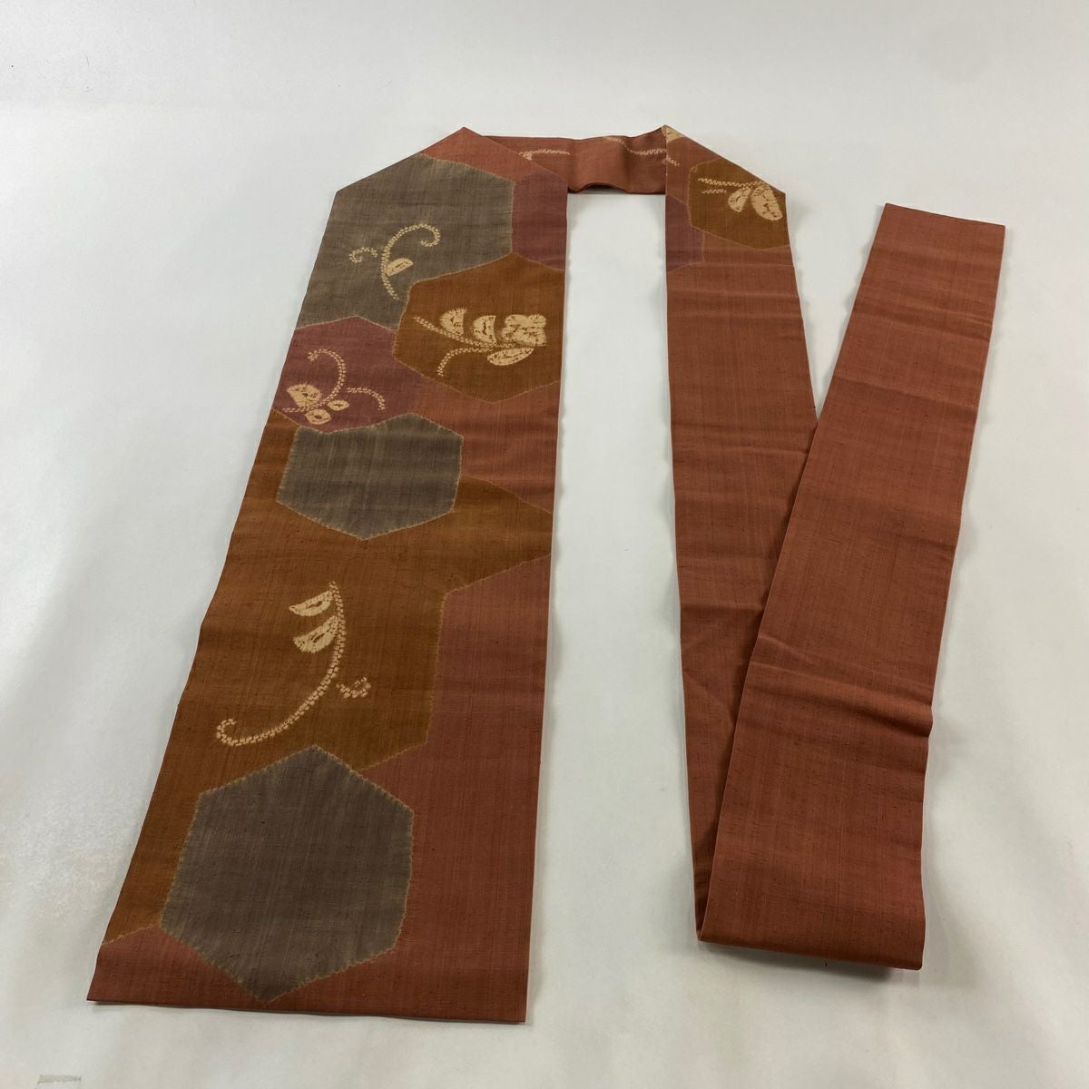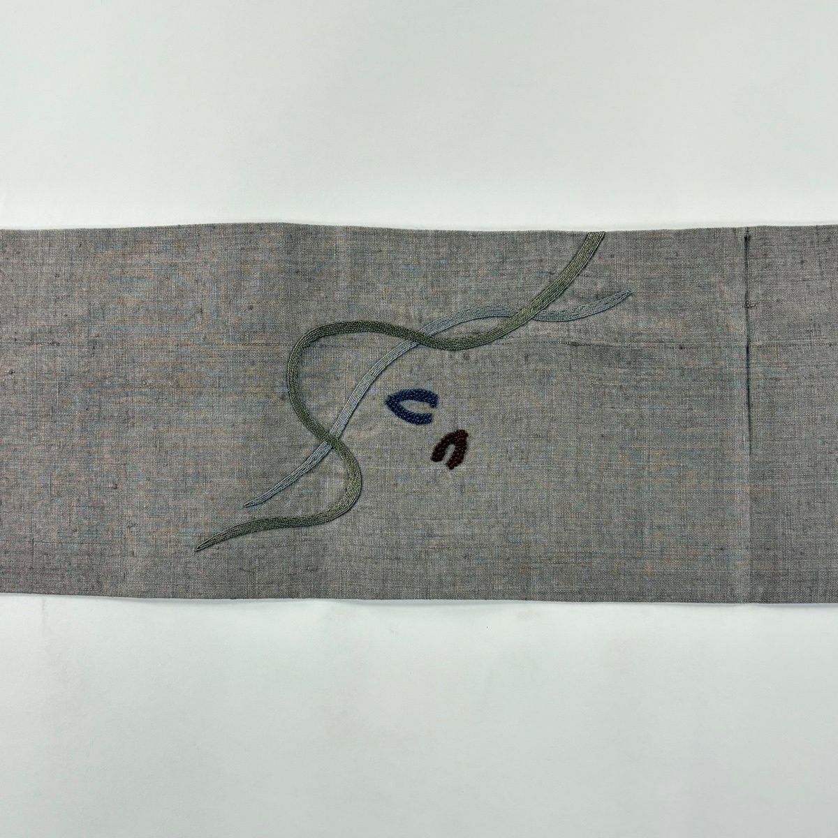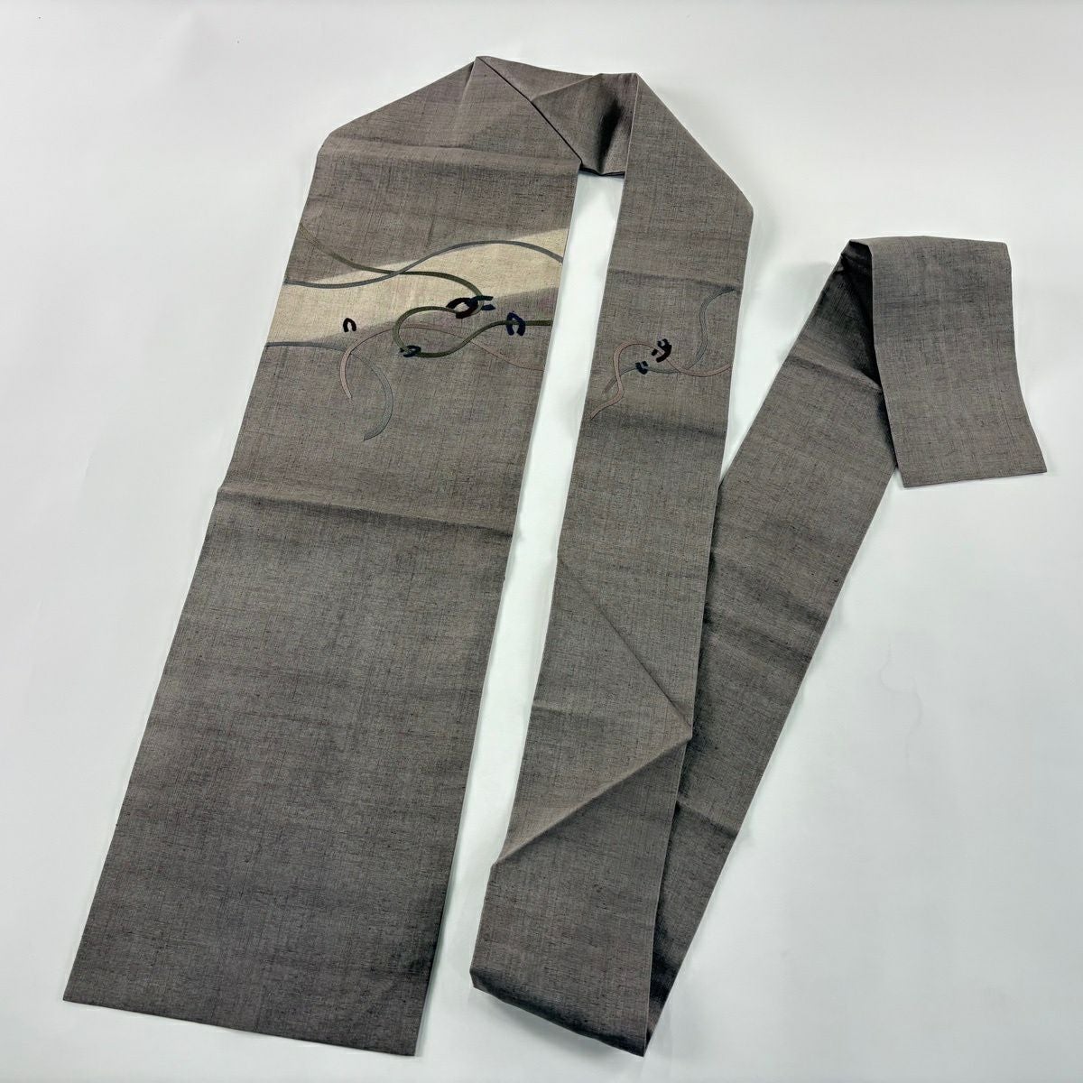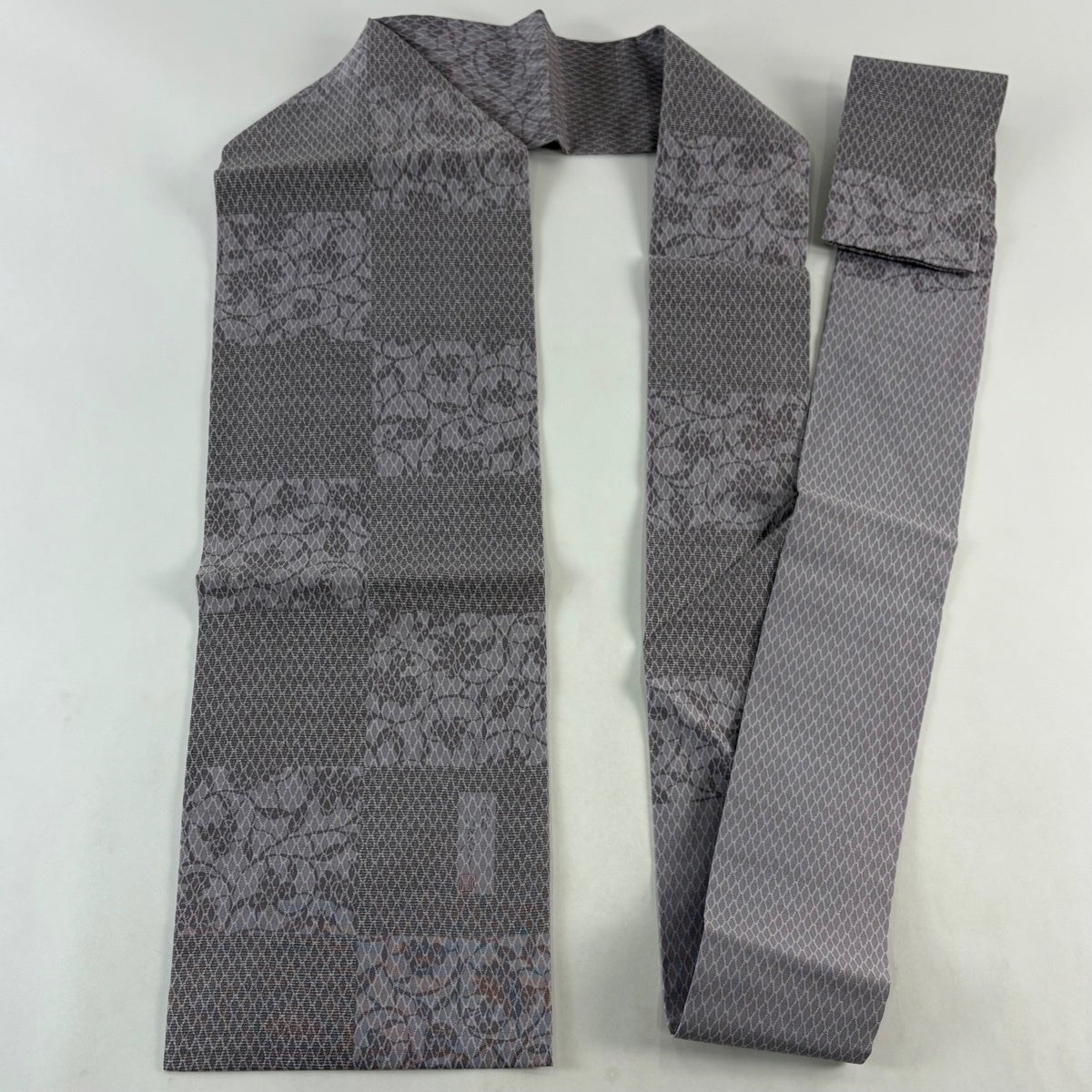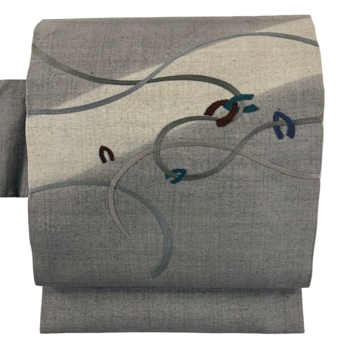 【美品】 名古屋帯 秀品 紬地 幾何学模様 刺繍 灰色 正絹
