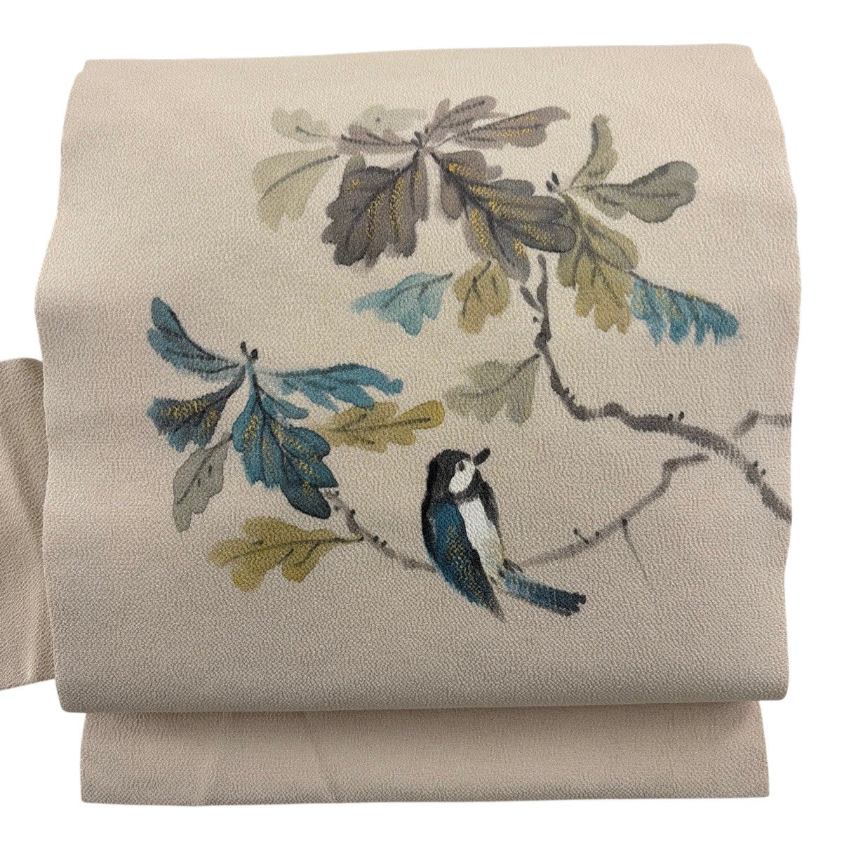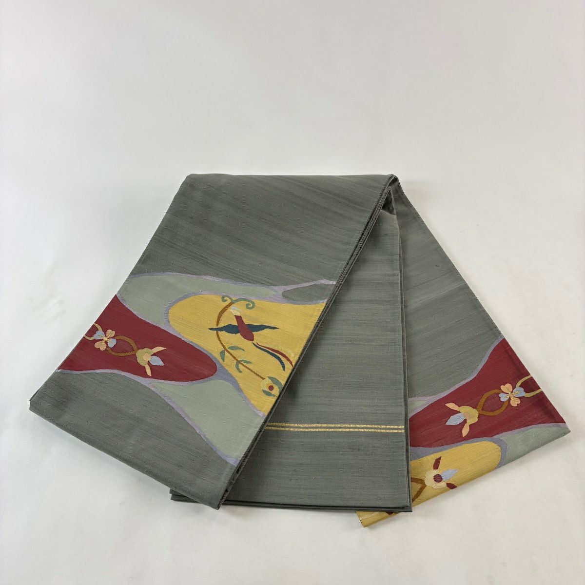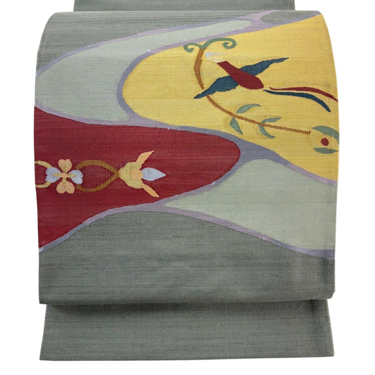 袋帯 秀品 紬地 花喰い鳥 草花 金糸 灰緑 お太鼓柄 正絹