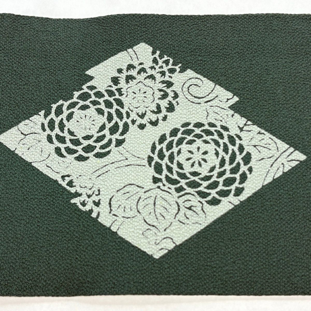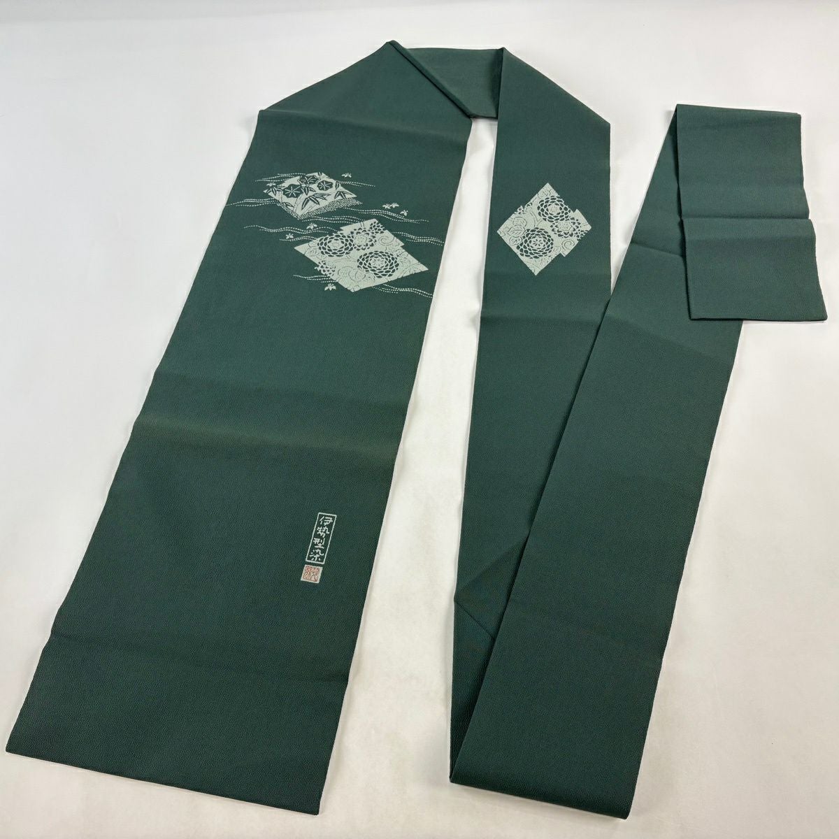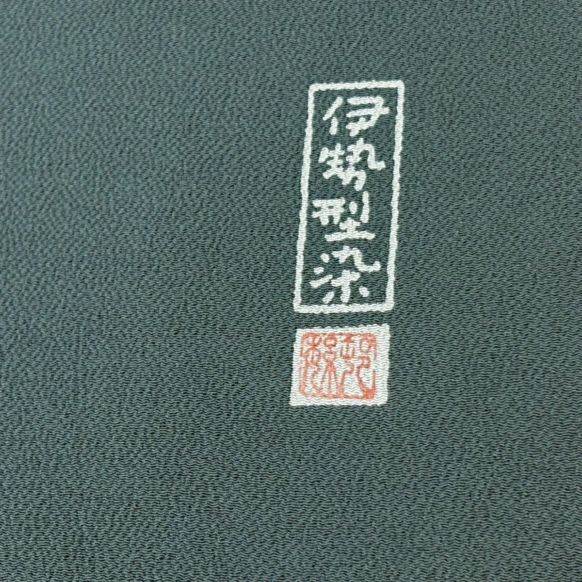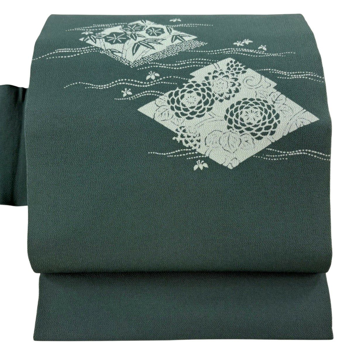 名古屋帯 秀品 落款あり 伊勢型染 菊 笹 縮緬 灰緑 正絹