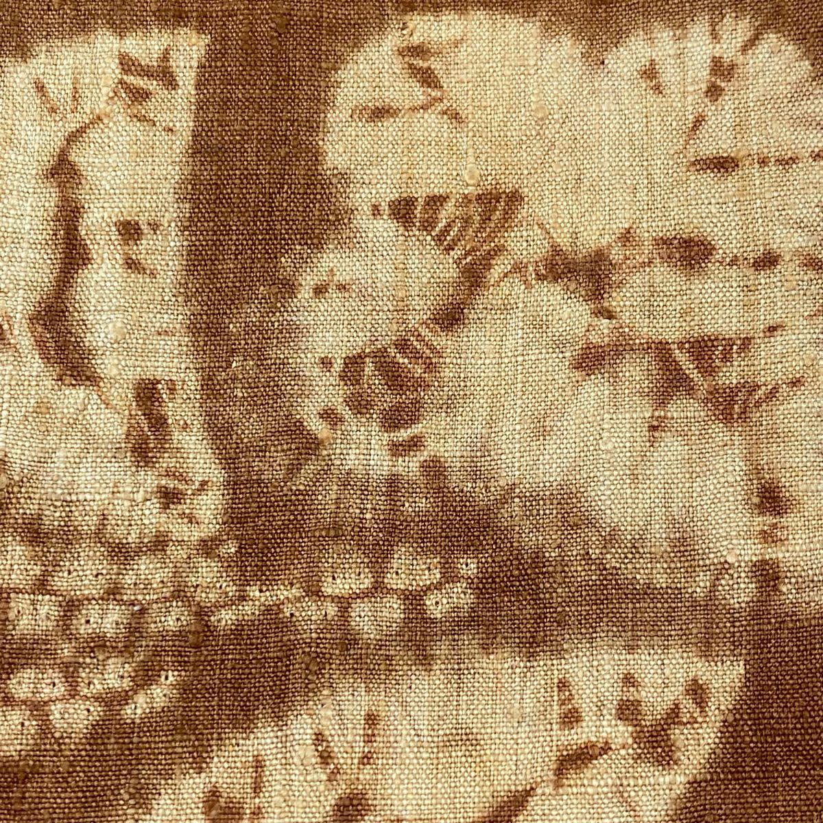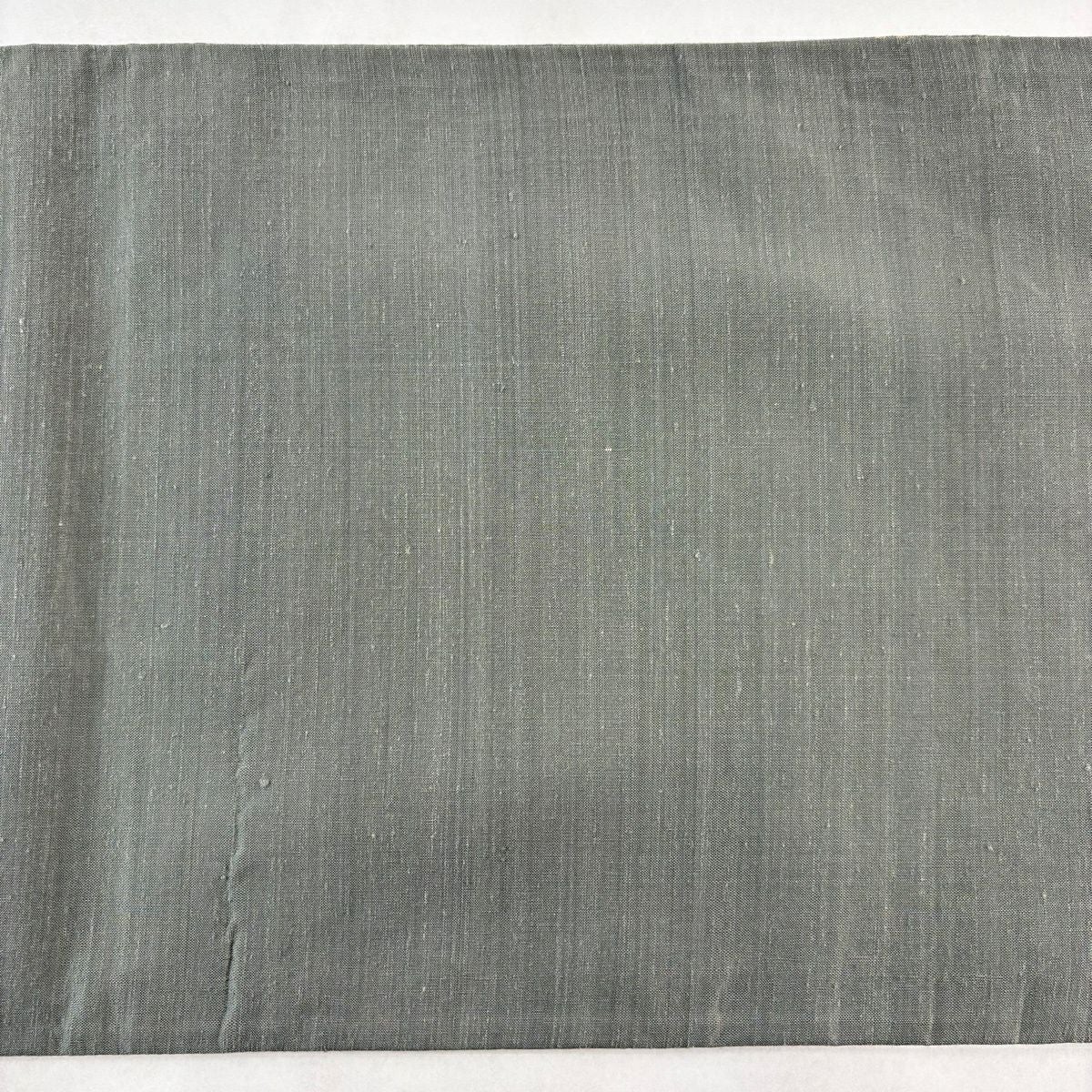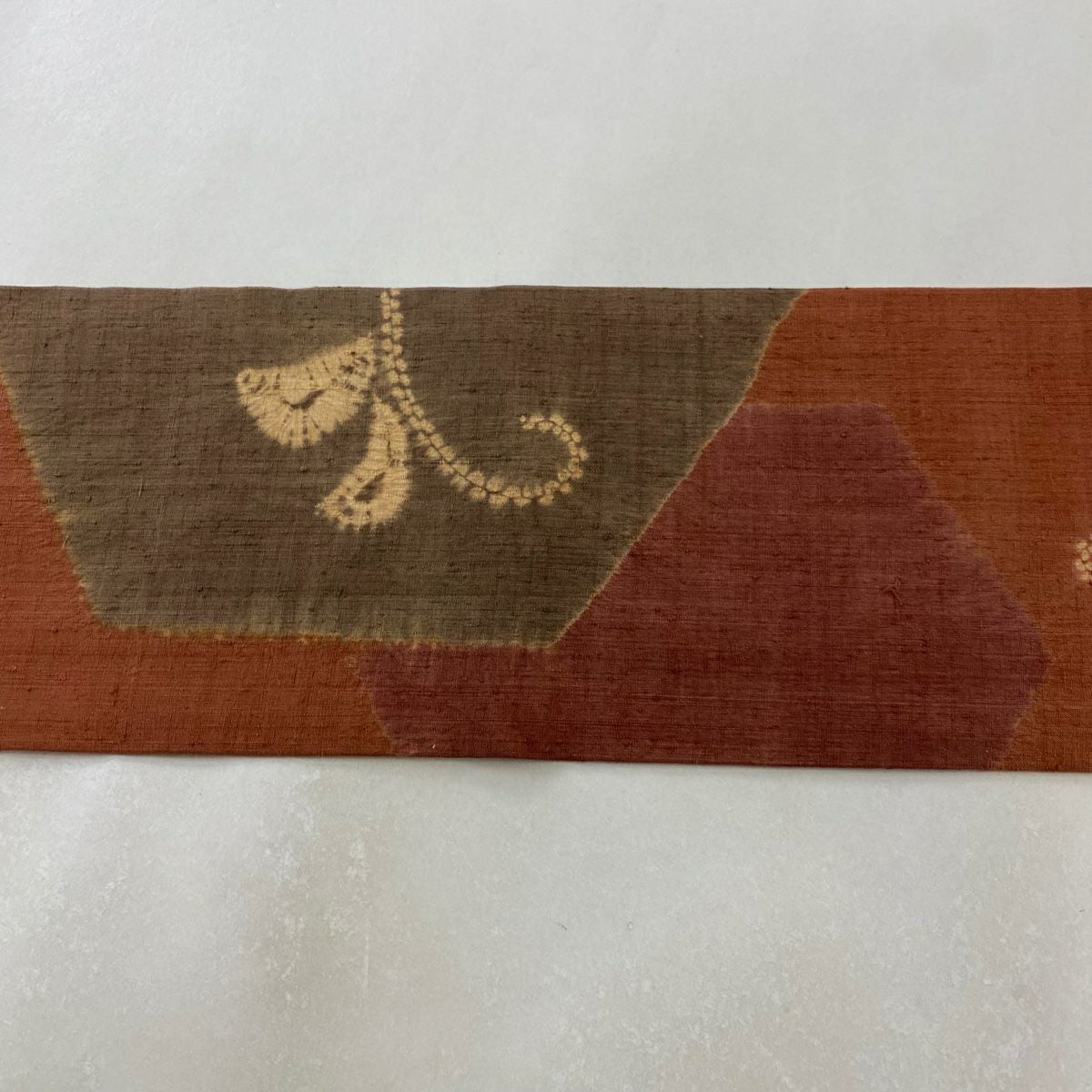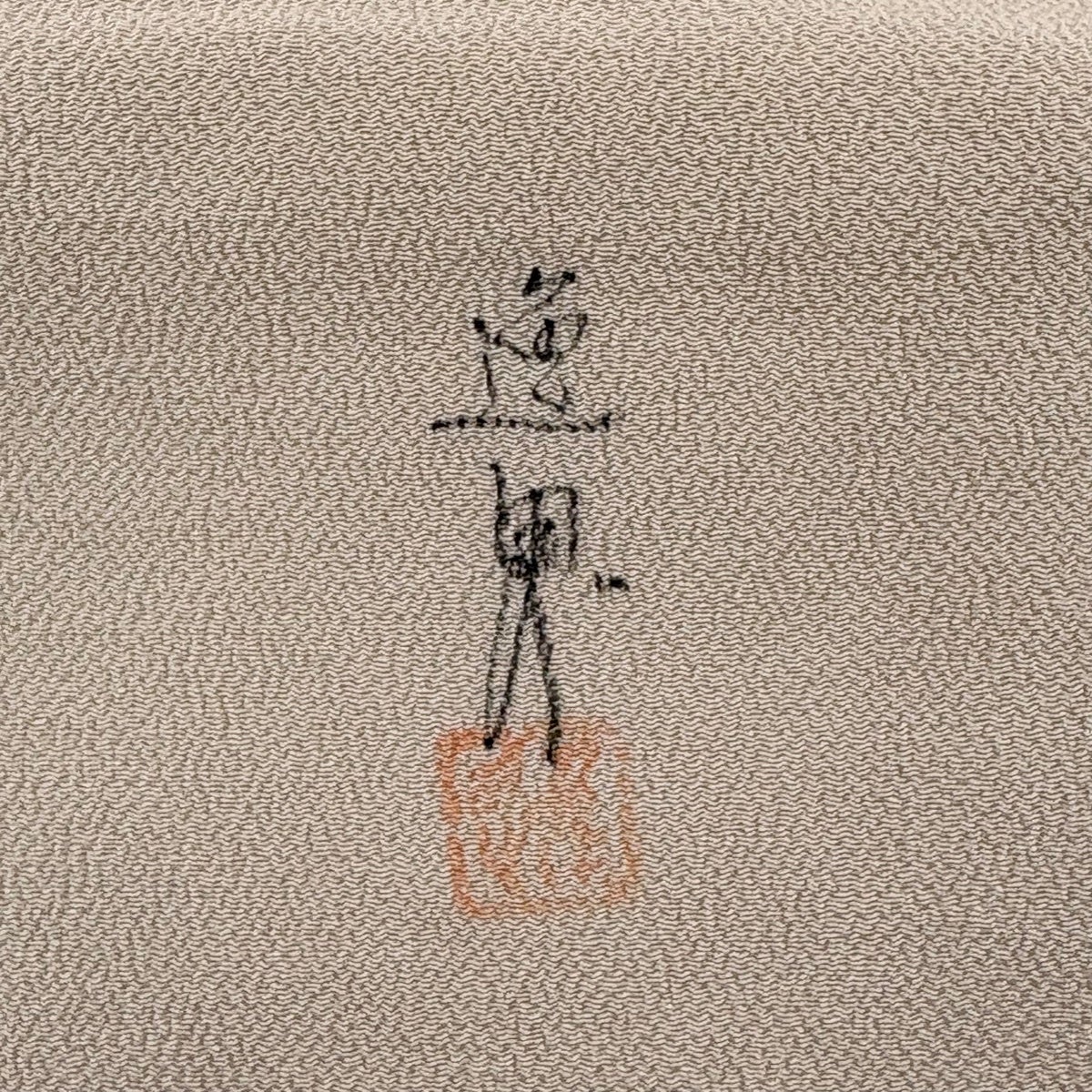 名古屋帯 秀品 落款あり 伊勢型染 菊 笹 縮緬 灰緑 正絹