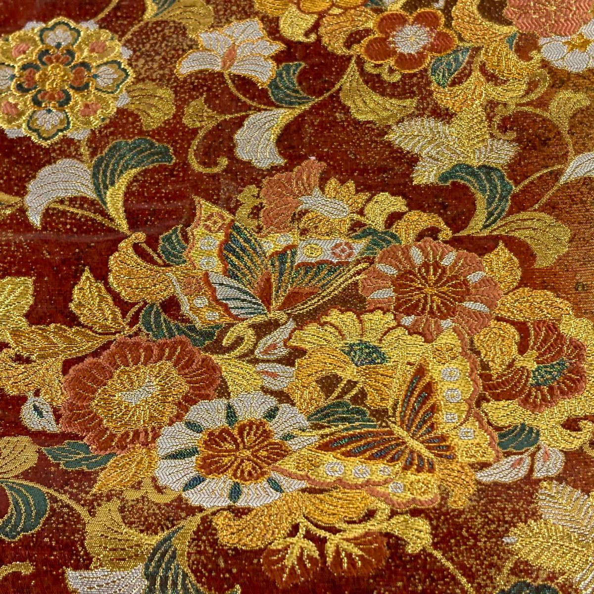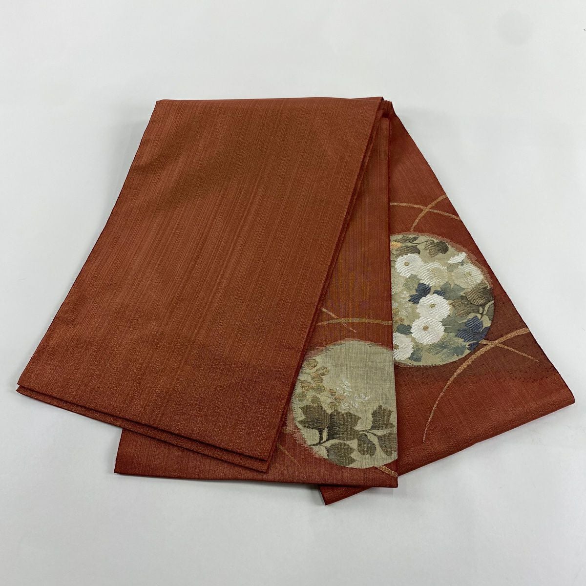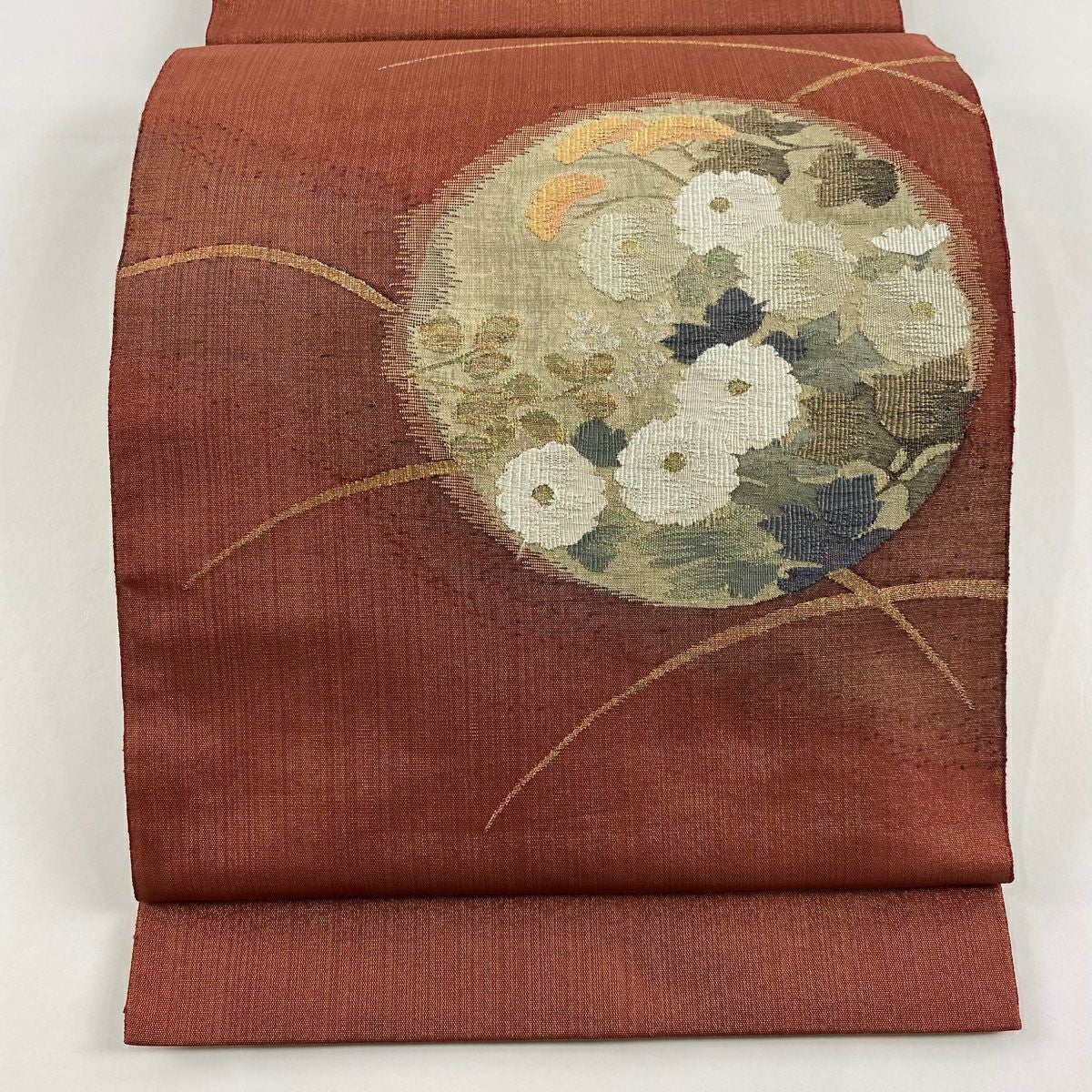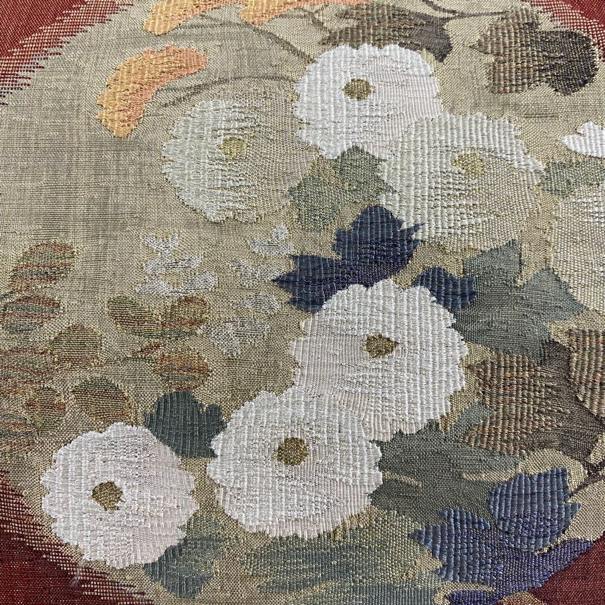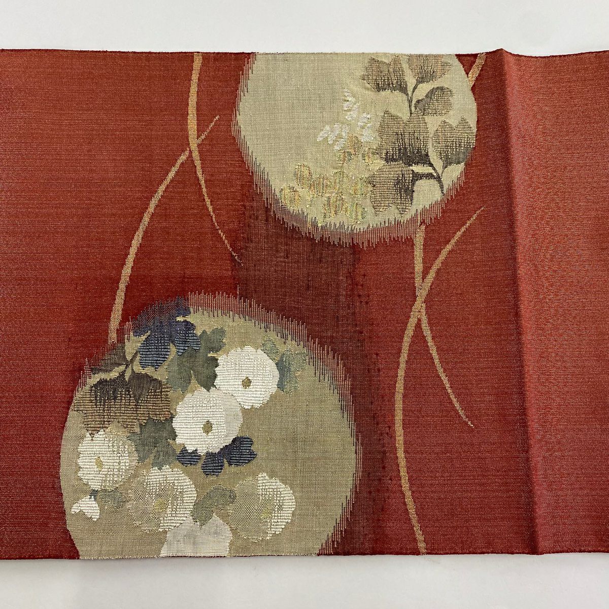 【美品】 袋名古屋帯 秀品 花丸文 菊 箔 唐織 茜色 正絹